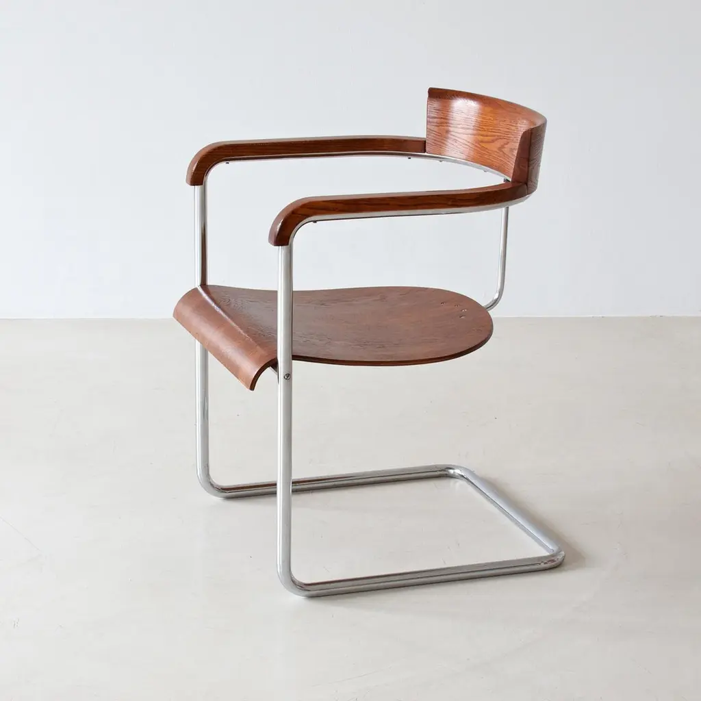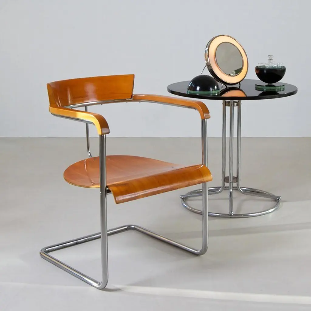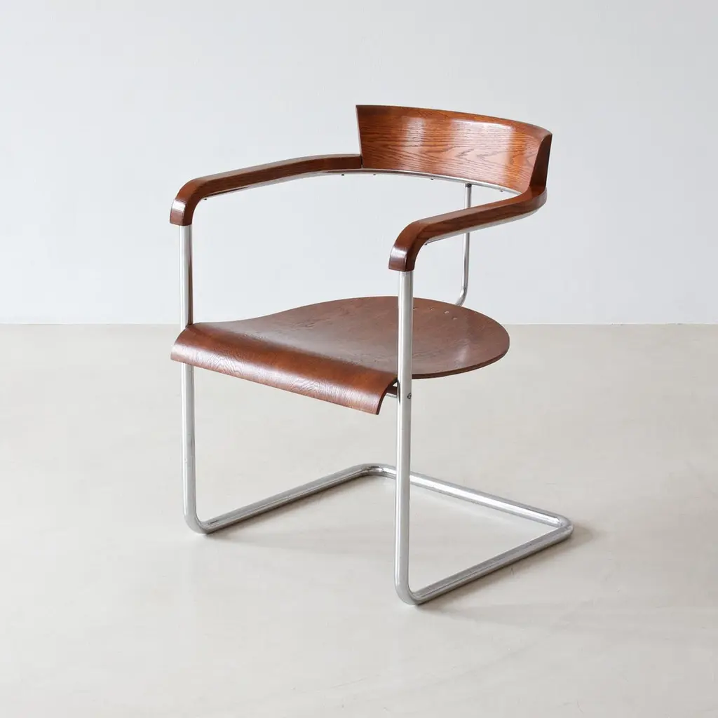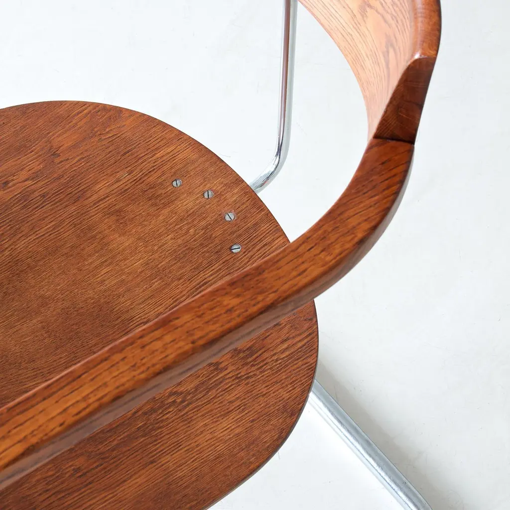 Modernist Cantilever Armchair By Jindrich Halabala, Chromed Metal, Veneered Wood