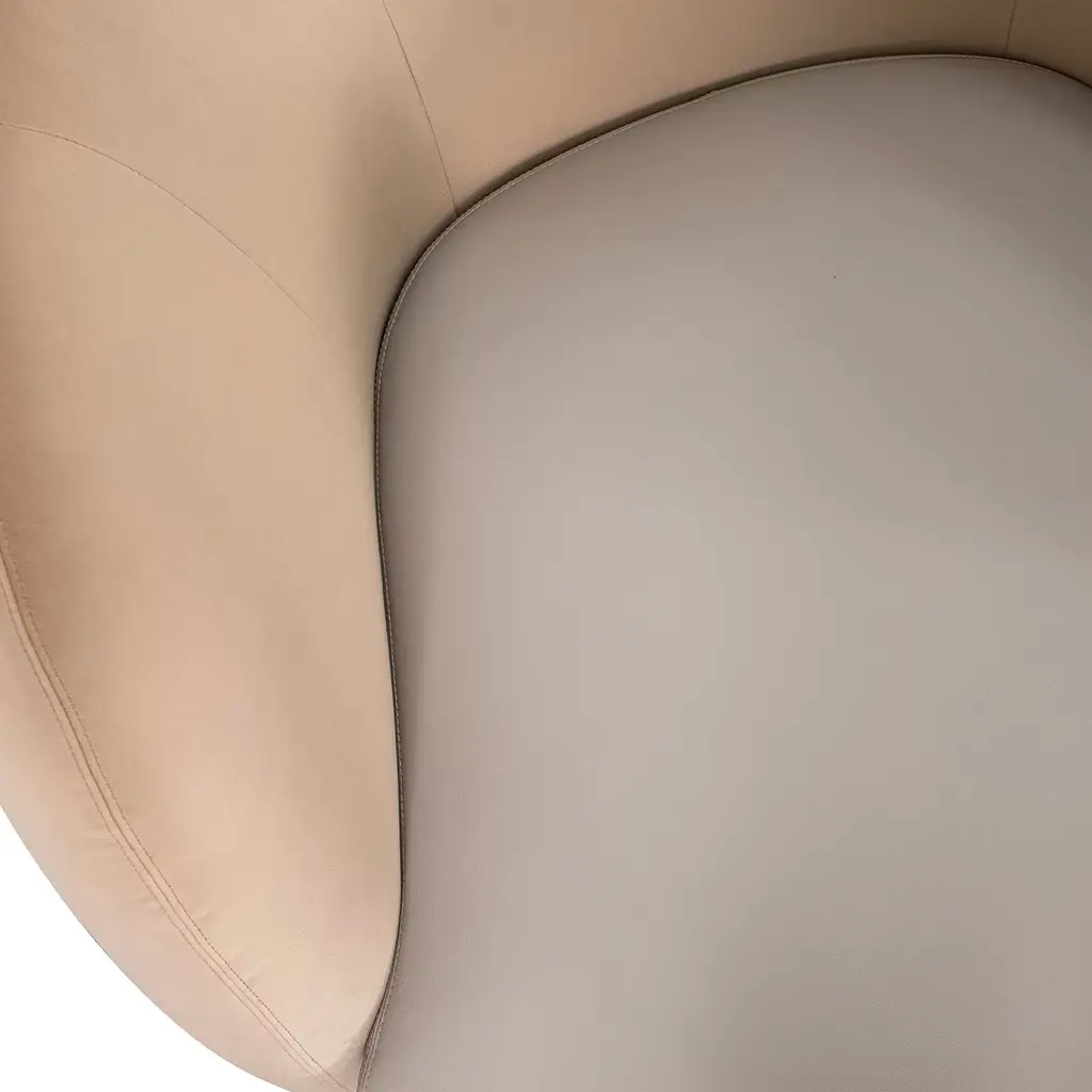 A polished and streamlined design, this armchair is distinguished by an exceptionally comfortable and welcoming silhouette with a soft, curved backrest and shelter-style arms. The satin champagne gold-finished metal base is topped with a vertically stitched, leather upholstered element, supporting the smooth, cream-white leather seat. The backrest and arms are upholstered with golden velvet. Customizable upon request, please ask the Concierge for details and option.