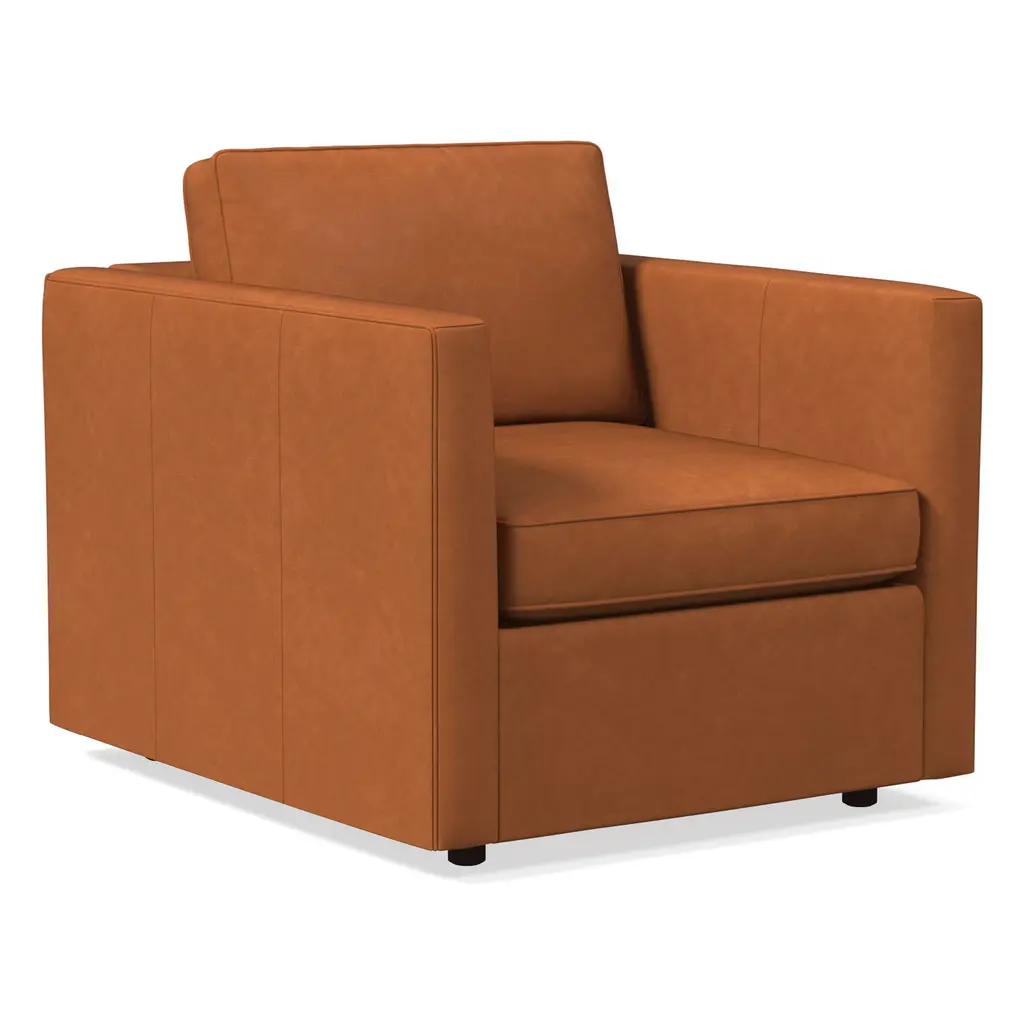MORABO Armchair - Grann/Bomstad golden brown/metal. The contact surfaces are covered with GRANN – a soft, smooth and strong grain leather with natural variations. Other surfaces have BOMSTAD, a coated fabric that has a similar look and feel to leather.