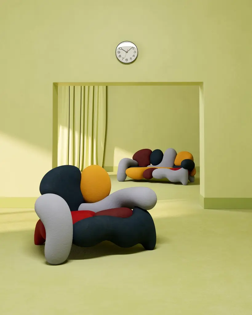 The Morphologica armchair and sofa manifest the need to rethink what it means to be radical. Designed by Misha Kahn in 2024 for Meritalia.The Morphologica armchair and sofa, born from the collaboration between Meritalia and the groundbreaking designer Misha Kahn, are made of an assemblage of modules – 12 for the sofa and 8 for the armchair – of sculpted polyurethane foam upholstered with bouclé wool fabric. The colour possibilities are endless, matches the multifariousness of the new Meritalia’s pop-modernity. A solid metal structure allows for the roller coasters of foam to swirl, enmesh and expand, resulting in an experimental, sexy more than playful, and almost ‘shocking couch’, as Kahn himself defined it.Composition: 97% Virgin Wool, 3% ElastanePerformance: Durability 45.000 Martindale (EN ISO 12947-2)Care & Maintenance: Upholstery not removableWarning: Please be aware that the colour shades shown can appear different from the real fabric colours. It is advised to request actual fabric samples before ordering.Care & MaintenanceIn case of stain act promptly dabbing the surface gently without damaging it. The lack of timeliness in the action makes cleaning less effective, resulting in the permanence of marks. Light colour fabrics should not be put in contact with coloured textiles with unbound dyes since colour pigments could penetrate coated fabric’s surface without being able to be removed.In case of slight stains, wipe the surface with a damp cloth or a mild detergent and rinse with water.For localized and stubborn stains (oil, grease, cosmetics, coffee, liqueurs, chewing-gum) it is advisable to follow the following instructions: promptly dissolve the stain with diluted ethyl alcohol (colorless liquid) in 20% water, dab and then treat with a solution of mild detergent, rinse well.PackagingPackaging in cardboard box included.Packaging in cage to quote by volume.Packaging in wooden crate to quote by volume.Additional information:Material: Bouclé WoolColor: WineDimensions: Sofa: W 224 x D 109 x H 95 cm, Seat height: 42 cmArmchair: W 138 x D 109 x H 95 cm, Seat height: 42 cmCode: MRP225 (Sofa) & MRP140 (Armchair)Available in other color options: Cream, Iowa, Kansas, Minnesota, Missouri & MustardAvailable in other variant options: Armchair & Sofa