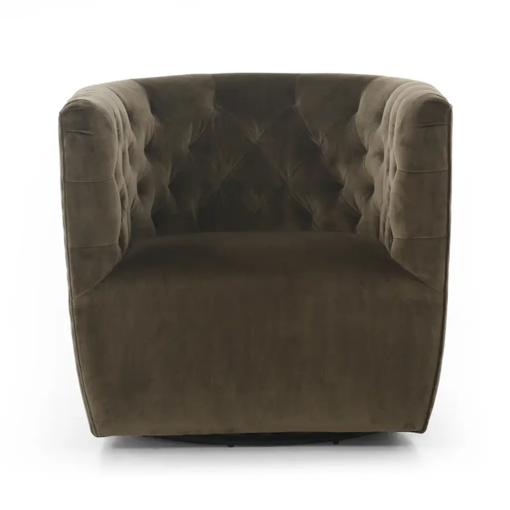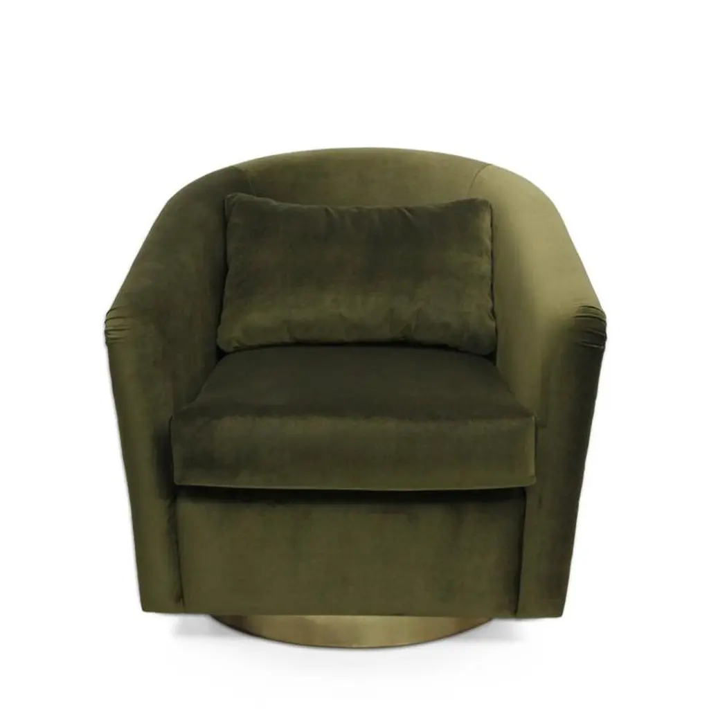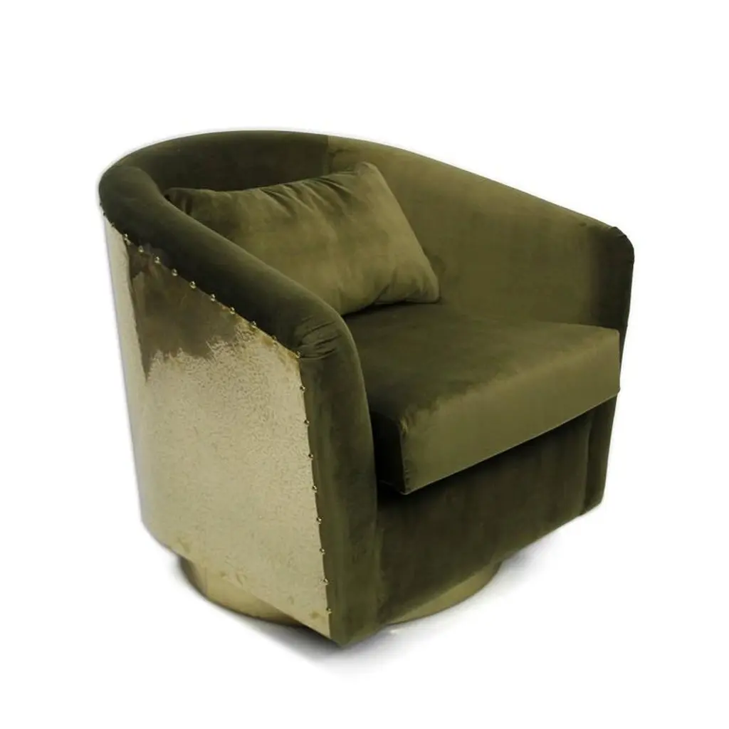 Armchair natural green in green velvet in rotative base.Base and back are in high gloss hammered brass. Nailsare golden polished.