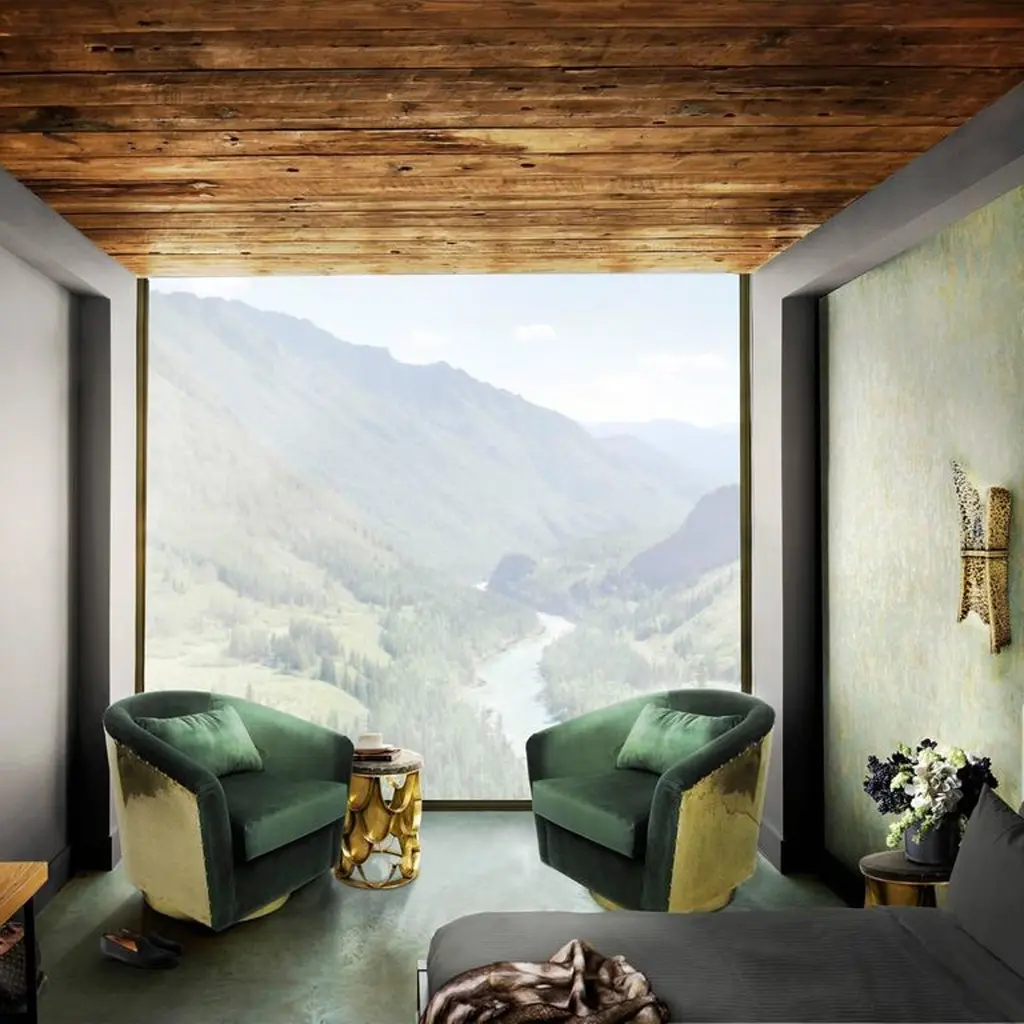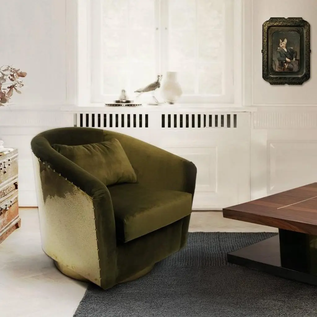Natural Green Armchair In Velvet With High Gloss Hammered Brass Back