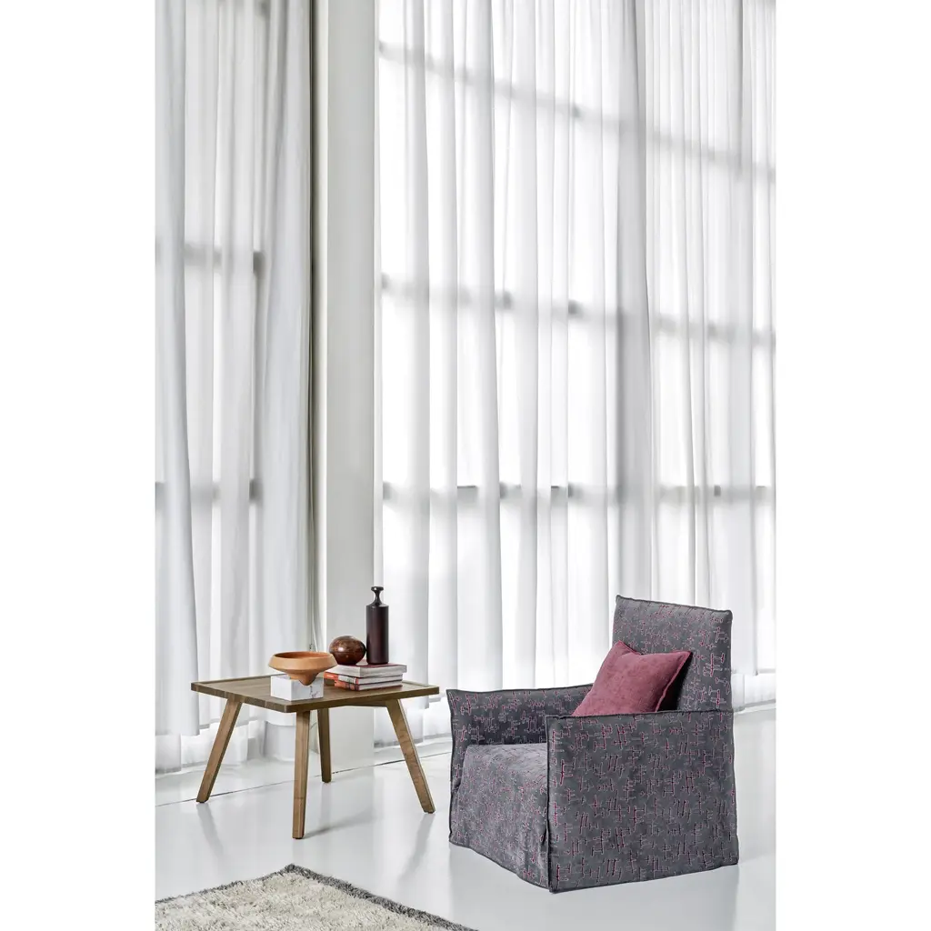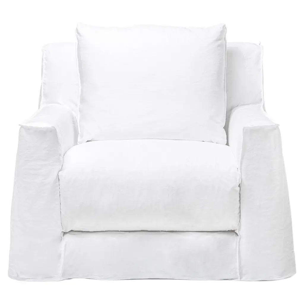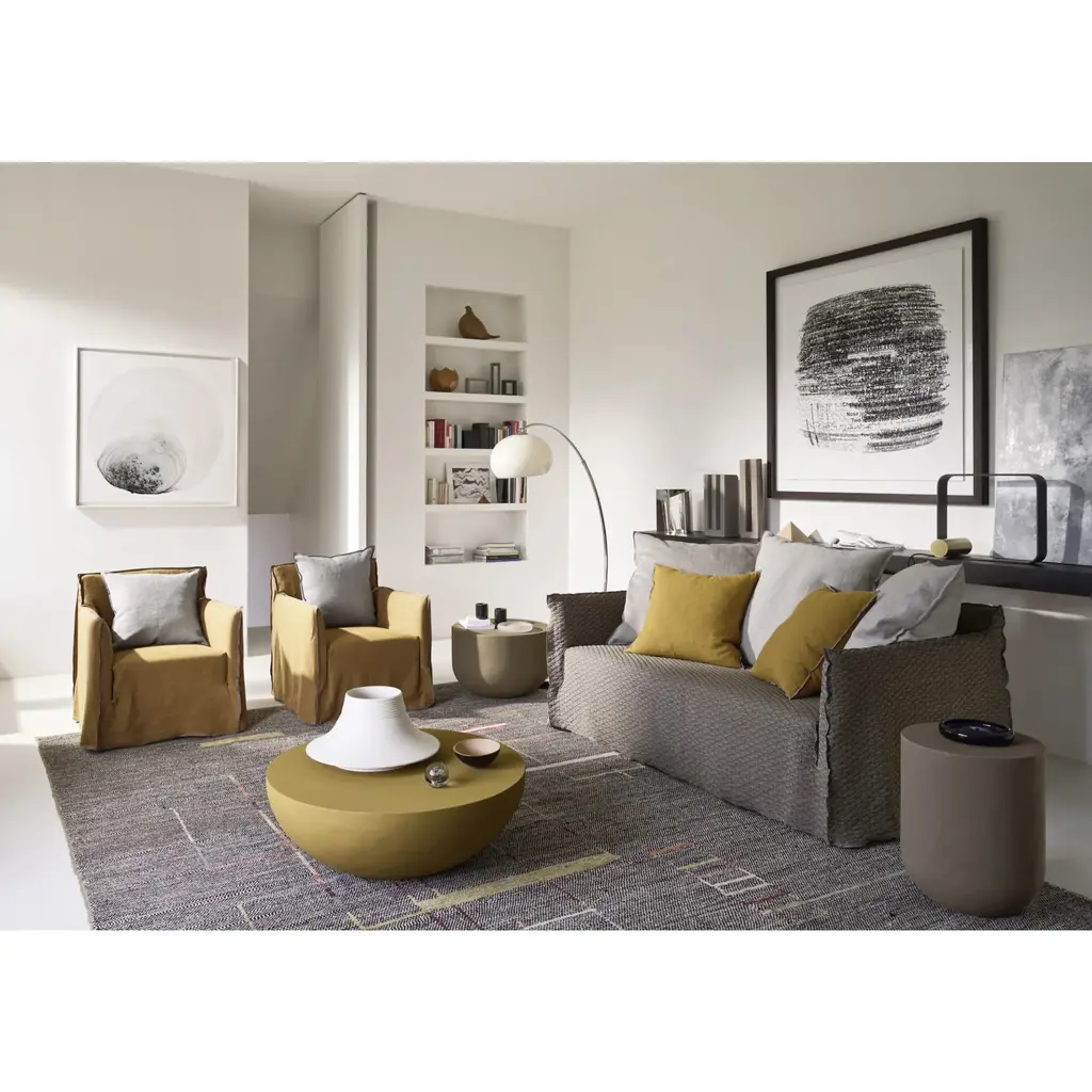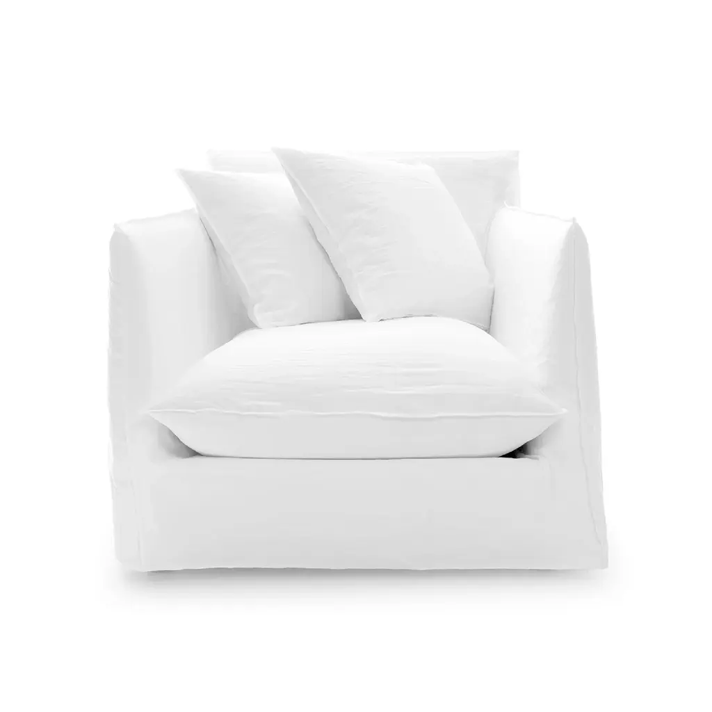 Introducing the Ghost Natural White Lino Armchair by Gervasoni. Available with varying backrest heights and seat sizes, this armchair adapts to your style and needs, featuring a minimalist aesthetic that complements any interior. Padded with soft polyurethane foam and mixed down cushions, it offers a cozy, inviting feel. The standout feature is its removable cover, allowing you to effortlessly switch between an elegant and casual look in no time.
