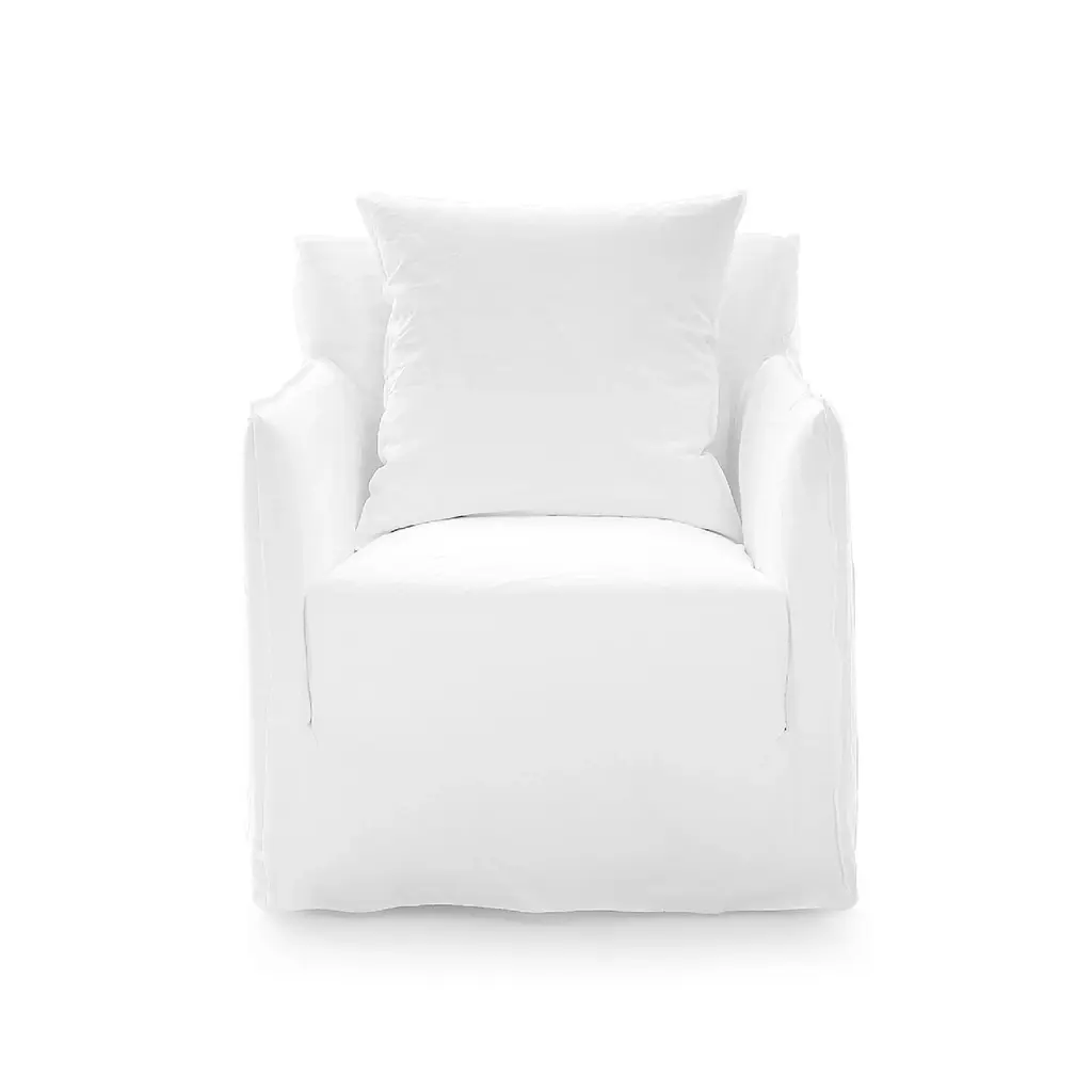 Introducing the Ghost Natural White Lino Armchair by Gervasoni. Available with varying backrest heights and seat sizes, this armchair adapts to your style and needs, featuring a minimalist aesthetic that complements any interior. Padded with soft polyurethane foam and mixed down cushions, it offers a cozy, inviting feel. The standout feature is its removable cover, allowing you to effortlessly switch between an elegant and casual look in no time.