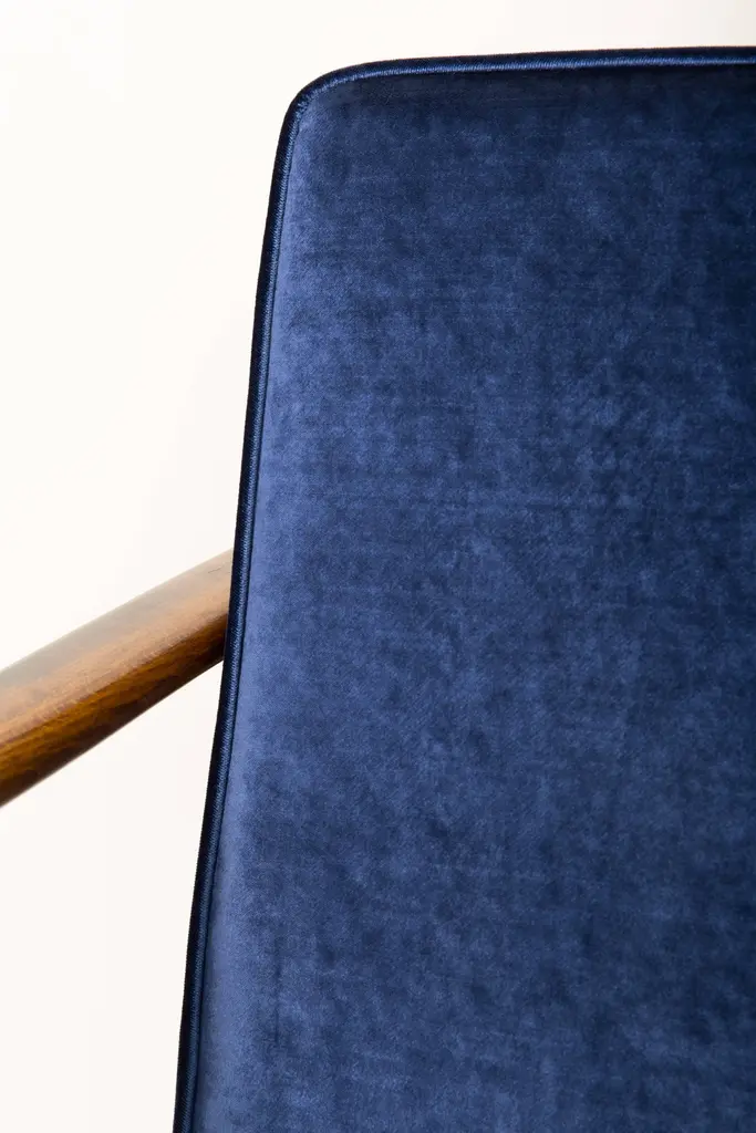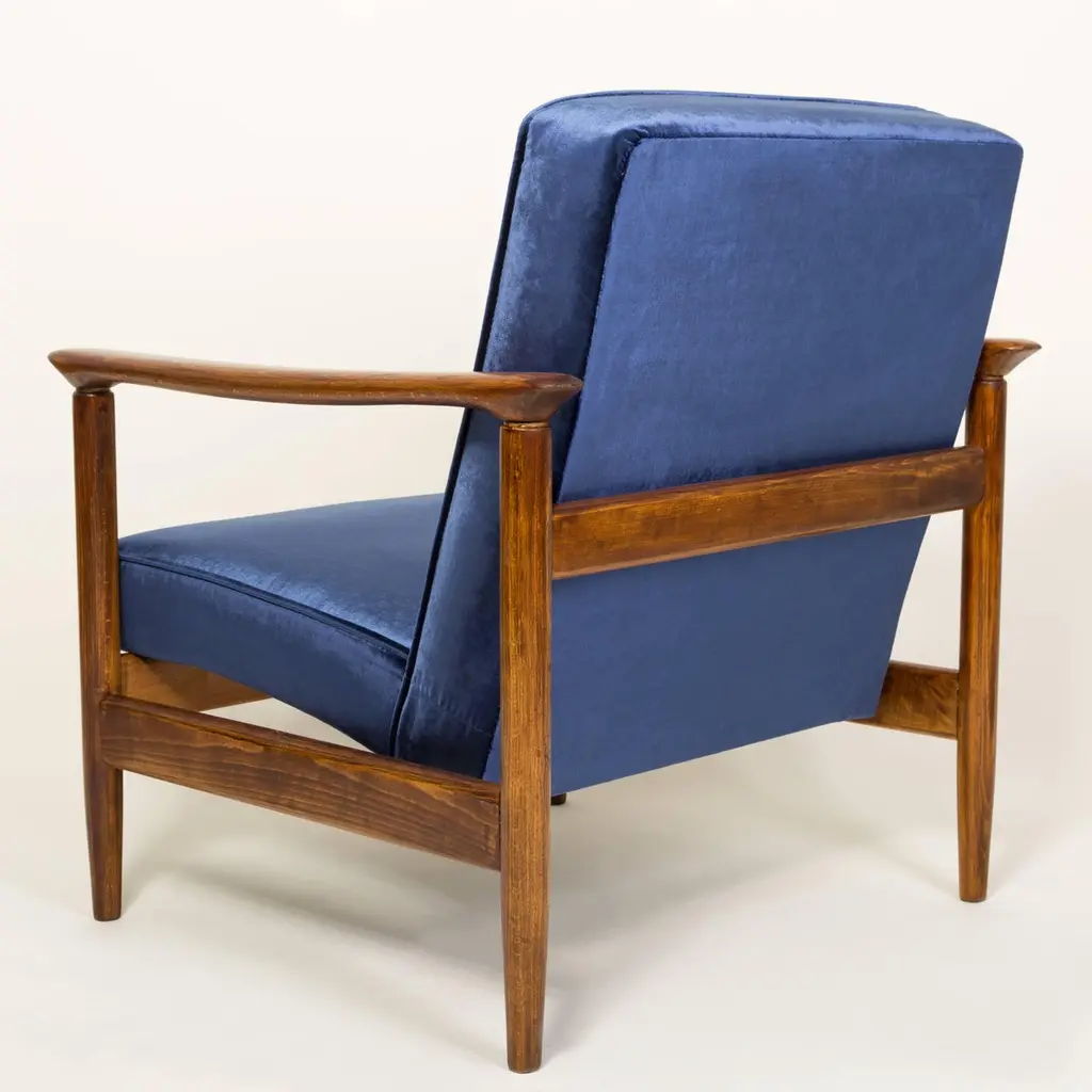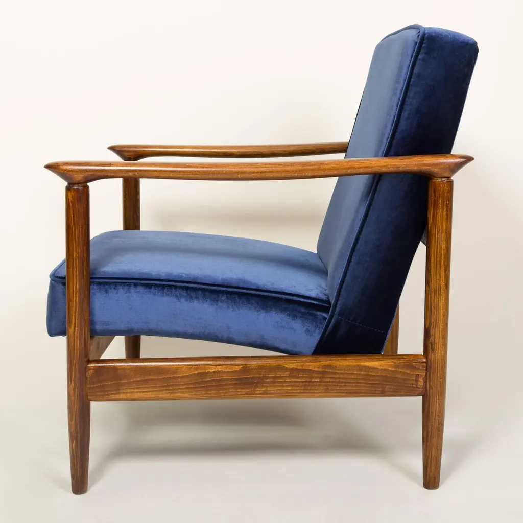 Beautiful armchair model GFM-142, designed by Edmund Homa. The armchair was made in the 1960s in the Gosciecinska Furniture Factory. Frame is made from solid beech wood. The GFM-142 armchair is regarded one of the best Polish armchair design from the previous age. The armchair have been thoroughly renovated. The tension belts have been changed, new upholstery foams - upholstery material has been used - dark blue velvet upholstery fabric of the highest quality. We can prepare also another color of wood and fabric. Ask for more information.