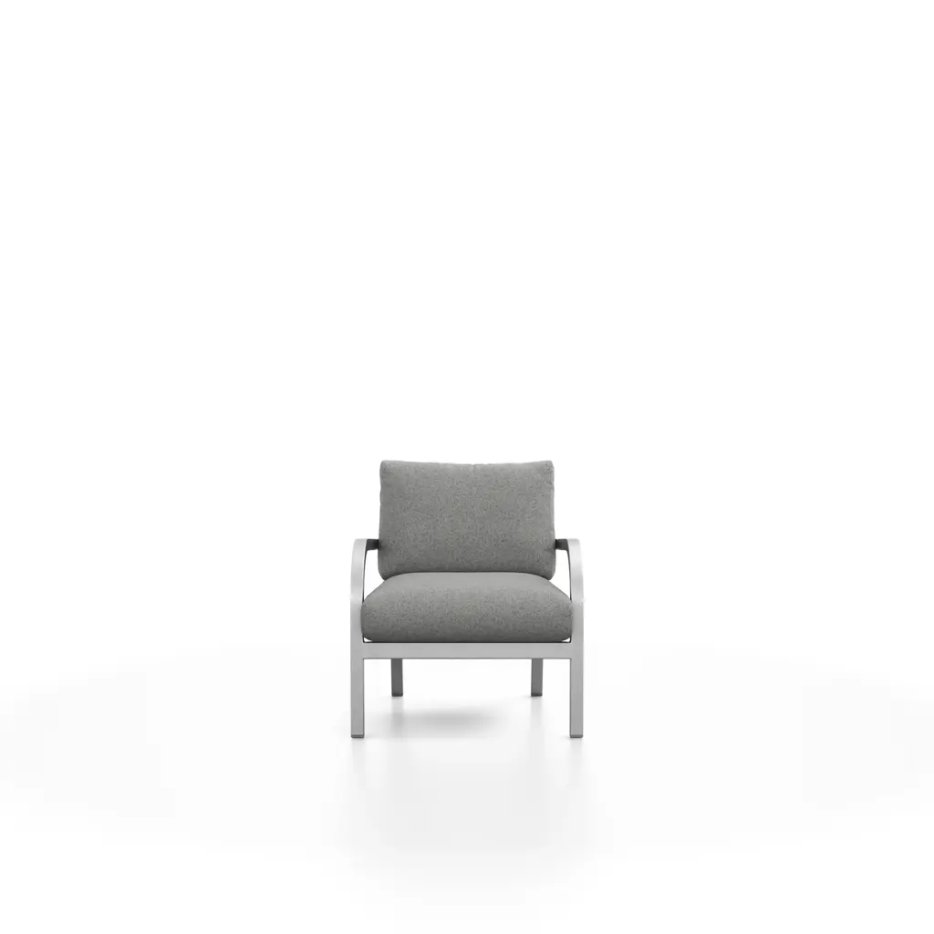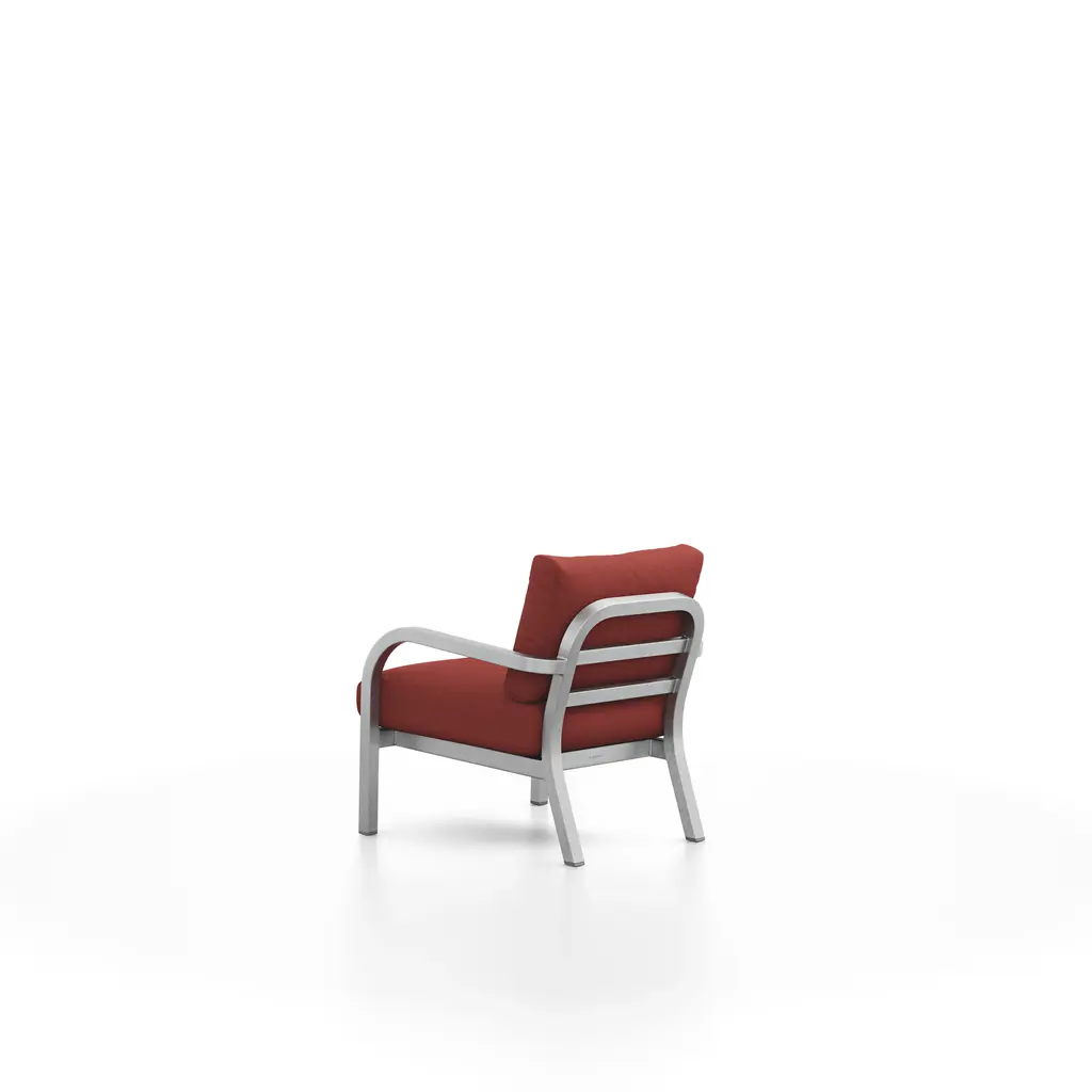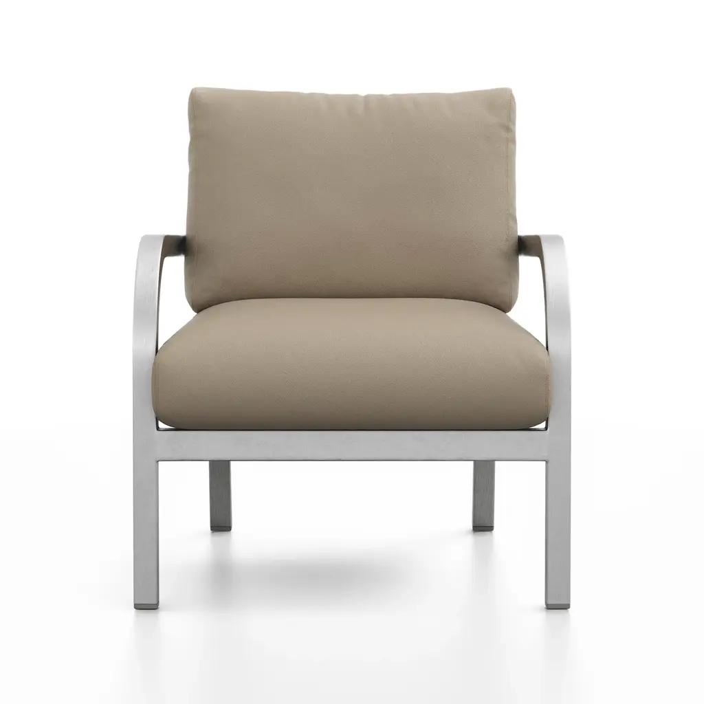 Navy Lounge by Jasper Morrison, 2025 Re-design of Emeco's classic 1940s sofa series, first made for the US Navy. Lightweight, yet extremely durable, lounge armchair for indoor and outdoor use, adaptable to a wide range of settings. The frame in recycled aluminum is handmade by Emeco's craftsmen in Hanover, Pennsylvania, following the same unique process of hand welding and heat treating used since 1944 that makes furniture so strong it comes with a lifetime warranty - in and out. The frame comes in Emeco's signature hand brushed finish with a clear powder coat, or in powder coat colors. Black and White Grey are standard options, Emeco's in-house range of colors also available at no up-charge, no MOQ. Contact us to place your order. Upholstery available in a range of leather, fabric and outdoor textiles. All cushions with Sunbrella Heritage cushion covers are outdoor approved. COM/COL also offered, subject to approval - please contact us to confirm suitability of custom textiles prior to order. Cushions are removable and attach to the frame with snaps and velcro for easy installation, replacement and removal, for storing when not in use. Optional arm caps in solid wood sold separately.