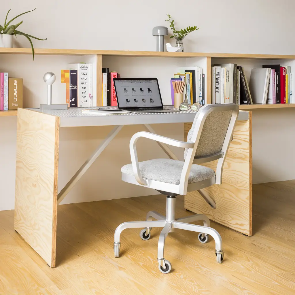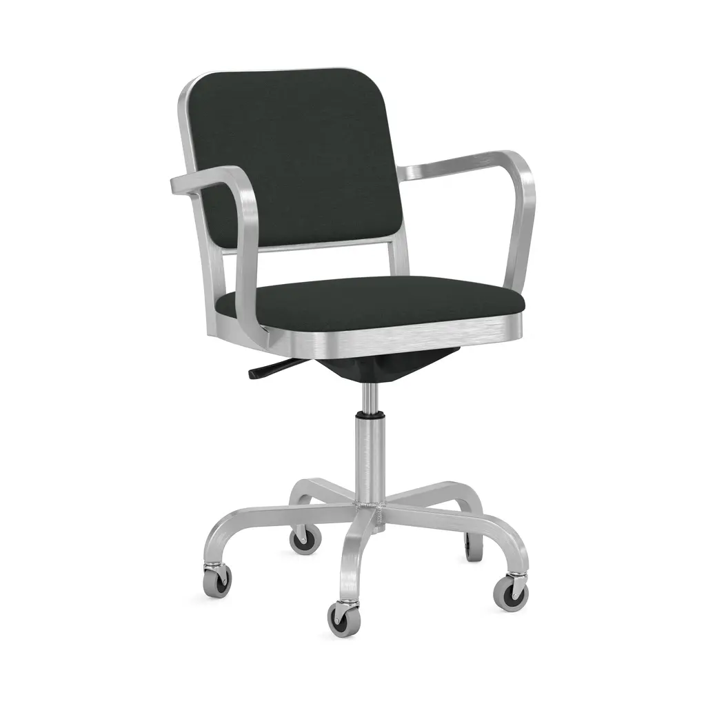 Jasper Morrison has given Emeco’s classic upholstered Navy Officer Collection a fresh, light and modern update. The Navy Officer Collection by Jasper Morrison features a chair, an armchair and swivel chairs, available in hand-brushed aluminum or a black powder coat finish. Upholstery is offered in a selection of Kvadrat and Maharam textiles and leathers. Features
