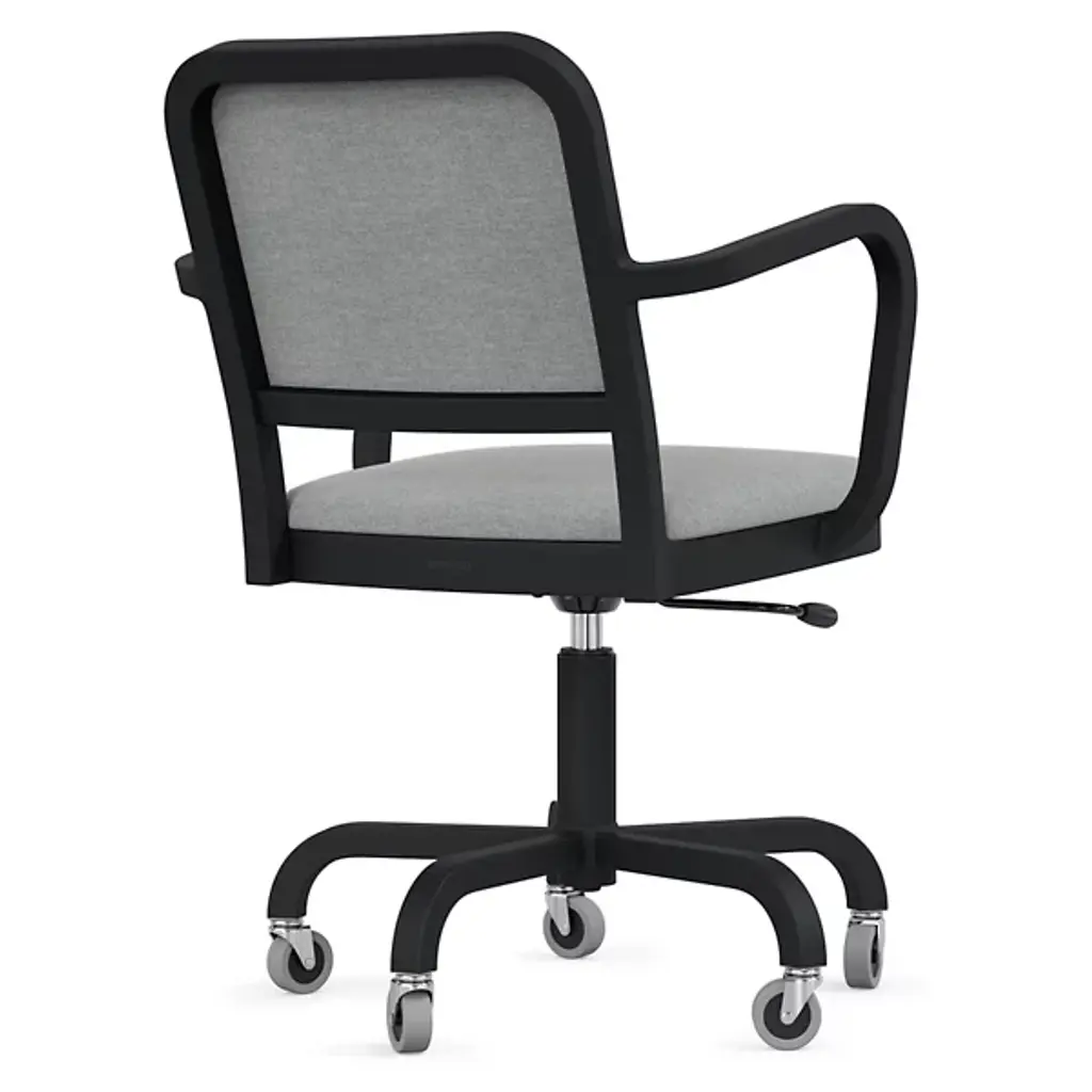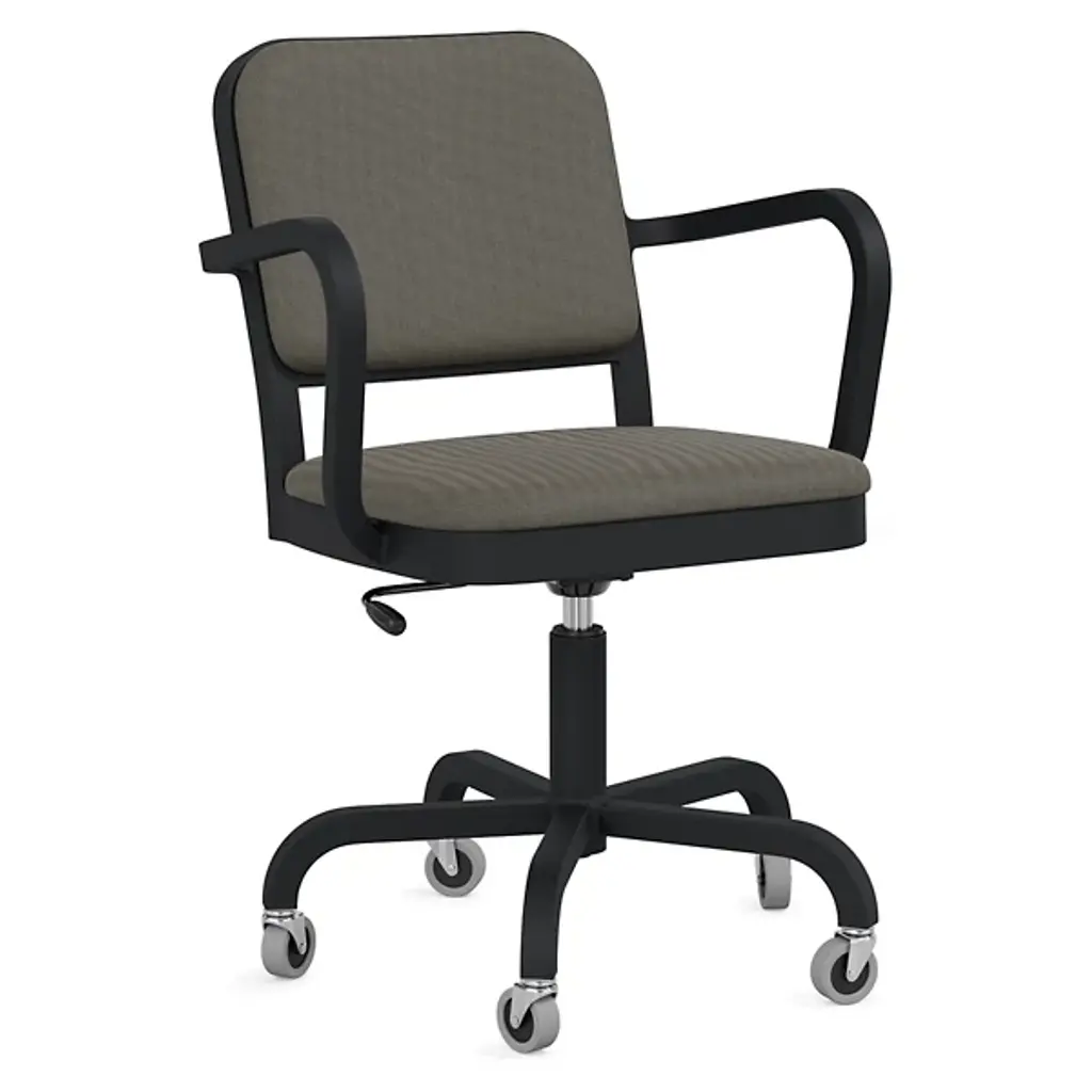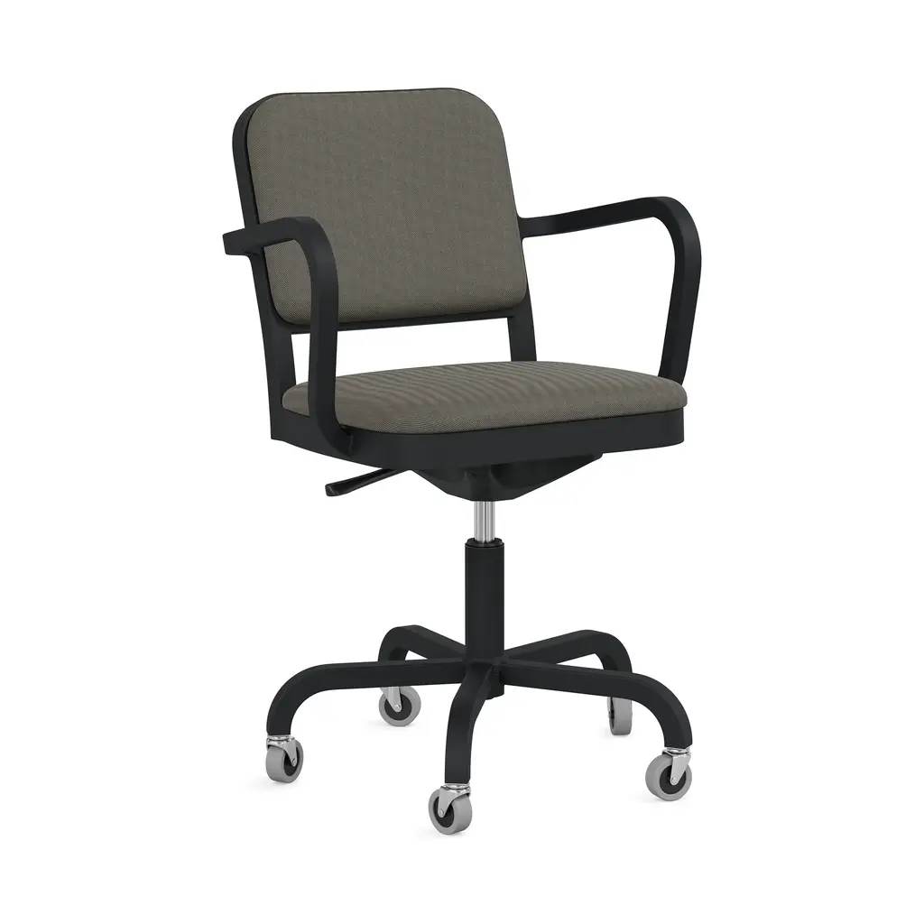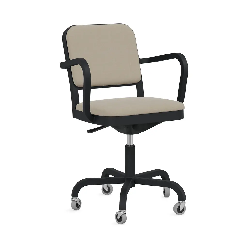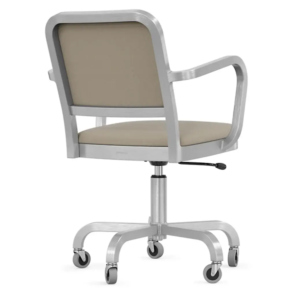 Inspired by the original US Navy design from 1944, The Navy Officer Swivel Armchair from Emeco has been enhanced by designer Jasper Morrison. Made in the USA and featuring an exclusive lifetime warranty on the aluminum frame, the comfortable upholstery and smooth swivel capability take it to another level. This attractive design furnishing will elevate the look of a home office or any sort of workspace with a retro-inspired aesthetic and mindful attention to detail.