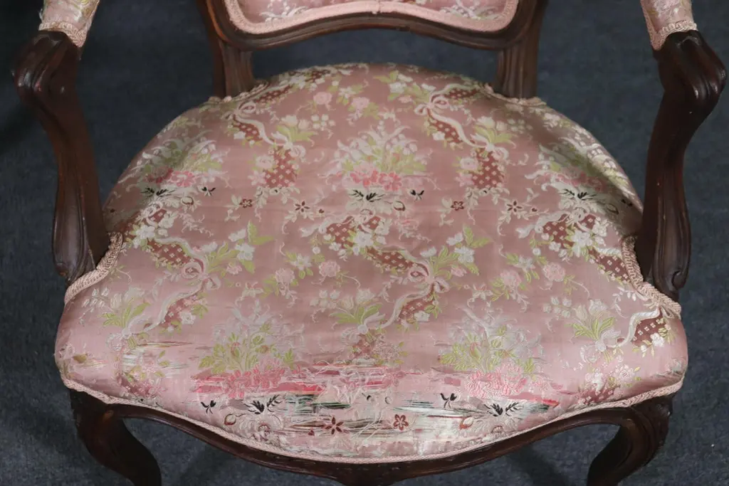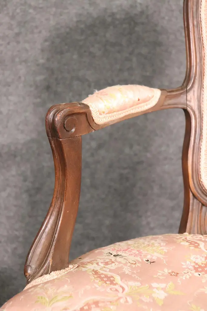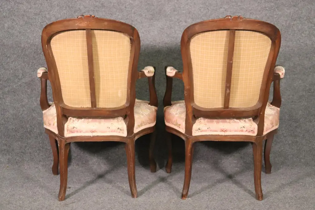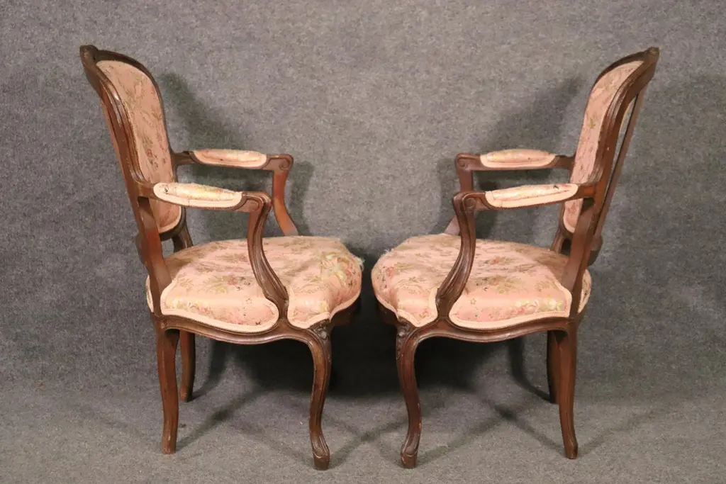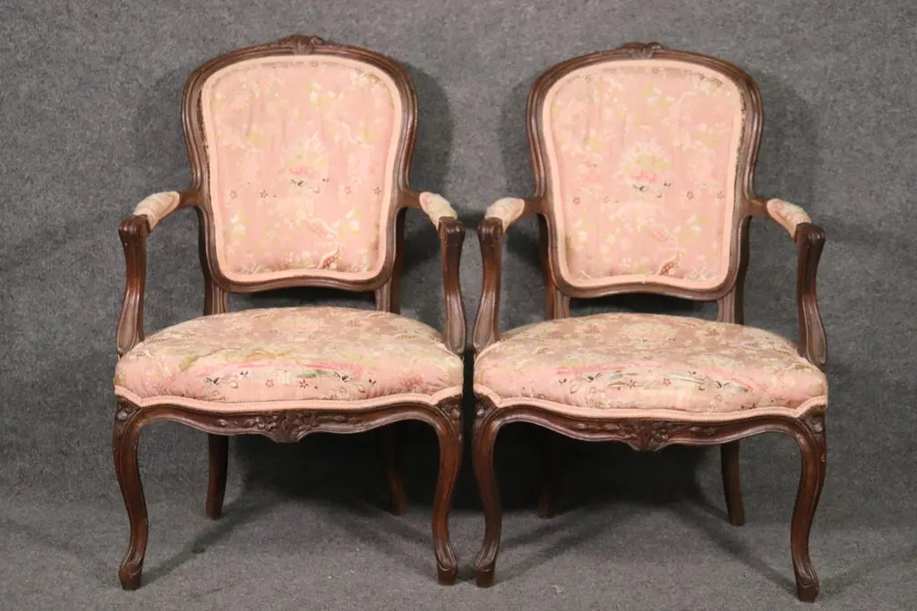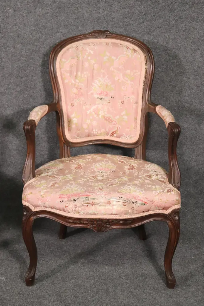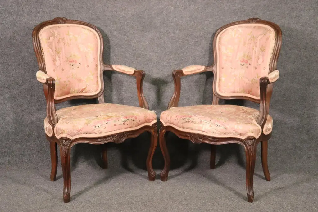Add elegance and timeless French charm to your interior with this antique pair of French Louis XV armchairs (fauteuils). Crafted in the late 19th to early 20th century, these finely carved walnut chairs embody the graceful lines and luxurious comfort associated with the Louis XV period. Each chair features a beautifully shaped frame with cabriole legs, hand-carved floral and scroll details, and gently curved arms that showcase the refined craftsmanship of traditional French furniture design.The chairs are upholstered in a soft pink floral fabric, which highlights their romantic appeal and adds a touch of sophistication. While showing natural signs of age and use consistent with their history, the upholstery retains its classic beauty, making these chairs perfect for collectors and decorators alike. Ideal as accent chairs, salon seating, or decorative fauteuils in a French country, Rococo, or shabby chic interior, they offer both comfort and style.These authentic Louis XV style armchairs are highly versatile and will elevate any living room, bedroom, or formal sitting area. Their antique patina adds character, while their timeless design ensures they remain a focal point for years to come.
