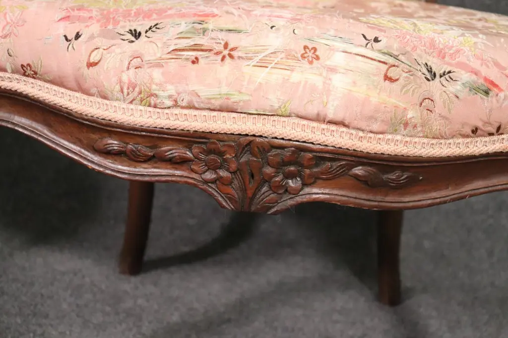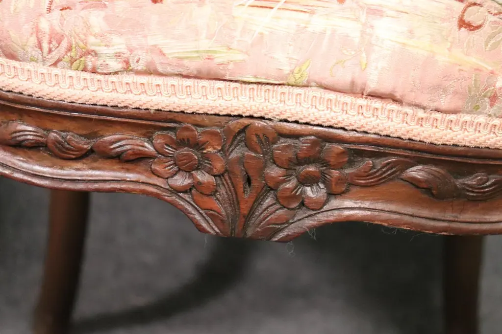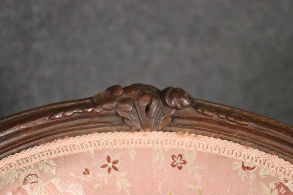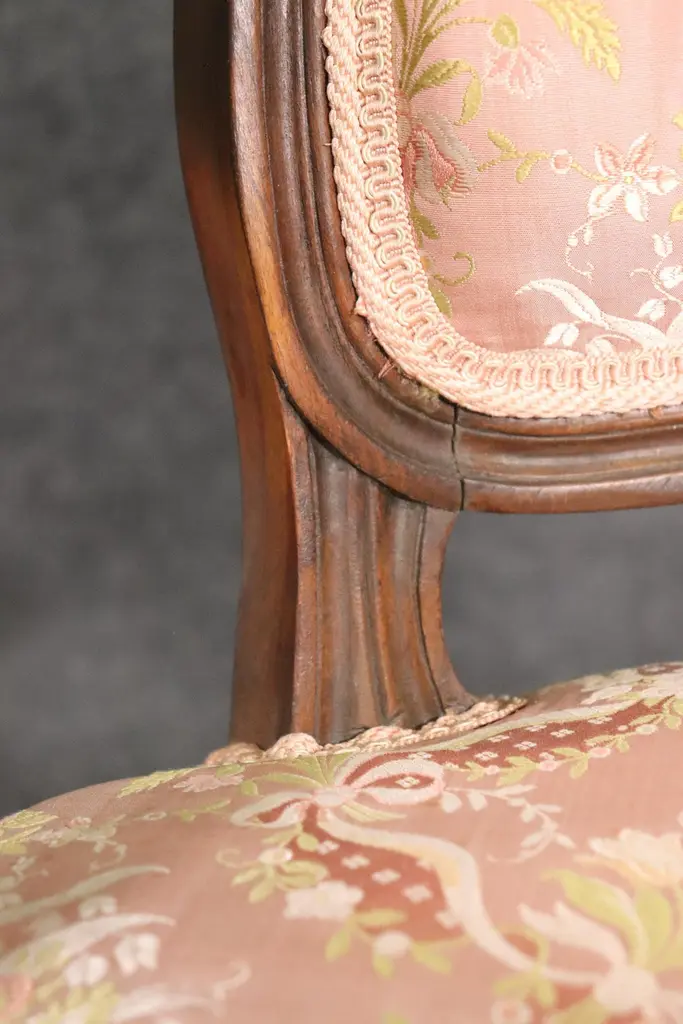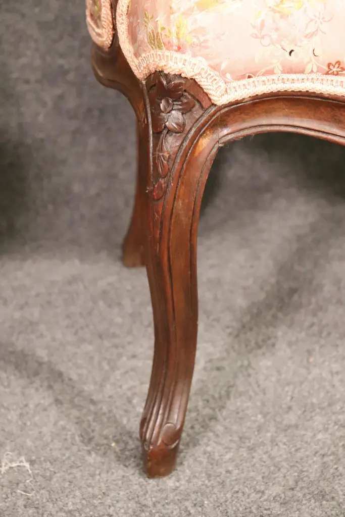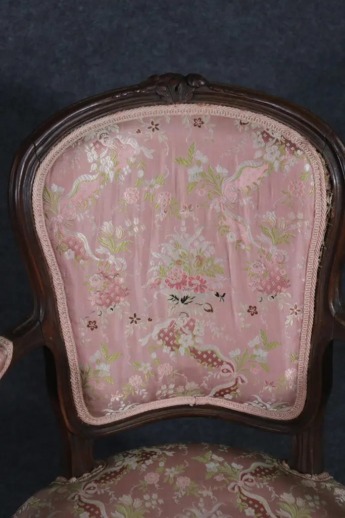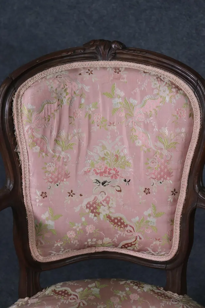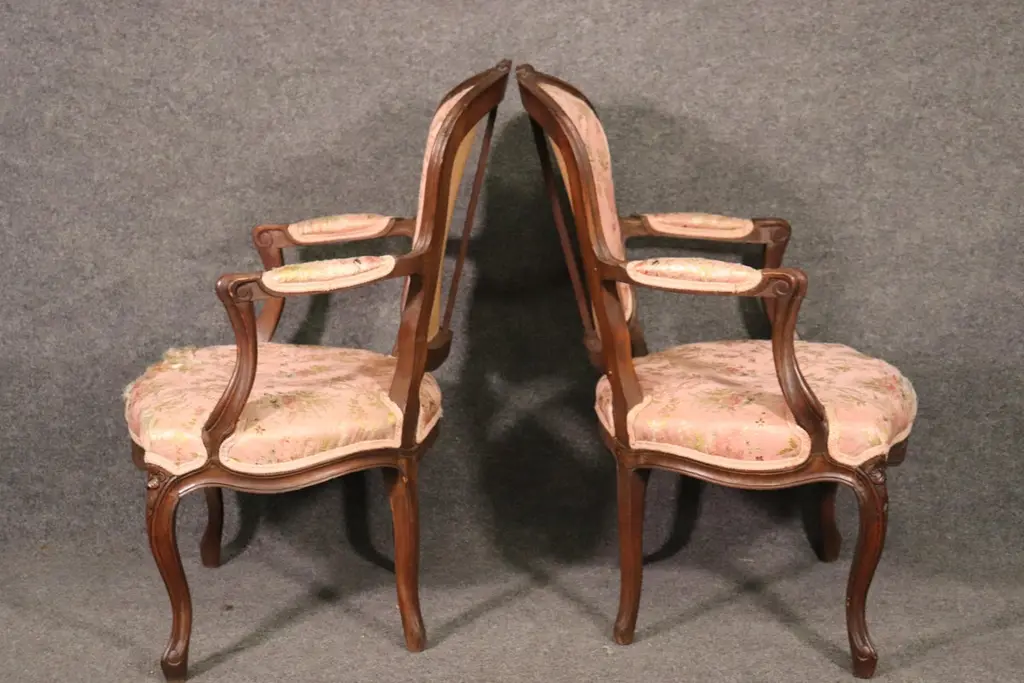 Add elegance and timeless French charm to your interior with this antique pair of French Louis XV armchairs (fauteuils). Crafted in the late 19th to early 20th century, these finely carved walnut chairs embody the graceful lines and luxurious comfort associated with the Louis XV period. Each chair features a beautifully shaped frame with cabriole legs, hand-carved floral and scroll details, and gently curved arms that showcase the refined craftsmanship of traditional French furniture design.The chairs are upholstered in a soft pink floral fabric, which highlights their romantic appeal and adds a touch of sophistication. While showing natural signs of age and use consistent with their history, the upholstery retains its classic beauty, making these chairs perfect for collectors and decorators alike. Ideal as accent chairs, salon seating, or decorative fauteuils in a French country, Rococo, or shabby chic interior, they offer both comfort and style.These authentic Louis XV style armchairs are highly versatile and will elevate any living room, bedroom, or formal sitting area. Their antique patina adds character, while their timeless design ensures they remain a focal point for years to come.