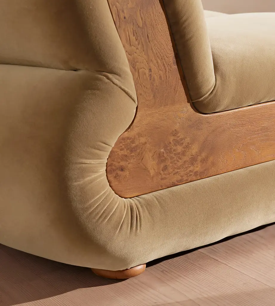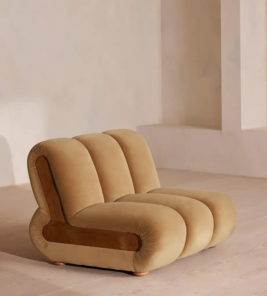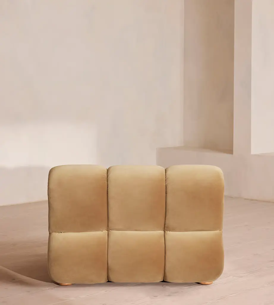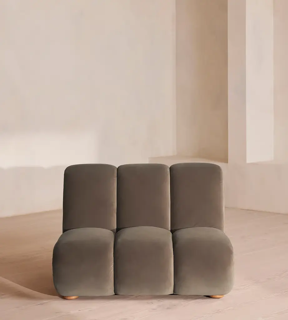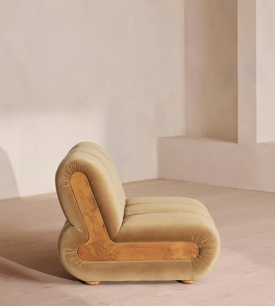 Designed to adapt to any living space, the Noelle modular sofa comprises of straight and curved modules to create the shape you desire, or alternatively a generous armchair if used alone. Rich velvet upholstery is complemented with aged Pippy Oak veneer sides that have a burl finish, while its statement curved shape takes its design cues from the 1970s interiors of 180 House.
