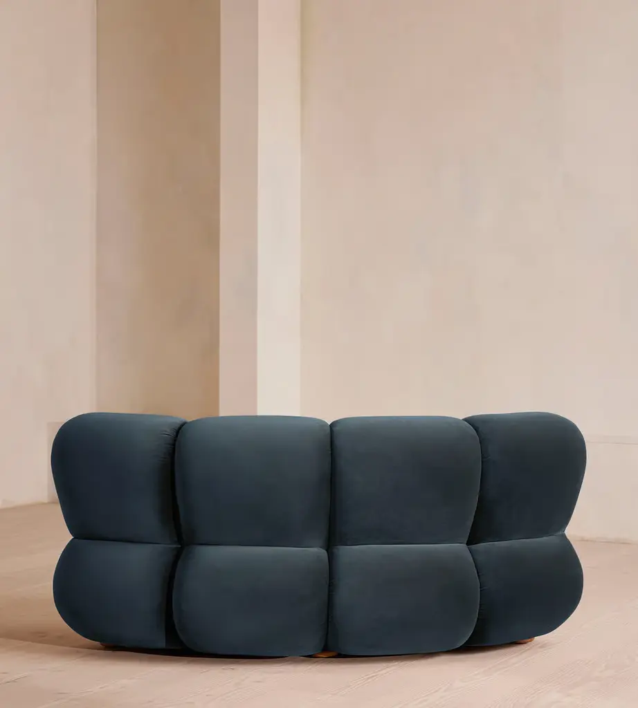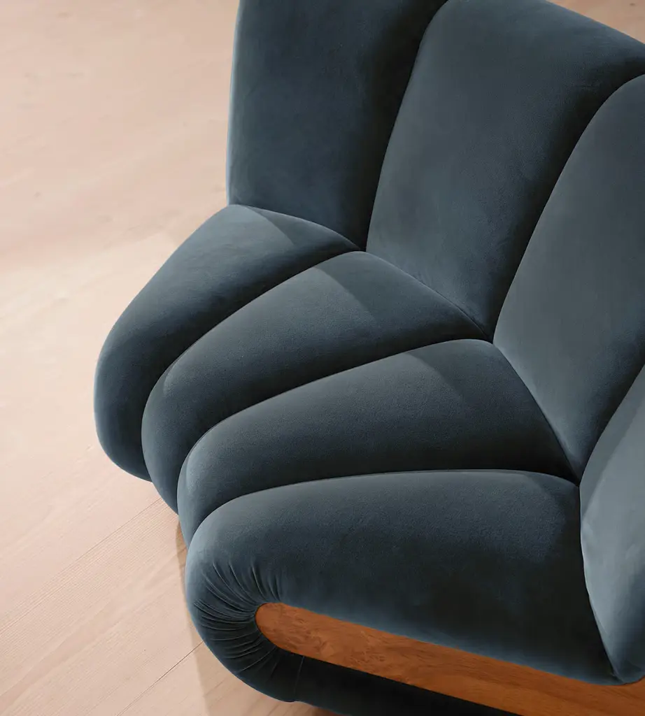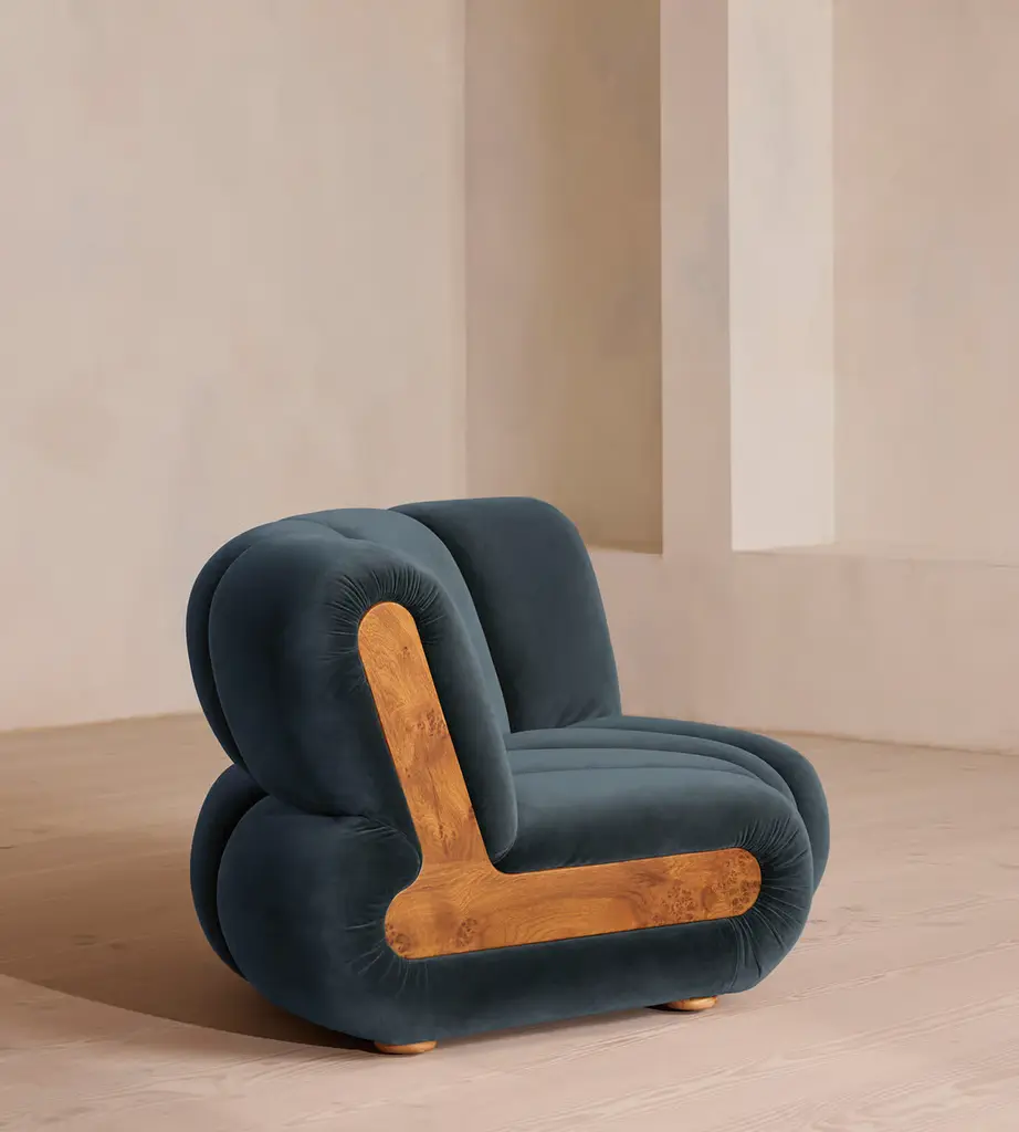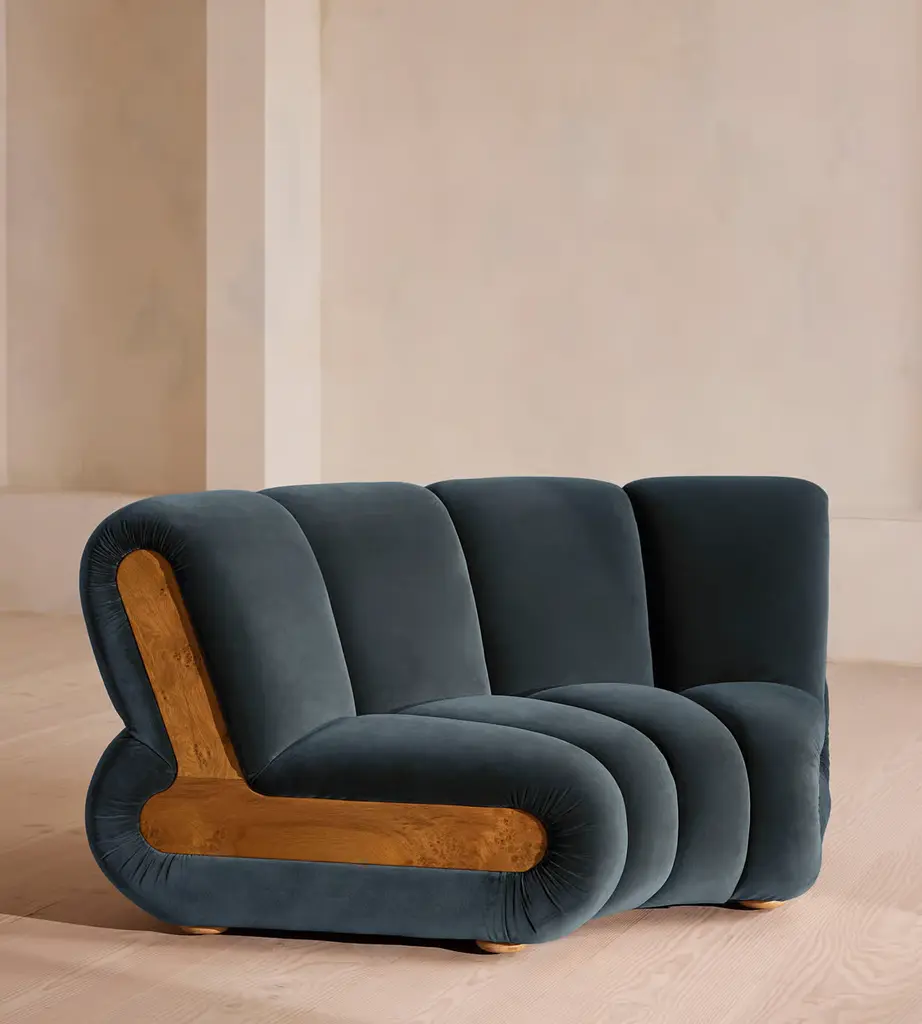 Designed to adapt to any living space, the Noelle modular sofa comprises of straight and curved modules to create the shape you desire, or alternatively a generous armchair if used alone. Rich velvet upholstery is complemented with aged Pippy Oak veneer sides that have a burl finish, while its statement curved shape takes its design cues from the 1970s interiors of 180 House.