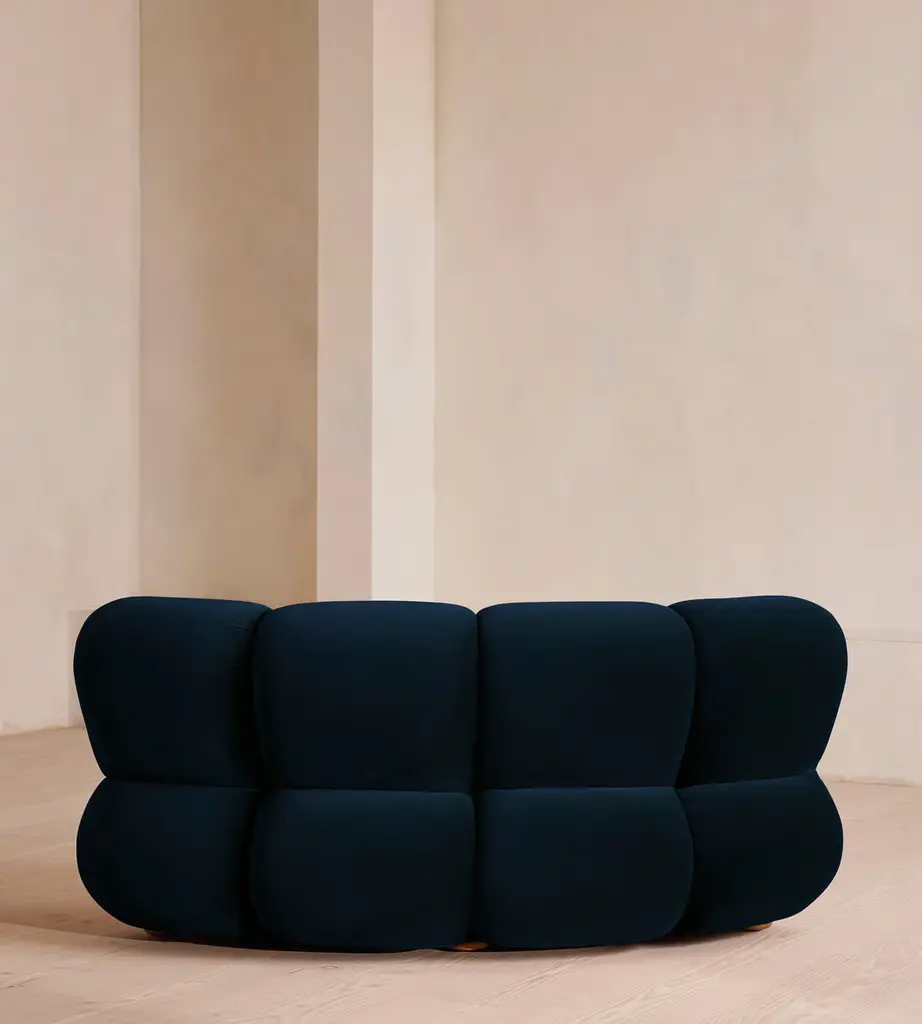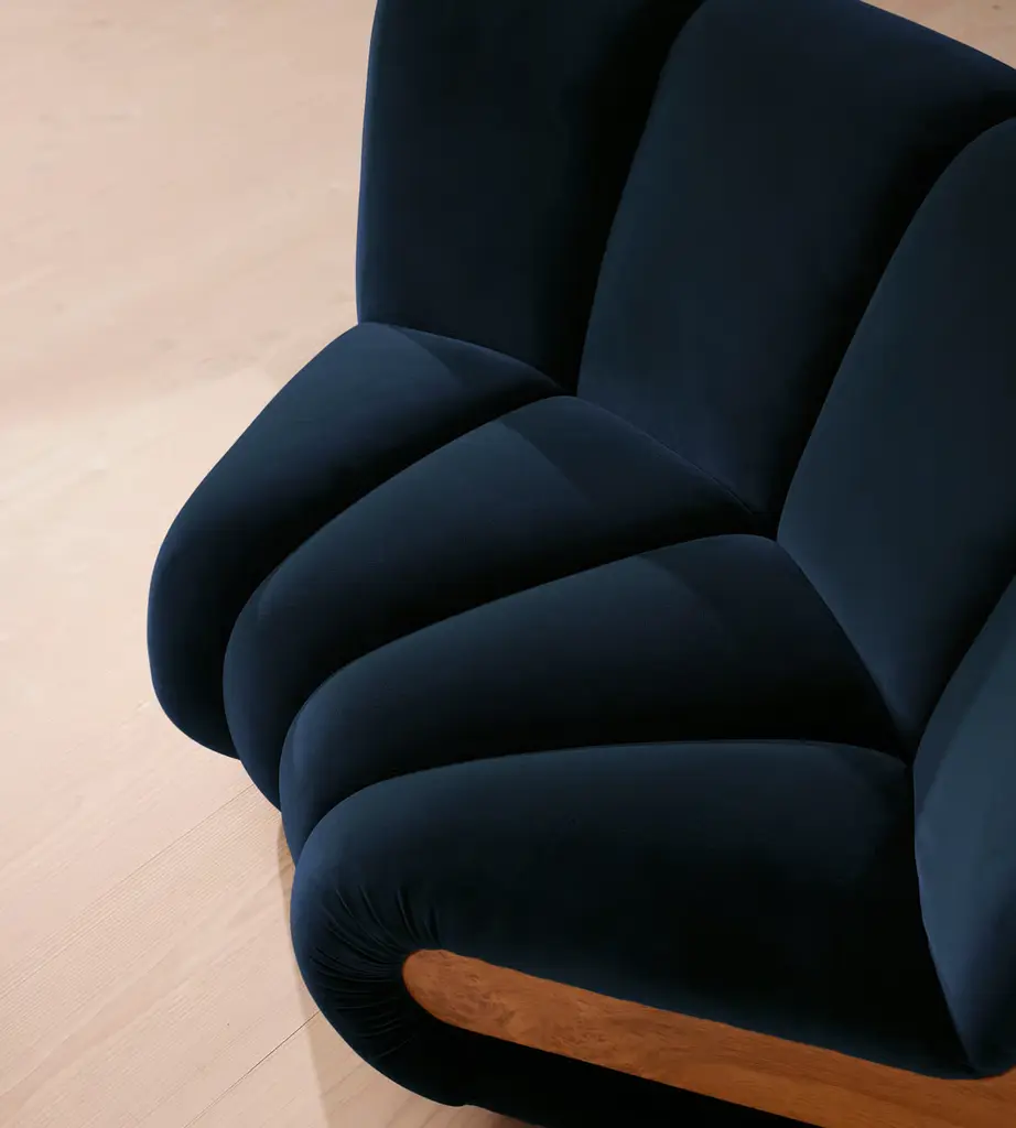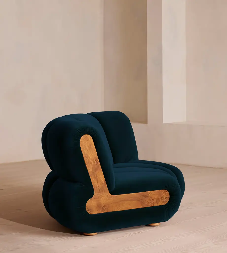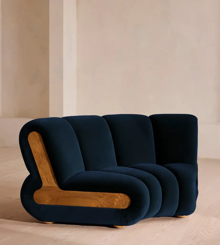 Designed to adapt to any living space, the Noelle modular sofa comprises of straight and curved modules to create the shape you desire, or alternatively a generous armchair if used alone. Rich velvet upholstery is complemented with aged Pippy Oak veneer sides that have a burl finish, while its statement curved shape takes its design cues from the 1970s interiors of 180 House.