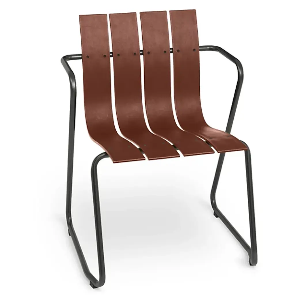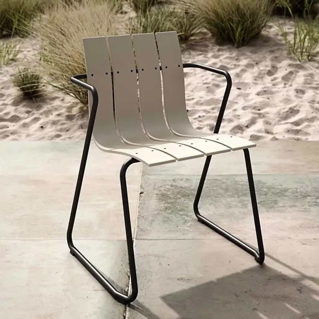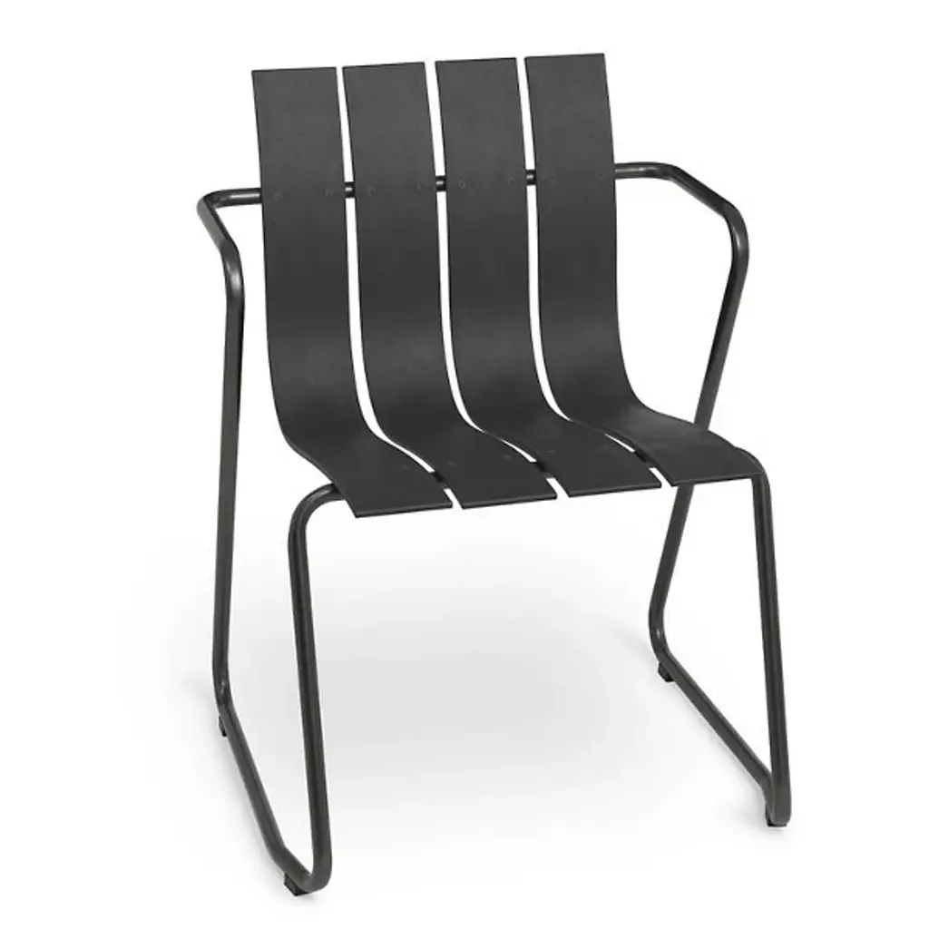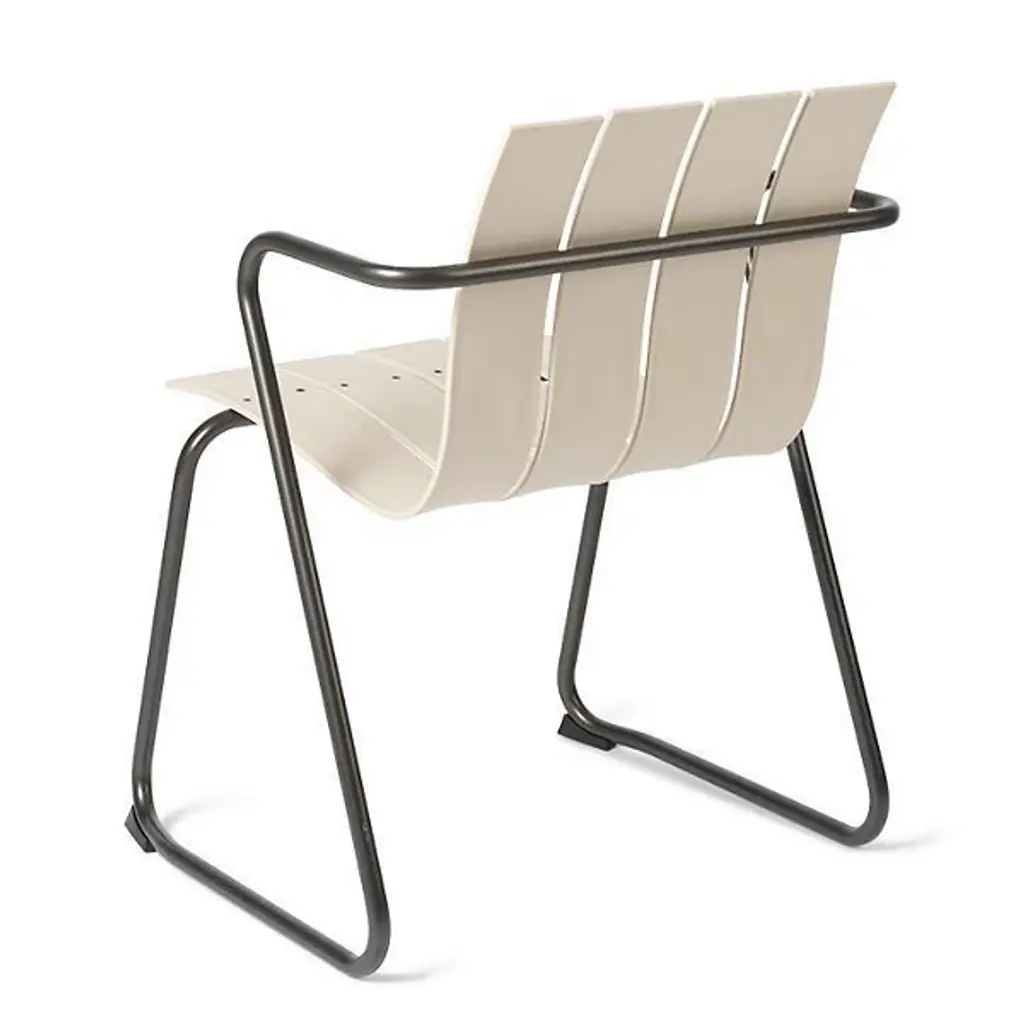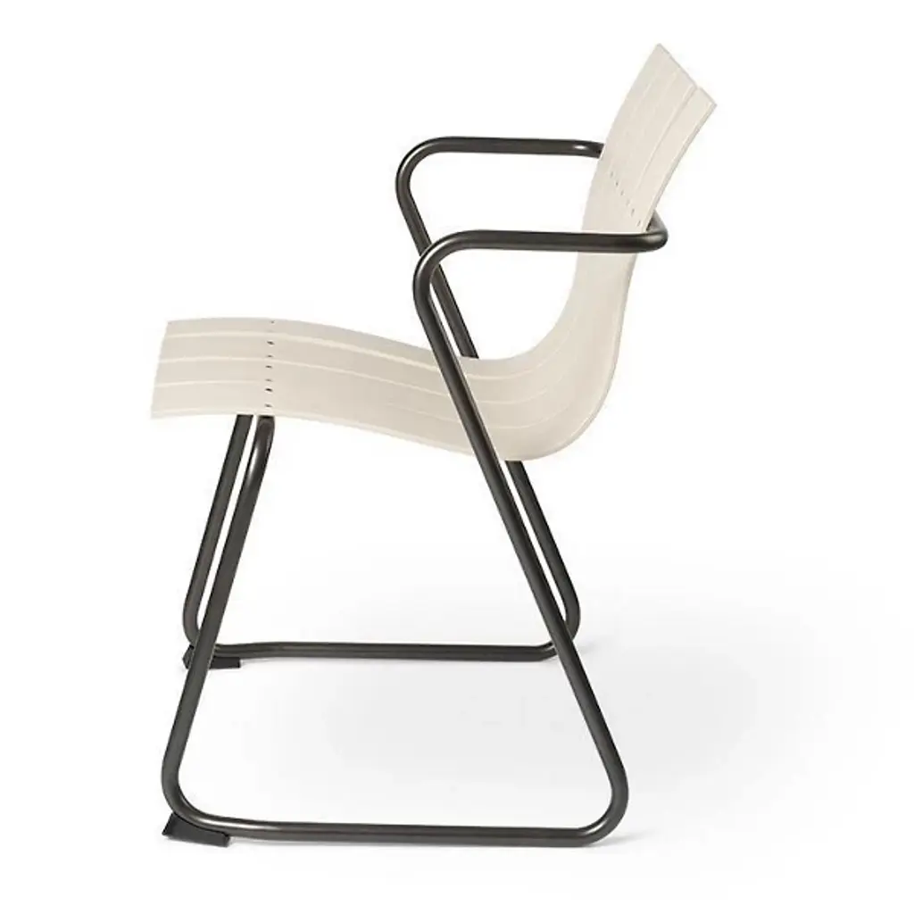 A Jørgen & Nanna Ditzel classic revived for the health of our oceans. A seat on the Ocean Outdoor Armchair doesn't just bring a sense of comfort and sophistication, it fires up our push for positive change by giving new life to discarded fishnets. Mater tapped Jørgen & Nanna Ditzel's iconic 1955 piece to give form to the innovative material. The Ditzel family echoed Nana Ditzel's studies in new materials, making this a piece that would have surely satisfied her. The chair follows the formula of the original, presenting a clean, coastal aesthetic highlighted by a wavy back and seat rest. This flowing slatted design showcases the recycled plastic material. To reach its moldable state, engineers take fishnets that would often be scattered across our seas, cleans and processes them, then transforms them into moldable pellets. The durable plastic rests gracefully over a light yet sturdy steel frame, inviting a comfortable seating posture that looks good from any angle.