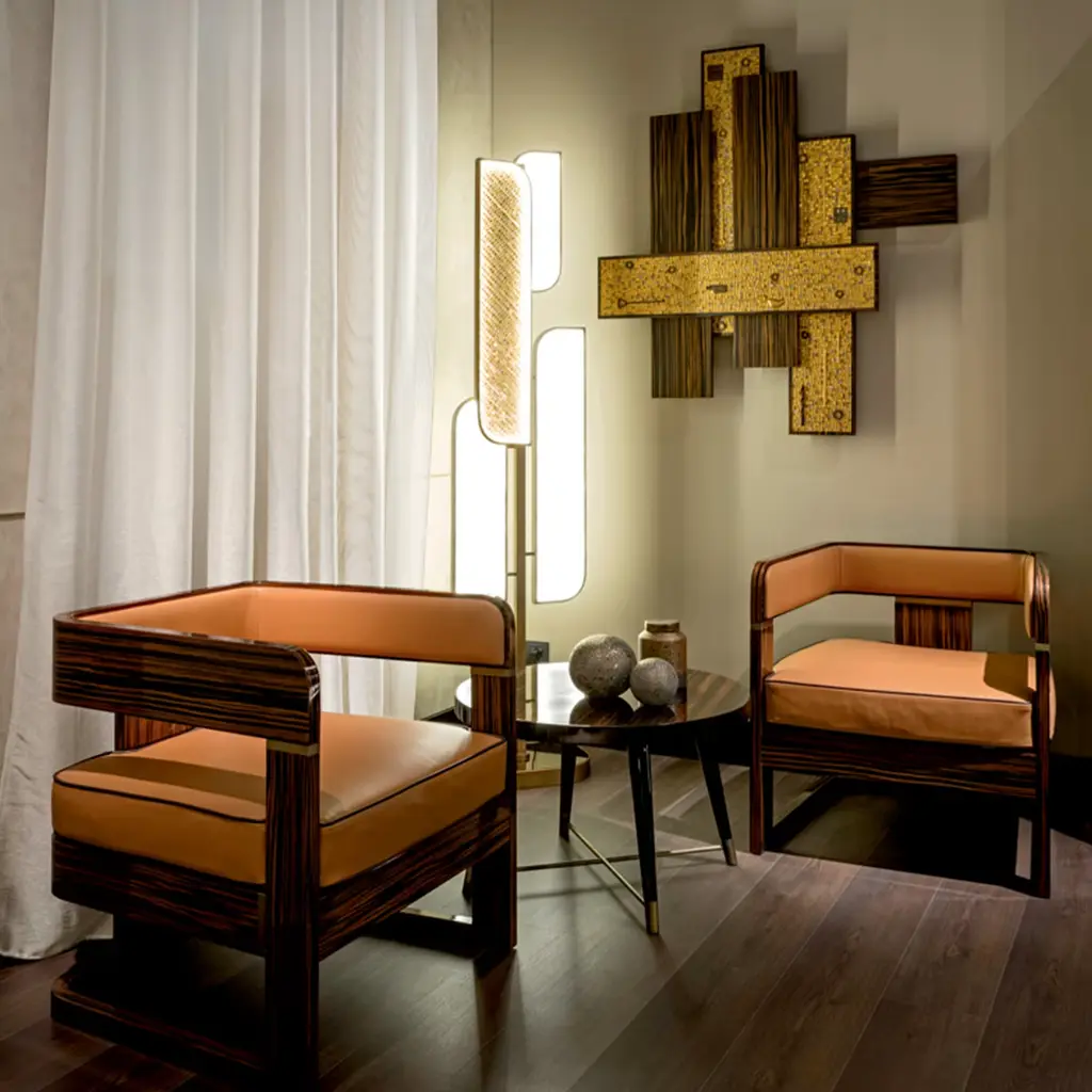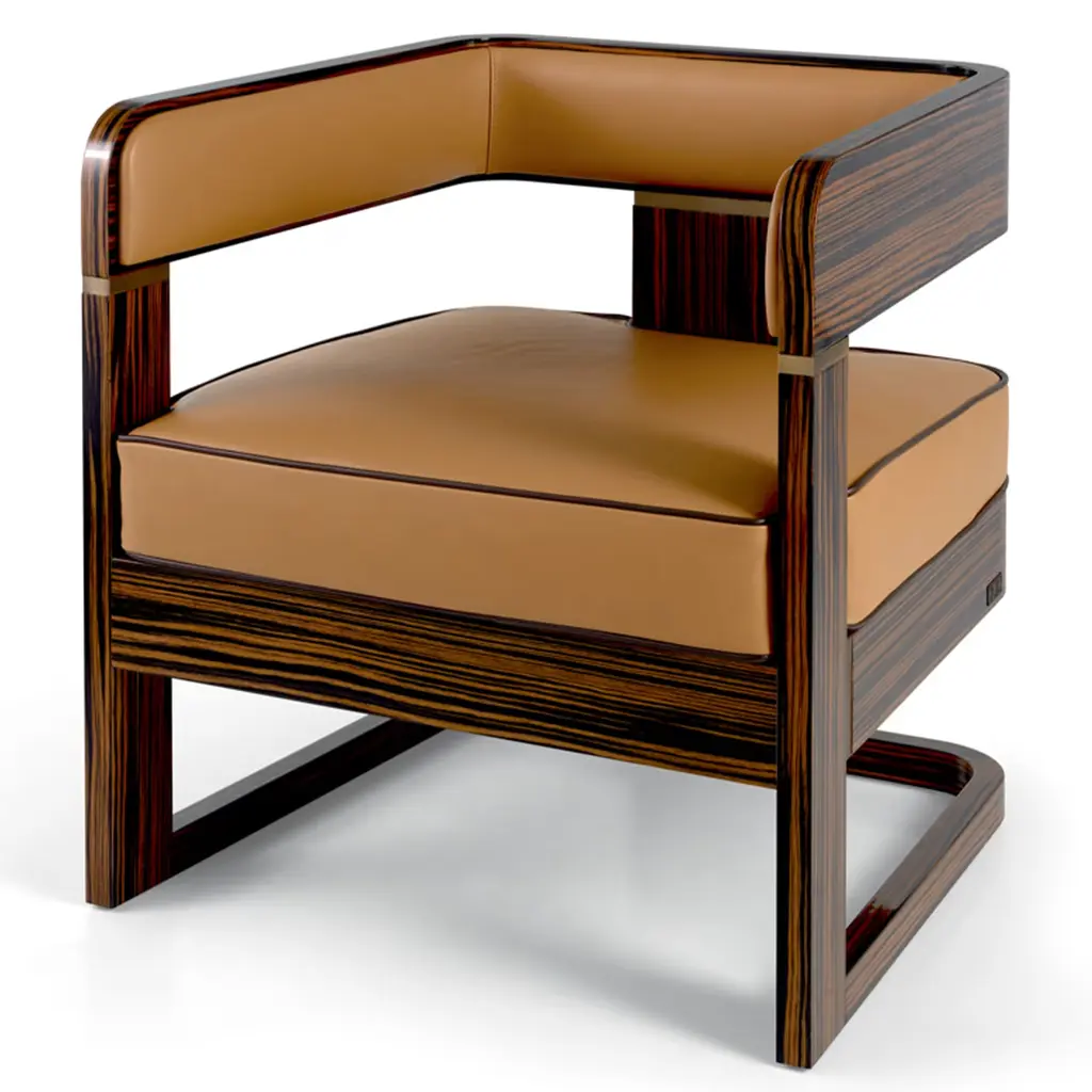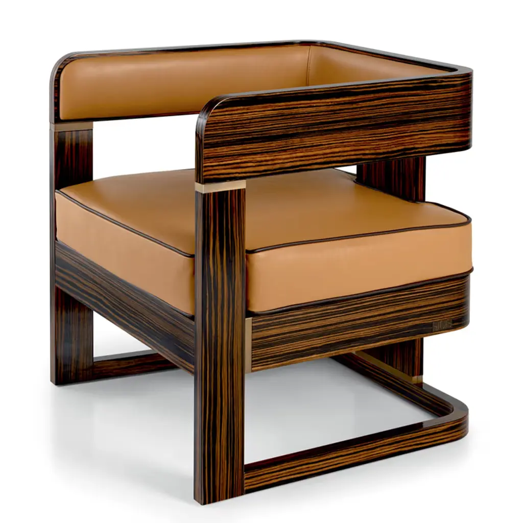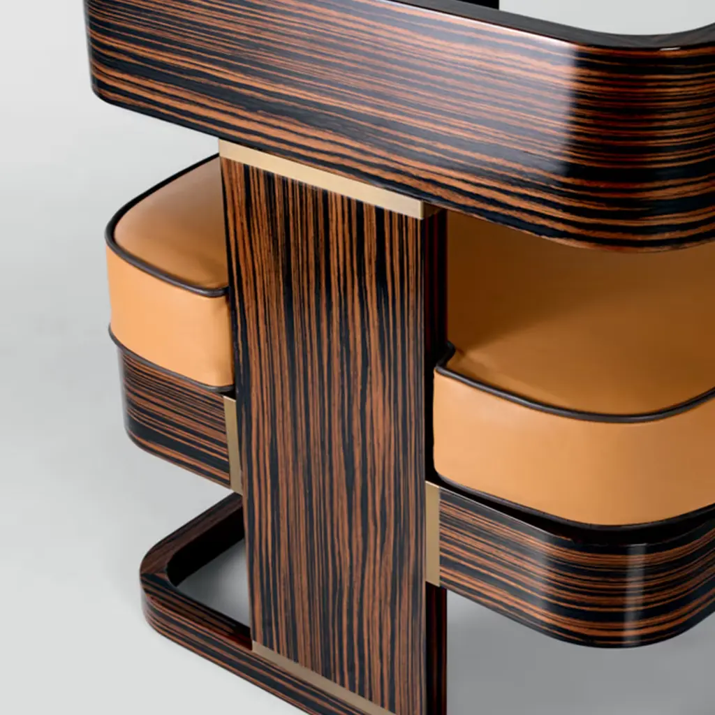 A throwback to 1940s details combined with more contemporary finishes. This refined armchair has an ebony structure, bronze finishes, and precious metals.
