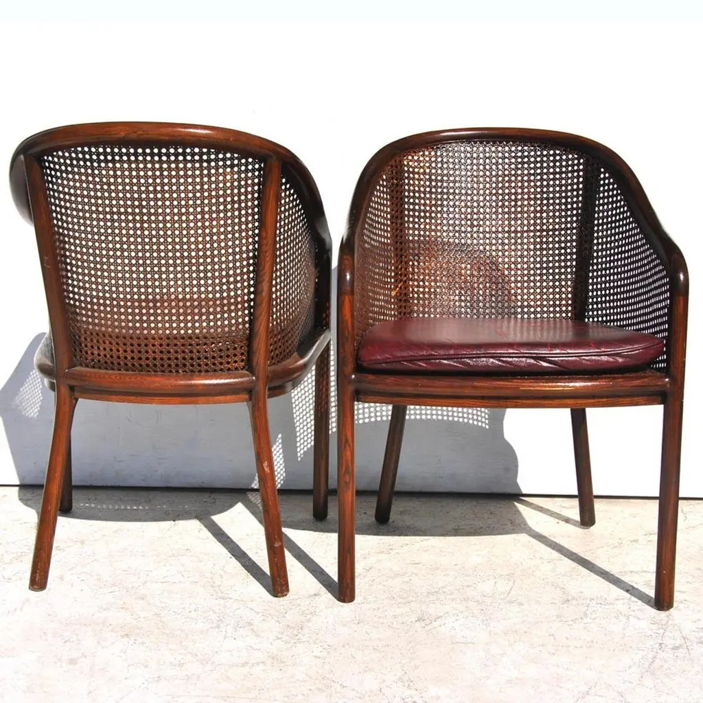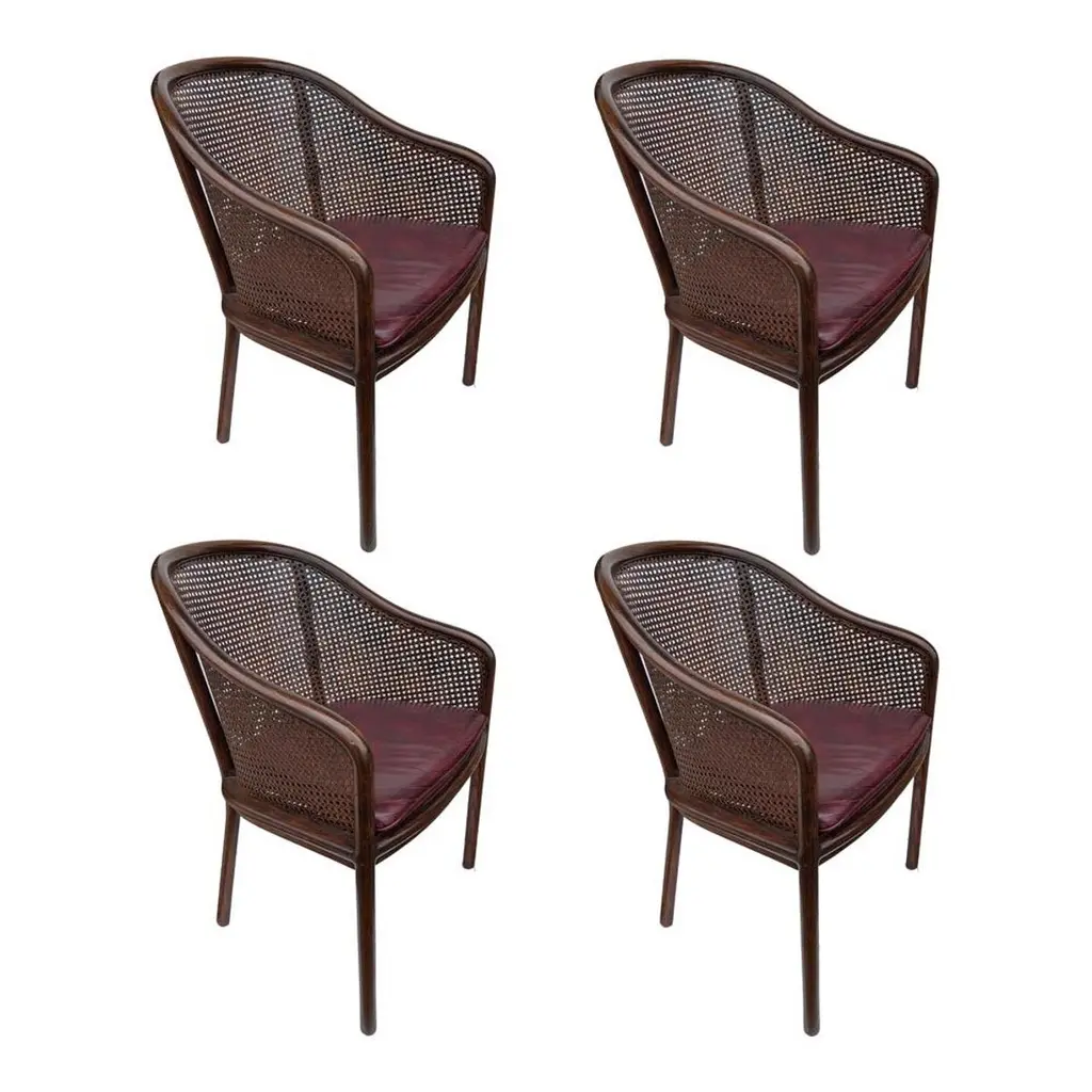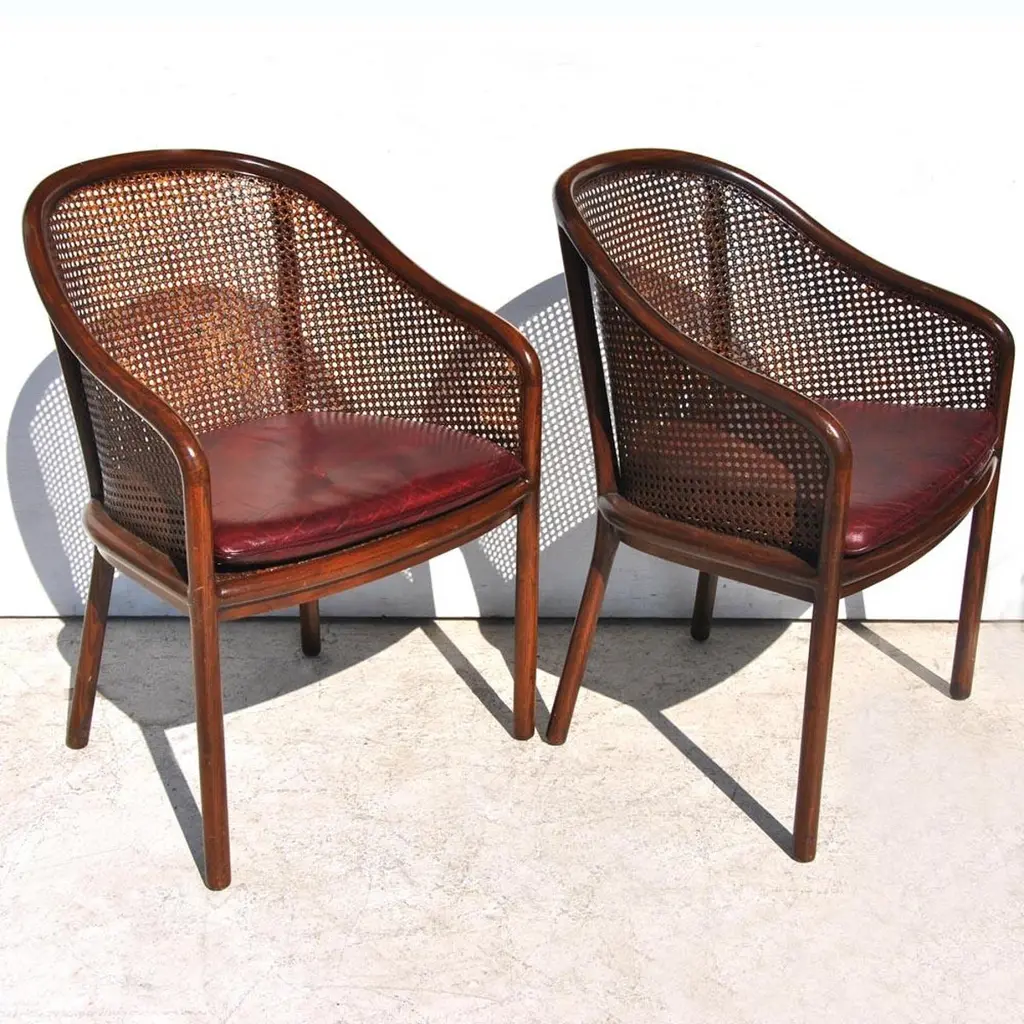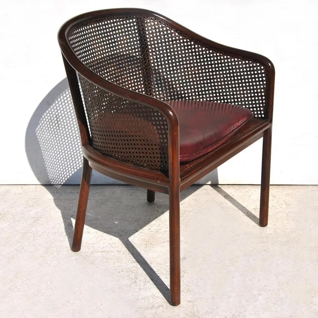 Best known for his interiors, Mr. Bennett's projects include residence in New York, London, Venice and Rome, as well as his own quarter, a Manhattan apartment atop the Dakota, a country house in Long Island and a flat in Paris. In the commercial category, works encompass a national network of showrooms for Brickel, projects for Chase Manhattan Bank and consultant plans for the Solow Building Corporation. In 1963, he began a collaboration with Brickel Associates, designing first furniture and later textiles. He is considered a prodigious designer of objects: china, glassware and silver for Tiffany & Co., flatware for Supreme; porcelain for Sasaki; and, leather goods for Hermes. Bennett designs are well represented in the Museum of Modern Art's permanent collection and in the Cooper-Hewitt Museum.One midcentury Ward Bennett cane armchairOne Ward Bennett cane chair with original red leather cushion.Dark walnut finish.Four available.Age appropriate wear.We have 4 additional in a different scale: 22.75" W x 21" D x 32.75" H.