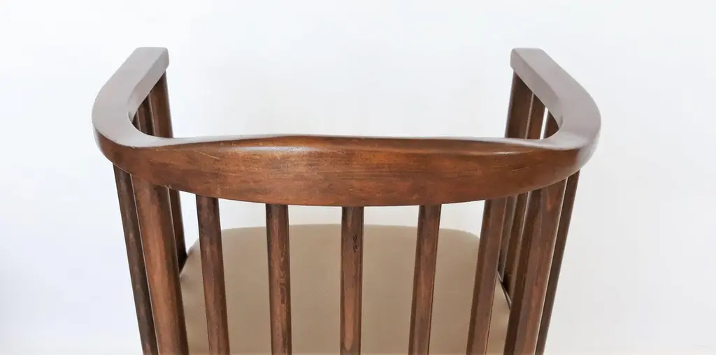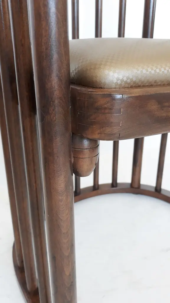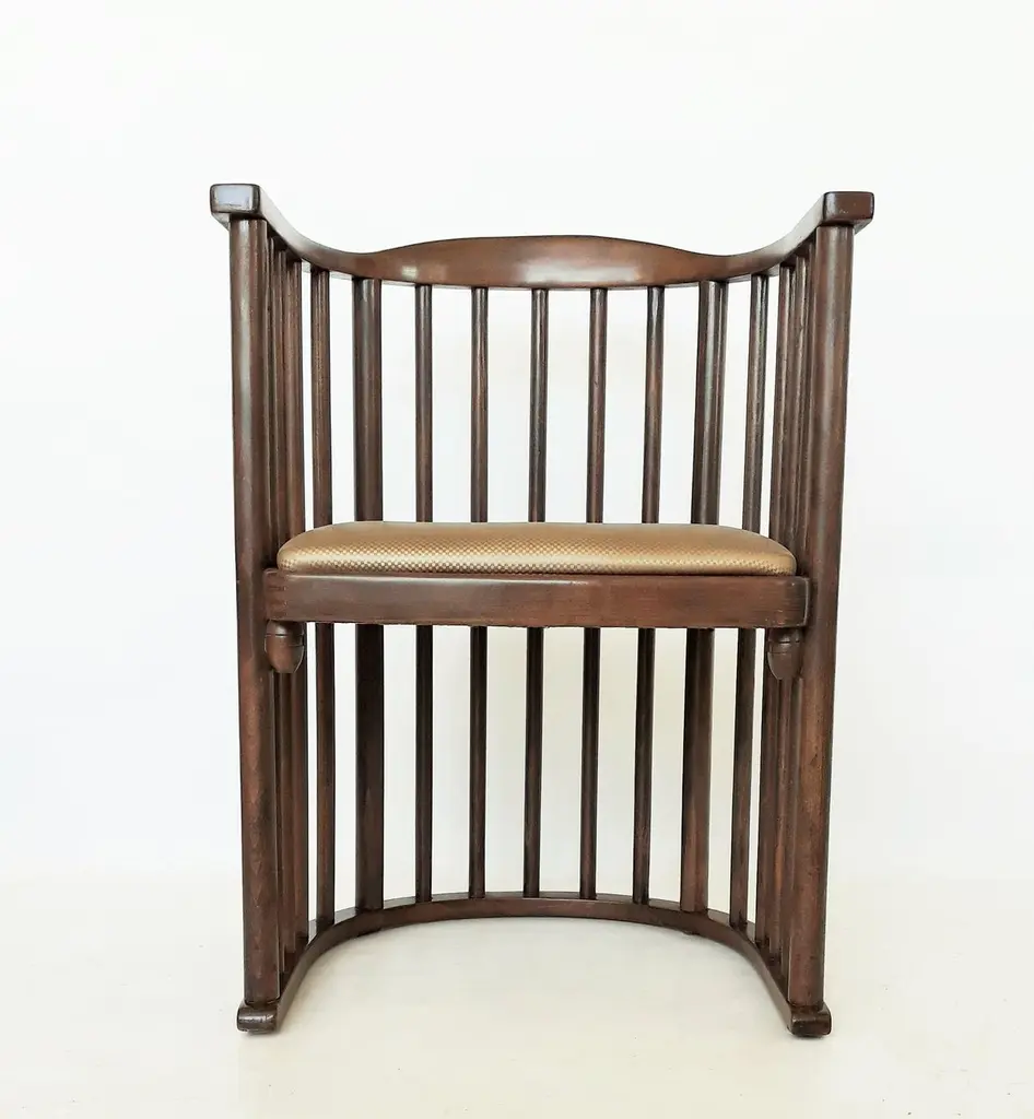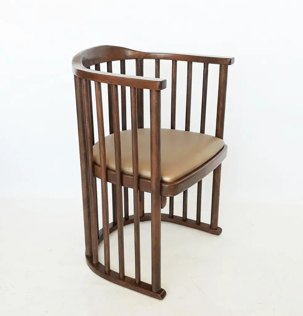 A fine find! These barrel armchairs model No. 729/2F, designed by Joseph Hoffmann, circa 1906. The simplicity of this chair design: is made up of a U-shaped horizontal rail that forms both the armrest and the crest rail. Supported by evenly spaced rods rather than four legs joined into a U-shaped base. Just above the middle of the legs, an appropriately formed suspended seat frame is stabilized with two balls on the underside of the seat. There are no manufacturer’s marks. Price $8,200 is for one chair, we have eight available.Documented: Jacob & Josef Kohn: Bugholzmöbel / Bent-wood furniture / bentwood furniture. Der Katalog von 1916 pg. 38 illustrationliterature: Bent wood and metal furniture 1850-1946, Ostergard, pg. 107 illustrates variations.Note: These are original and not reissue chairs.Josef Hoffmann (Austrian, 1870-1956) was a celebrated Viennese architect and designer known for his modern aesthetic. Important architectural projects included the Purkersdorf Sanatorium, the Stoclet Palace and the Cabaret Fledermaus. Hoffmann was a key figure in the Vienna Secession movement and together with Koloman Moser founded the highly important workshop of modernist craftsmen known as the Wiener Werkstatte.