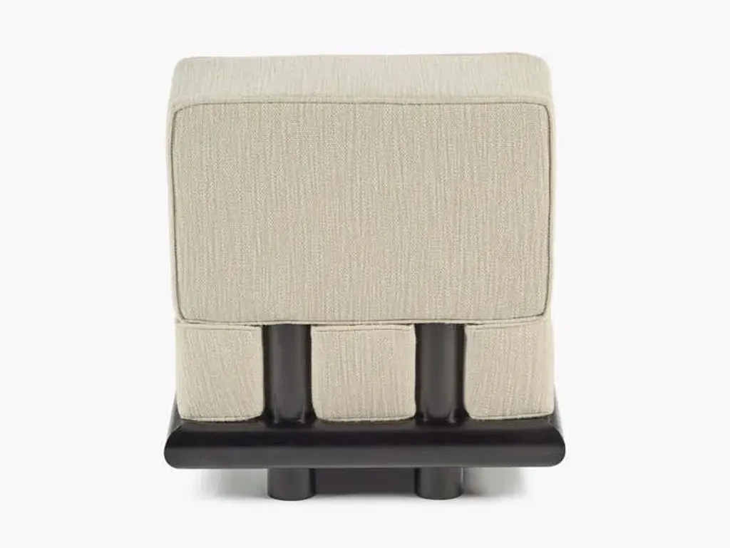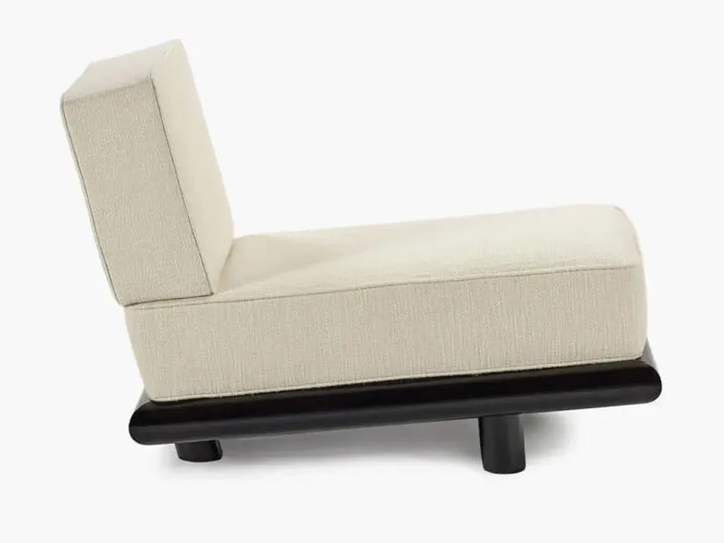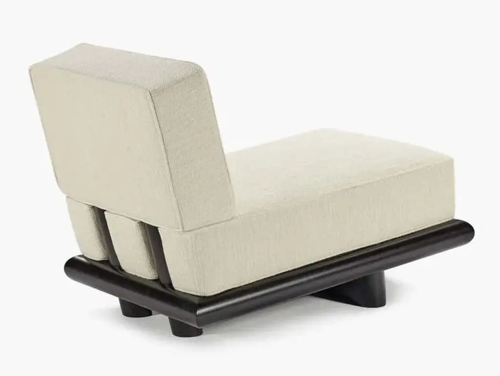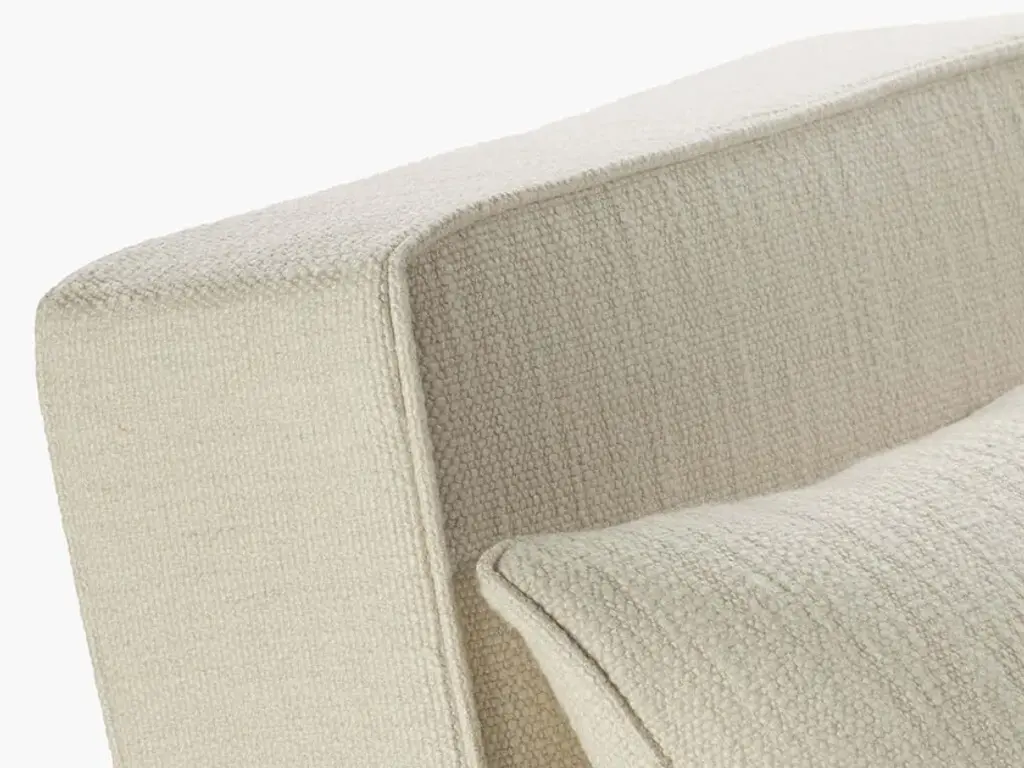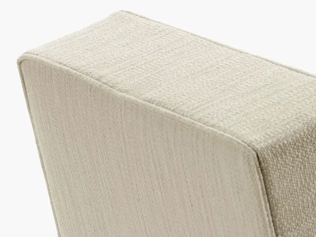 Ono is a fabric upholstered 1 seat sofa with a wooden base.The sturdy but elegant Ono family of seating plays with proportions and expectations. Both the Ono 1 seat and Ono 3 sofa are conceived as ‘active’ furniture, inviting several different ways of sitting. Elongated lines, deep upholstery and tactile fabrics combine with an unexpected slant to the seat. The form hugs relatively close to the ground, elevated on thick legs – a solid wide plank with curved ends at the front and two smaller columns at the rear. The rear legs rise up in between indents in the seat upholstery and appear to disappear into the back cushion,which slots over the frame creating a secure and supportive construction. The unique construction means that the design maintains interest when viewed from the back. This is particularly important in the 234-centimetre-long Ono 3, a sofa that can be placed freestanding in a room and look attractive from any angle.Demeulemeester and Robyn’s unexpected approach to colour comes to the fore in this family.It is the first time that Ann Demeulemeester and her life partner, Patrick Robyn, have designed a complete line of furniture. They have made one-off pieces, such as the Table Blanche for Bulo. As always, the starting point came from an own need or personal interest. “I make something because I’m missing it, I want it, and I can’t find it”, says Demeulemeester. The realisation developed into them wanting to translate these furniture pieces, designed for their own use, into accessible, timeless pieces that people would also want to integrate and cherish at home. Their furniture remains true to the couple’s distinctive aesthetic style. As with all their previous work, a light-hearted game between shadow and light is clearly visible, as well as a kind of refined decadence requiring an involved, intelligent owner. They don’t want to prescribe the use of these pieces but rather make suggestions for their use. At its heart, Demeulemeester’s work has always been an exploration and a celebration of contrasts - a beauty found in the interplay between strength and fragility, structure and nonchalance, the poetic and the radical, aesthetics and functionality. This is also the soul of the furniture collection and is further reflected in a dialogue between proportions and geometry. Linen, oak, wool, velvet, canvas - these materials form the heart of the collection and make you want to touch, caress and feel them. By experimenting with yarns, fibres and pigments, the designers have created a unique palette of textures and colours exclusively for the collection. There is the anticipated deep black and off-white, and also moss green, soft pale pink, a chic cream and warm roasted orange. All furniture is made of wood veneer or solid wood, FSC certified, and finished with either a lacquer or a water-based stain, which protects against dirt and allows you to clean the wood with a slightly damp cloth. The lacquers and stains are always sprayed (not applied with a brush). Customers should always be aware that wood is a natural material that can show imperfections and still undergo changes over time (shrinkage/expansion, change of colour under the influence of light). For the upholstered furniture, the fabrics are woven in Belgium and exclusively designed and confectioned for this collection.