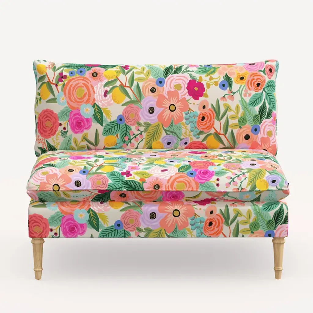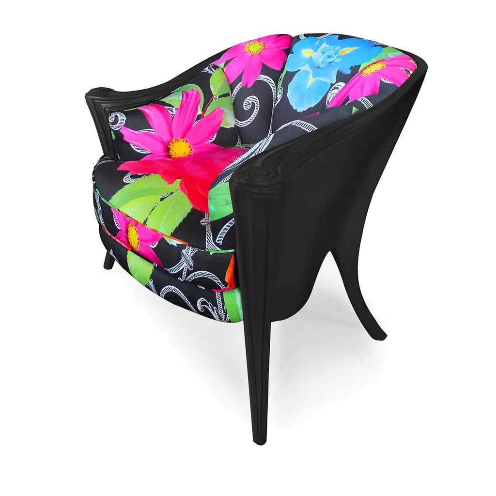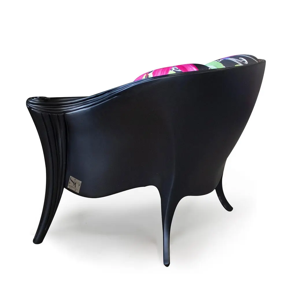 Carved wooden structure with matt black lacquer finish on back, armrests and front legs; upholstered with Black Flower fabric, designed by Carlo Rampazzi.