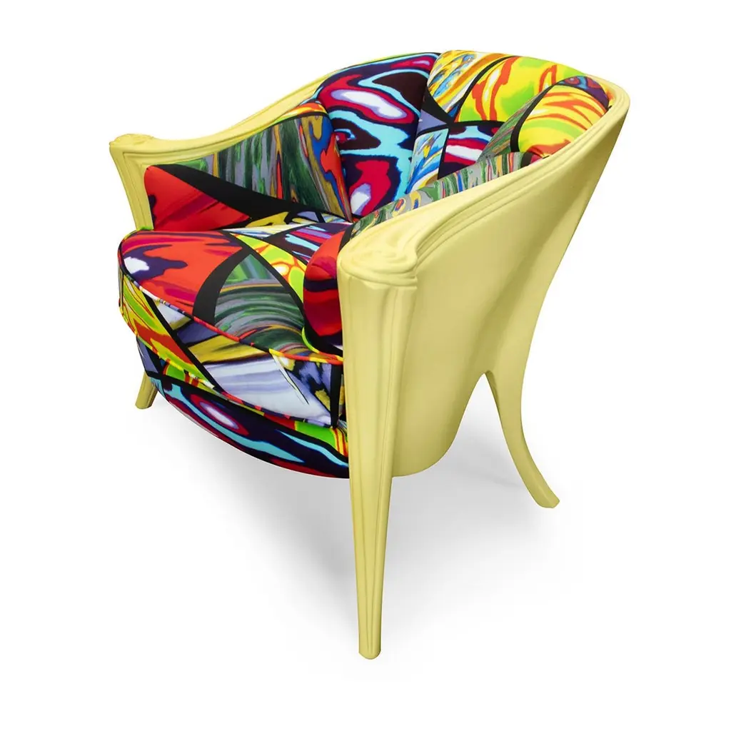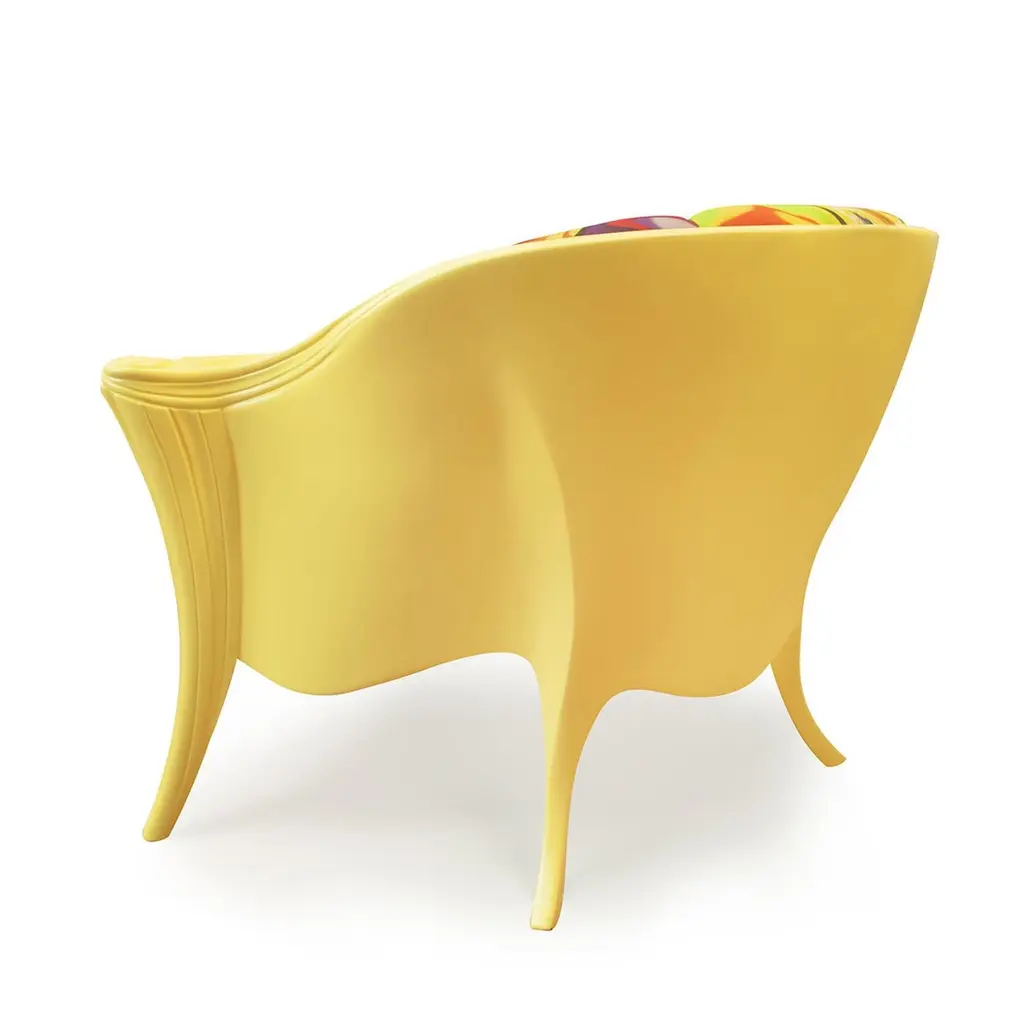 Carved wooden structure with matt yellow lacquer finish on back, armrests and front legs; upholstered with Murrina fabric, designed by Carlo Rampazzi.