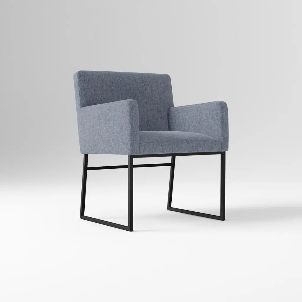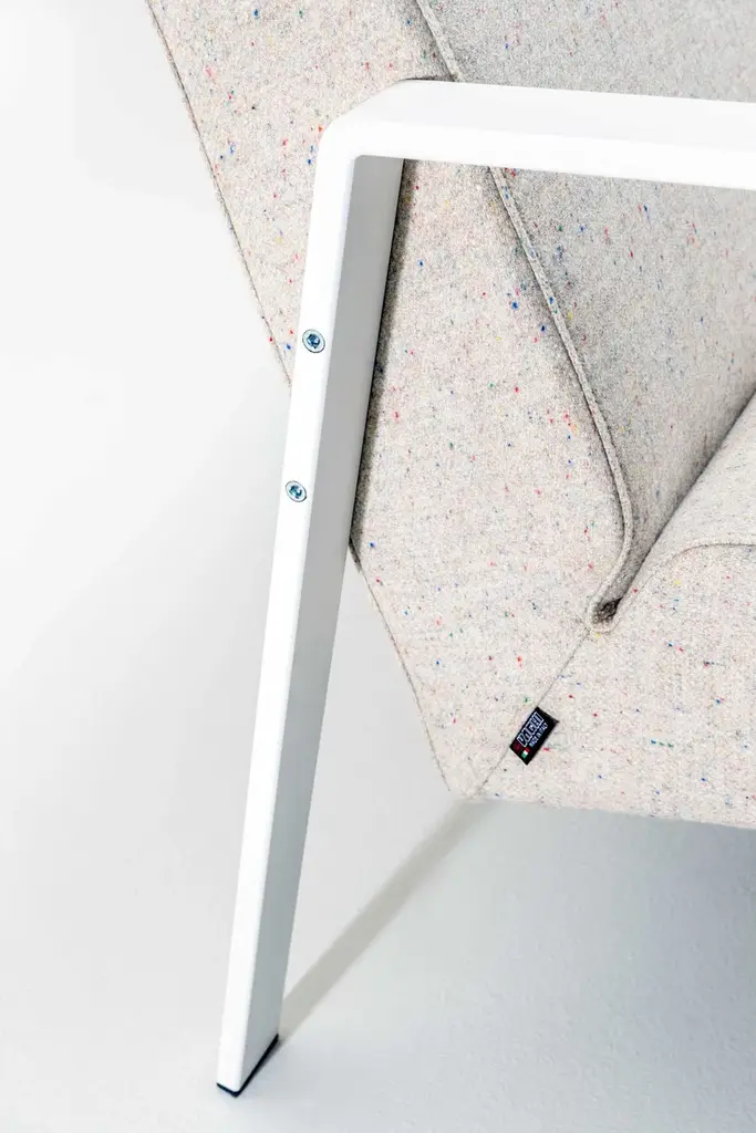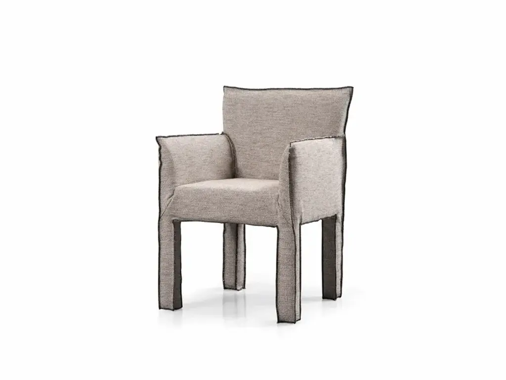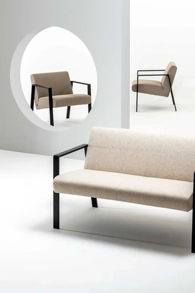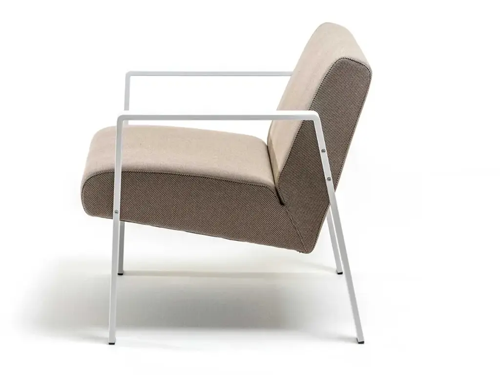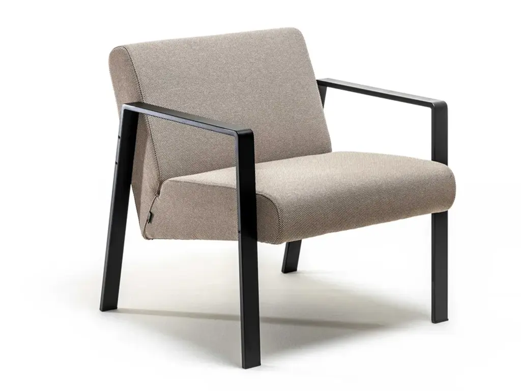 Oreotto is an armchair available in fabric or leather, featuring a supporting structure with open armrests made of tubular metal and polypropylene glides.The metal leg design highlights its simple shape and harmoniously connects to the beveled cut of the backrest.