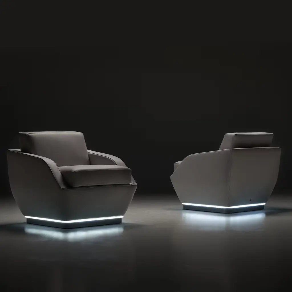 Rigorously sculpted profiles outline this exclusive armchair, the design particularly standing out in the dark when the LED lights contouring its lower profile can take center stage. A synthesis of technology and sartorial flair, it will ideally complement elegant contemporary-style decors thanks to its light-gray leather upholstery. Generous polyurethane padding ensures long-lasting comfort.