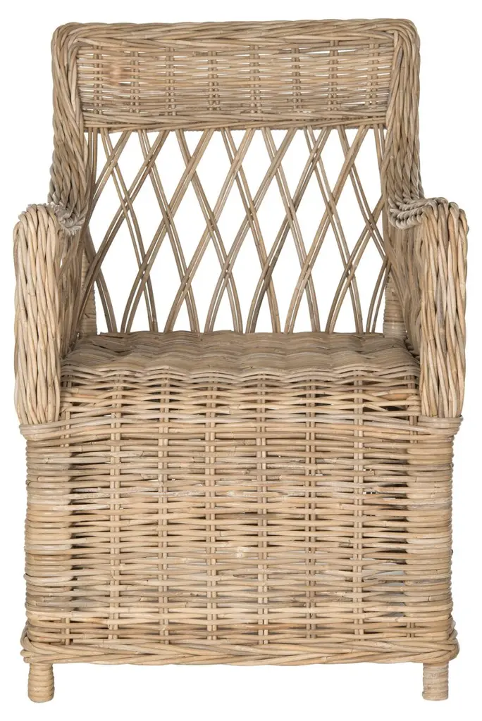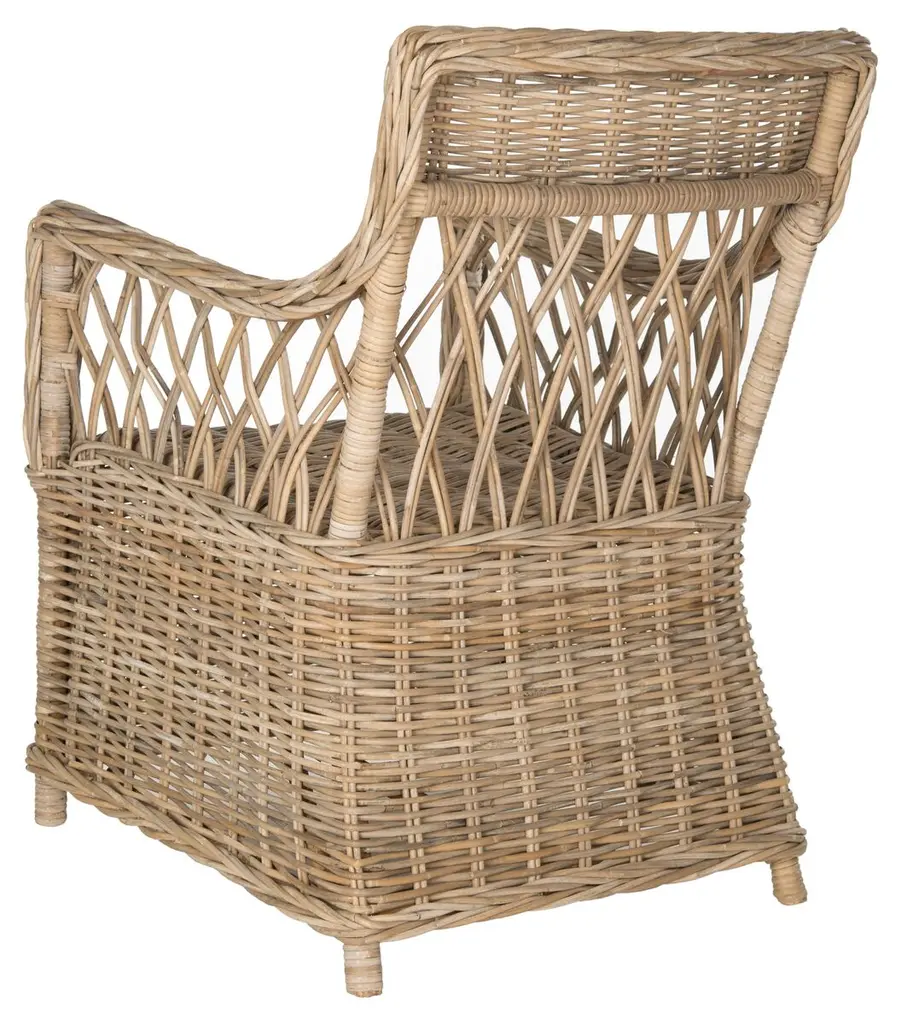A classic addition to any space, this armchair boasts an open, airy lattice weave back that can only be achieved with flexible but sturdy gray-tone rattan.