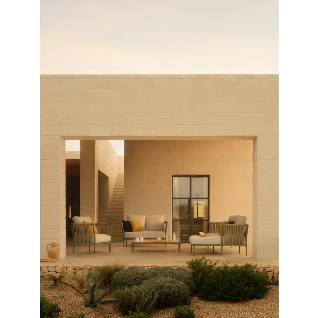 Elevate your outdoor space with style and sophistication with the Outdoor Aluminum Armchair from Unopiu Treble. Crafted with a bi-material design of aluminum and rope, this collection boasts lightness, sleek lines, and high performance. Choose from four finishes including graphite, sage, syrah, and sand, and pair with the luxurious rectangular coffee table featuring a solid teak top. Perfect for both urban and residential settings.