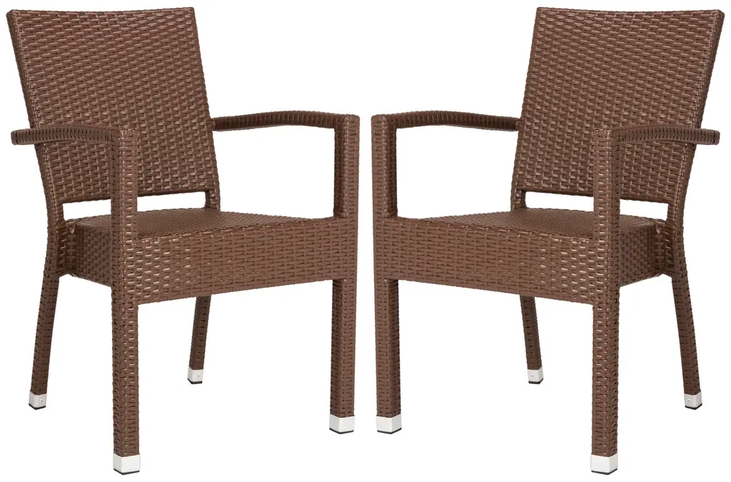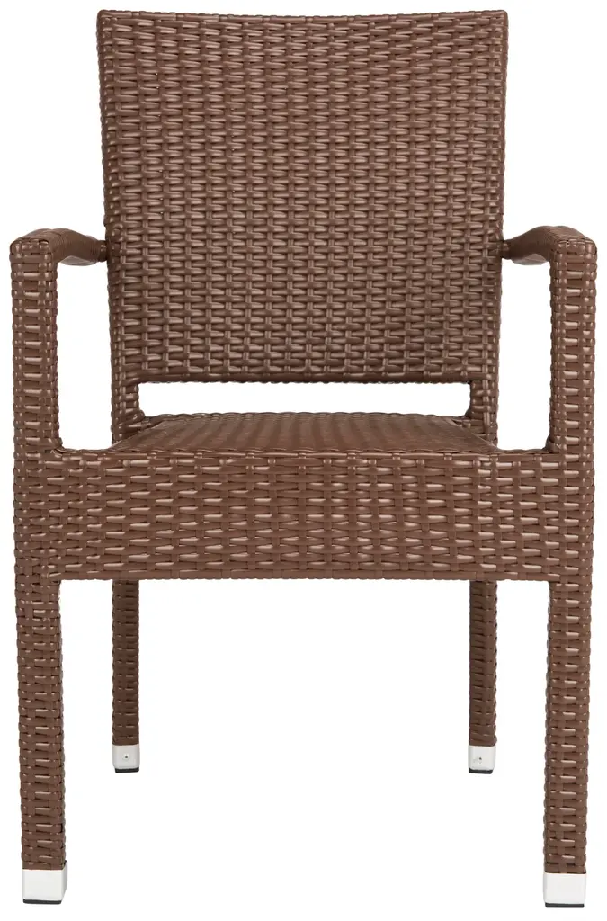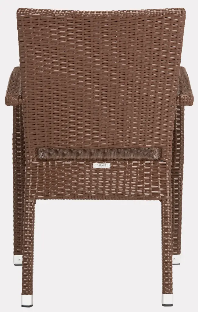 Comfortable and easy-care, the outdoor Armchair is sold in sets of two for stylish conversation groupings on the patio. Crafted of brown wicker with a aluminum frame, this transitional design is sleek and sophisticated. Store outdoor furniture indoors or cover well when not in use. Remove wooden furniture from standing water. Dust regularly with small brush or vacuum. Spills should be taken care of immediately before they harden or stain with a slightly dampened sponge. Do not use bleach solutions.