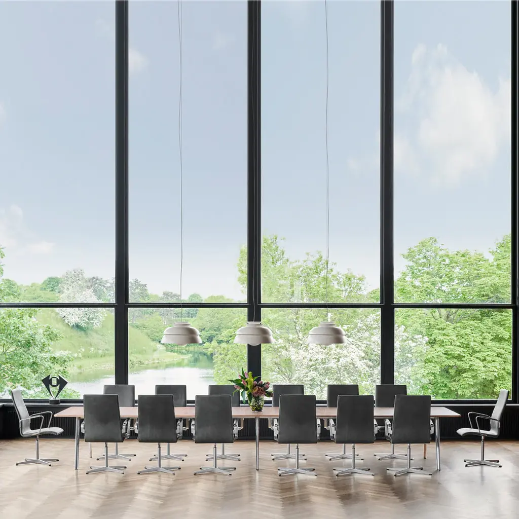 Originally designed by Arne Jacobsen for professors at St. Catherine's College at the University of Oxford, England, Fritz Hansen's elegant Oxford chair has since been upgraded for a new generation of workspaces to offer supreme sitting comfort and customisation to suit every modern need. Blending form with function, the medium-back 3243T is set on a four-star base with a fixed seat height tailored to desktops. Available with armrests which tuck neatly under tabletops. The minimalist design is cushioned for comfort and lumbar support for a more natural sitting posture. The minimalist design is cushioned for comfort and lumbar support and features a longer seat than its predecessor for a more natural sitting posture.