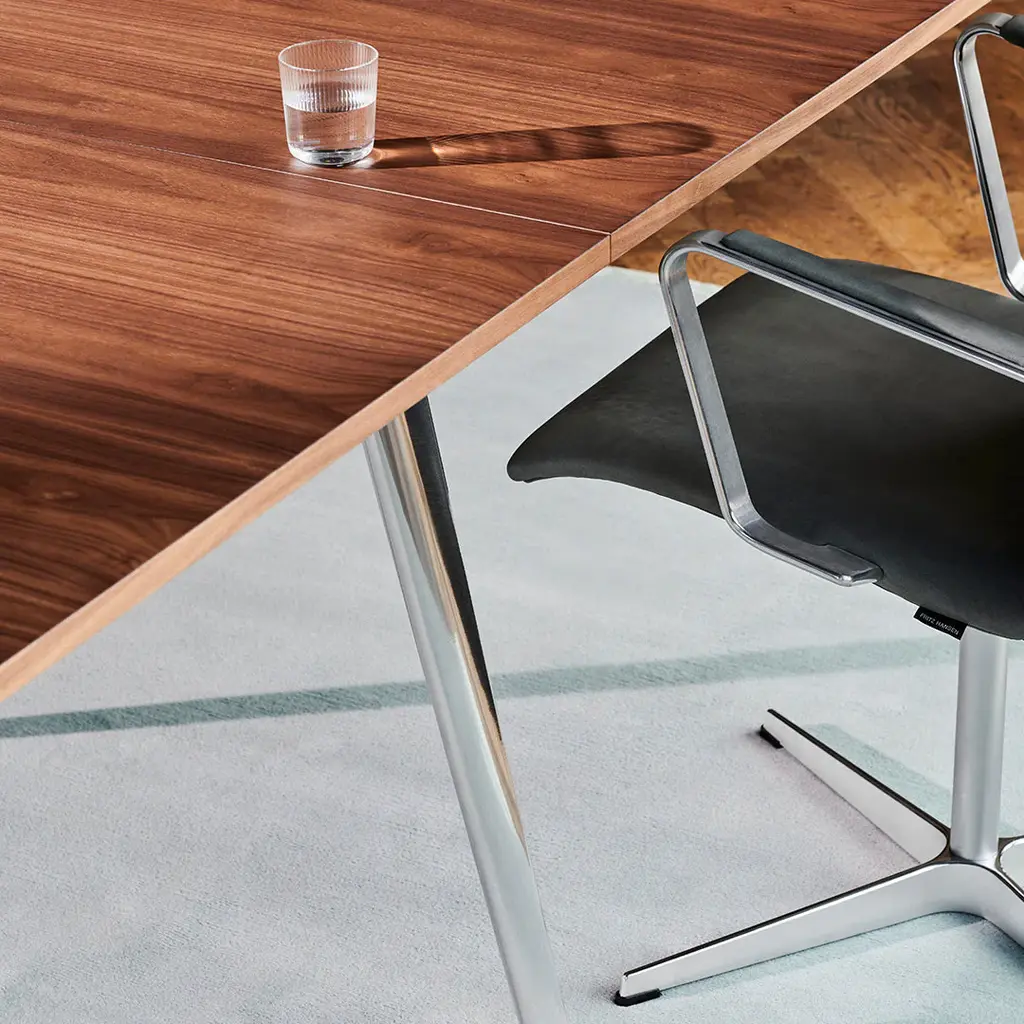 Originally designed by Arne Jacobsen for professors at St. Catherine's College at the University of Oxford, England, Fritz Hansen's elegant Oxford chair has since been upgraded for a new generation of workspaces to offer supreme sitting comfort and customisation to suit every modern need. Blending form with function, the medium-back 3243T is set on a four-star base with a fixed seat height tailored to desktops. Available with armrests which tuck neatly under tabletops. The minimalist design is cushioned for comfort and lumbar support for a more natural sitting posture. The minimalist design is cushioned for comfort and lumbar support and features a longer seat than its predecessor for a more natural sitting posture.