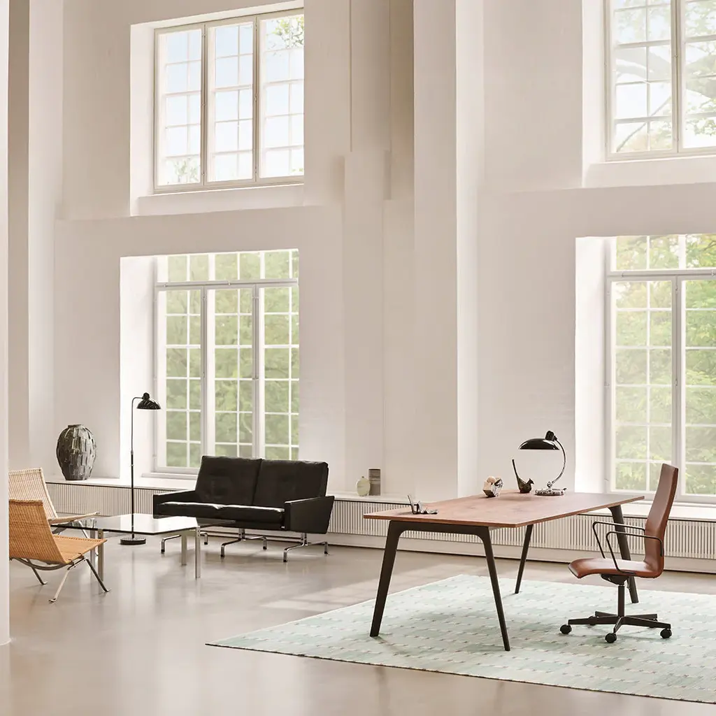 Originally designed by Arne Jacobsen for professors at St. Catherine's College at the University of Oxford, England, Fritz Hansen's elegant Oxford chair has since been upgraded for a new generation of workspaces to offer supreme sitting comfort and customisation to suit every modern need. Engineered for workspaces that require elegant and functional design, the medium back 3293W is set on a five-star base with casters for ease of movement. With an adjustable seat height and tilt mechanism, it adjusts to every working need. Available with armrests which tuck neatly under tabletops. The minimalist design is cushioned for comfort and lumbar support for a more natural sitting posture.