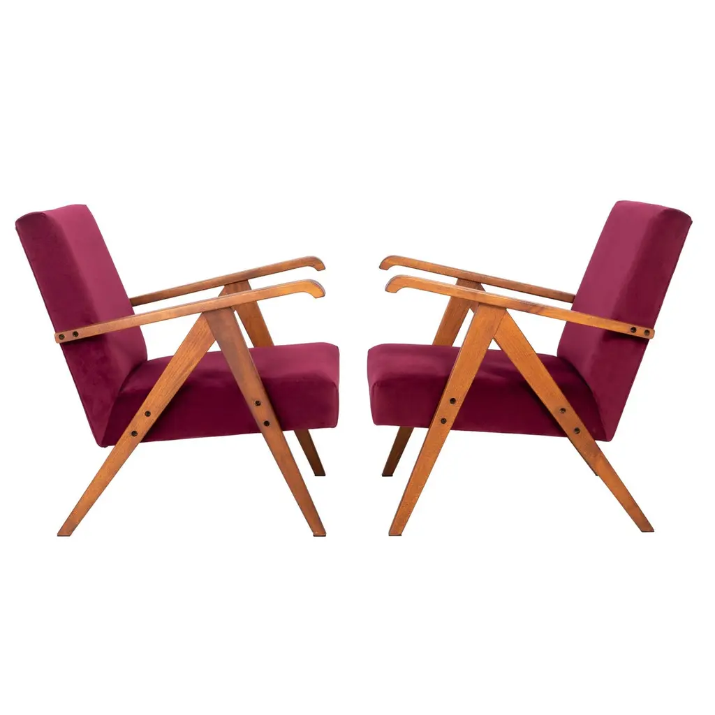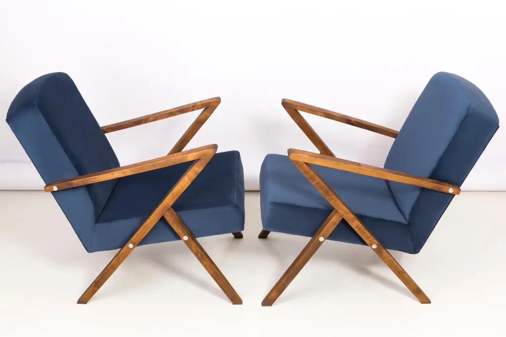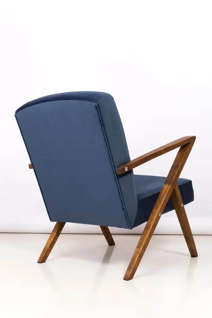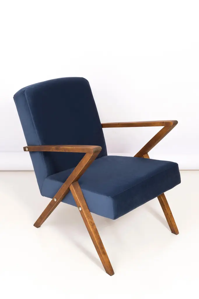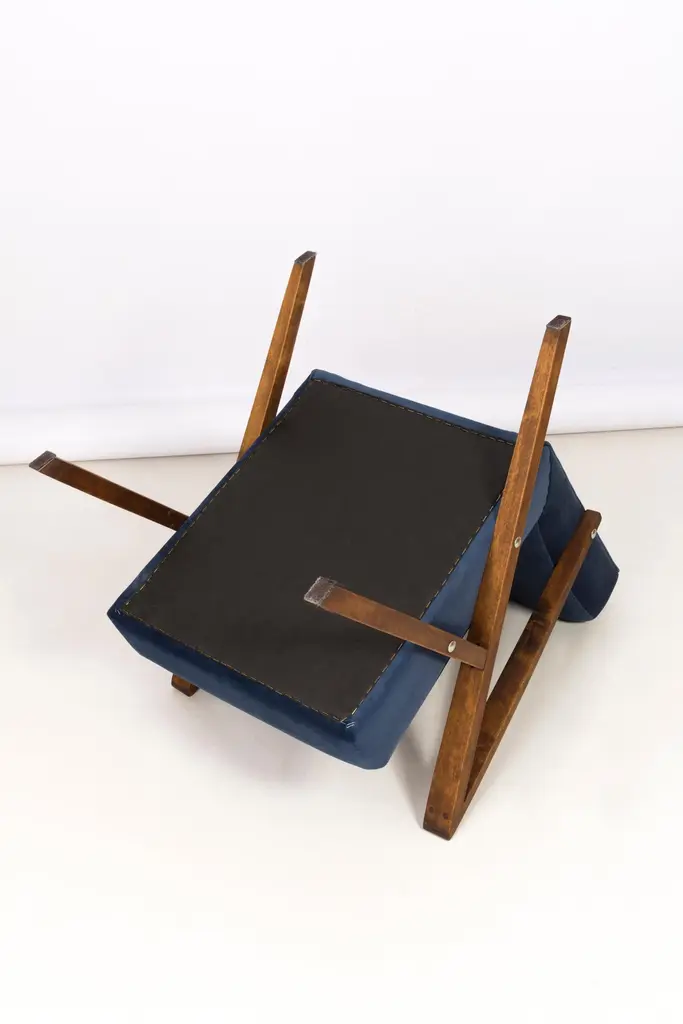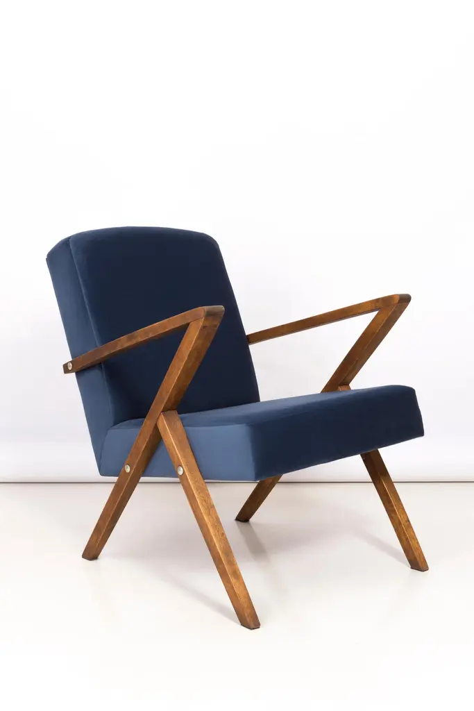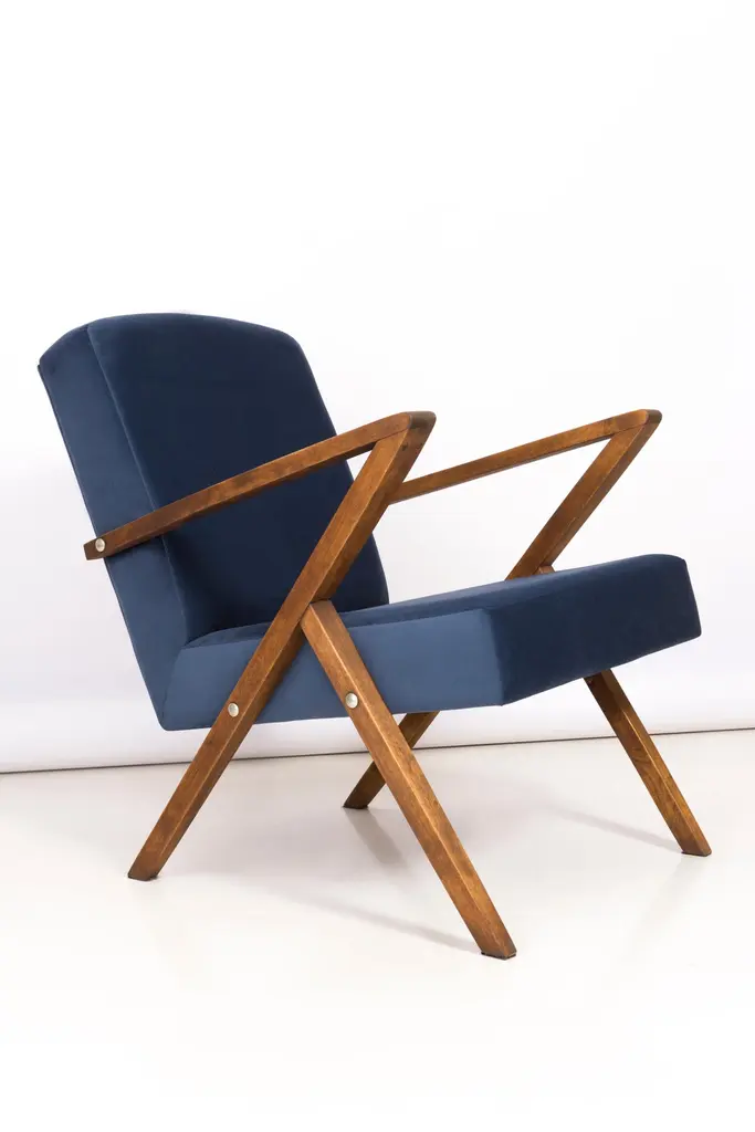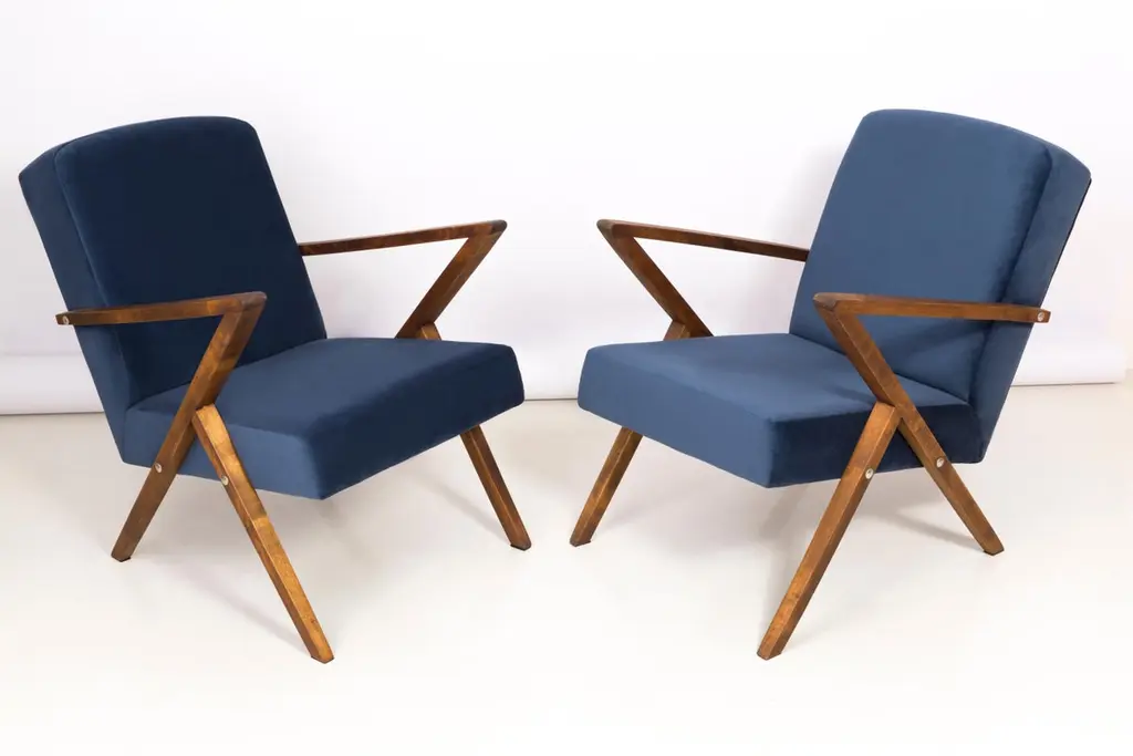 A pair of armchairs manufactured at the Bydgoszcz Renewal Cooperative in the 1970s. The armchairs are after a comprehensive renovation of carpentry and upholstery. The wood has been cleaned, cavities completed, painted with dark walnut stain, finished with varnish. Upholstery interiors replaced, upholstered in high-quality dark blue velvet fabric. We can prepare this set in another wood or fabric color.