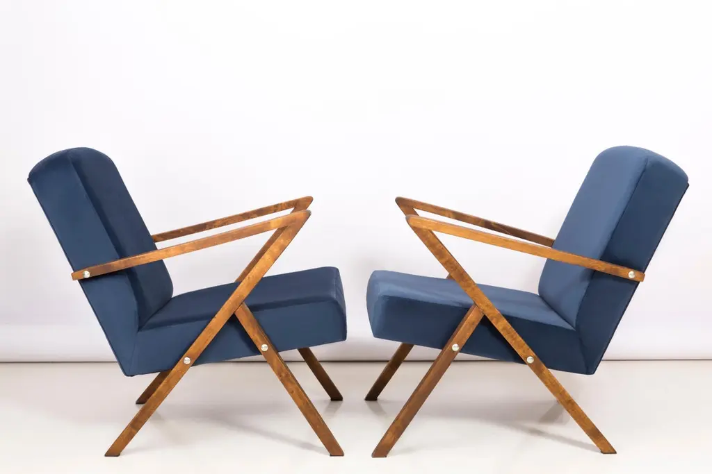 Pair Of 20th Century Unique Zet Armchairs, Navy Velvet, 1970s, Poland