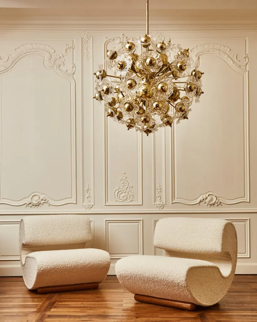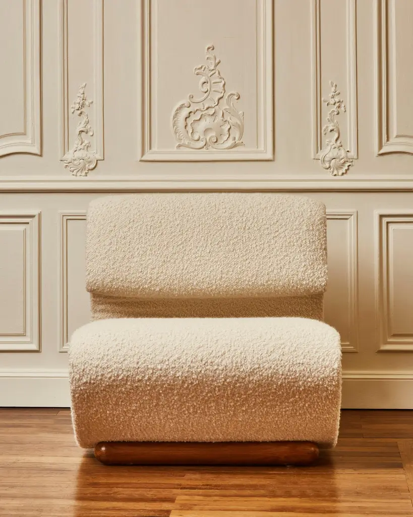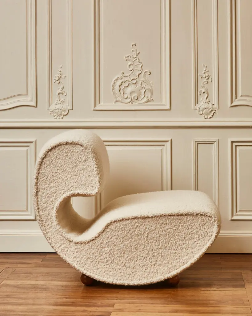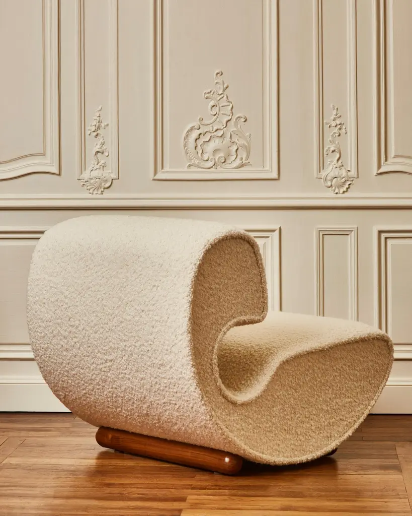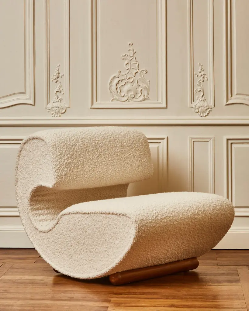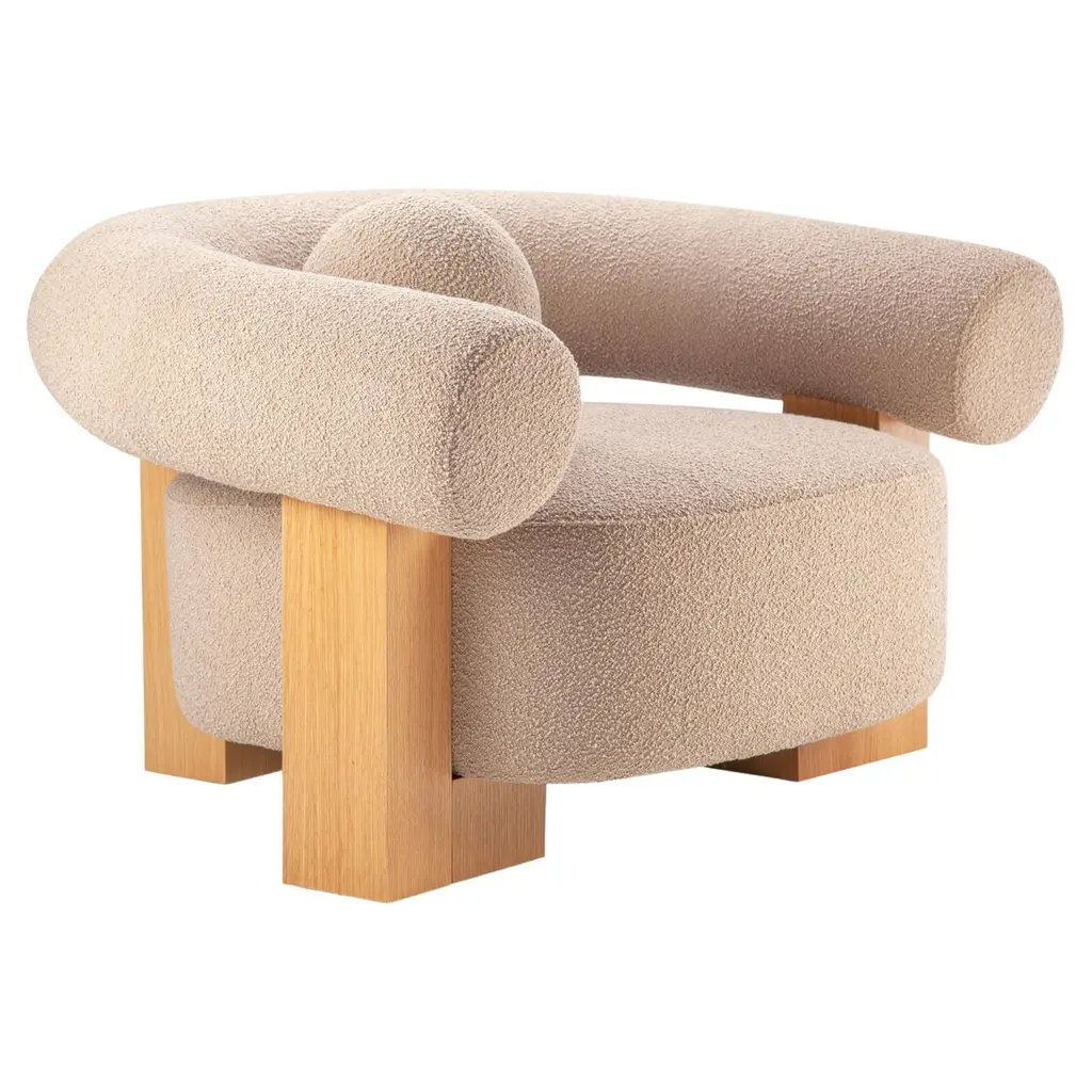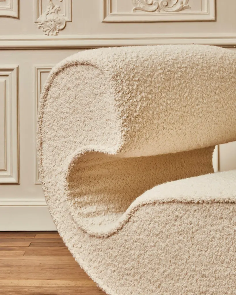 Superb pair of unusual shaped armchairs upholstered with a bouclette fabric.Creation by Studio Glustin.
