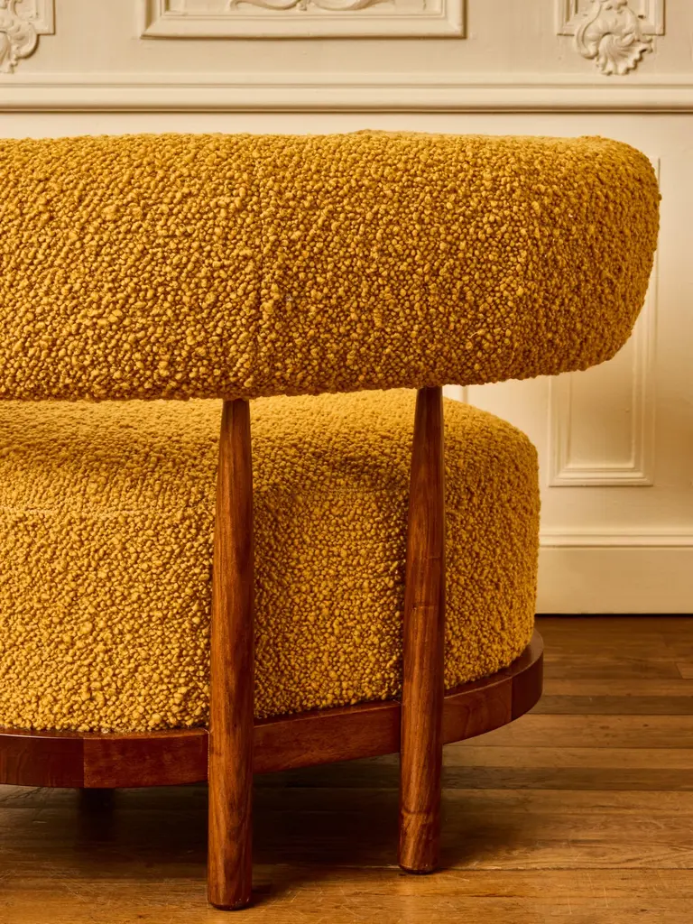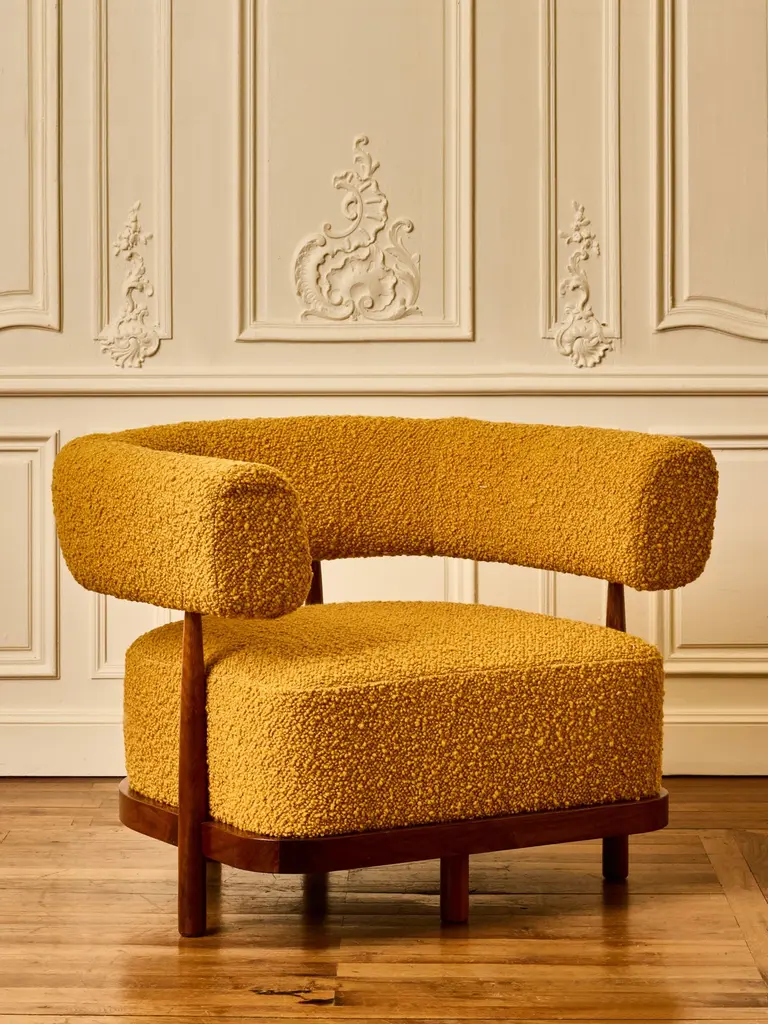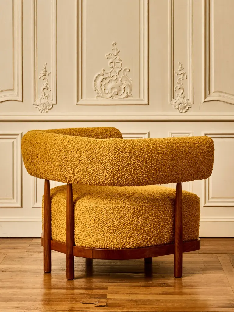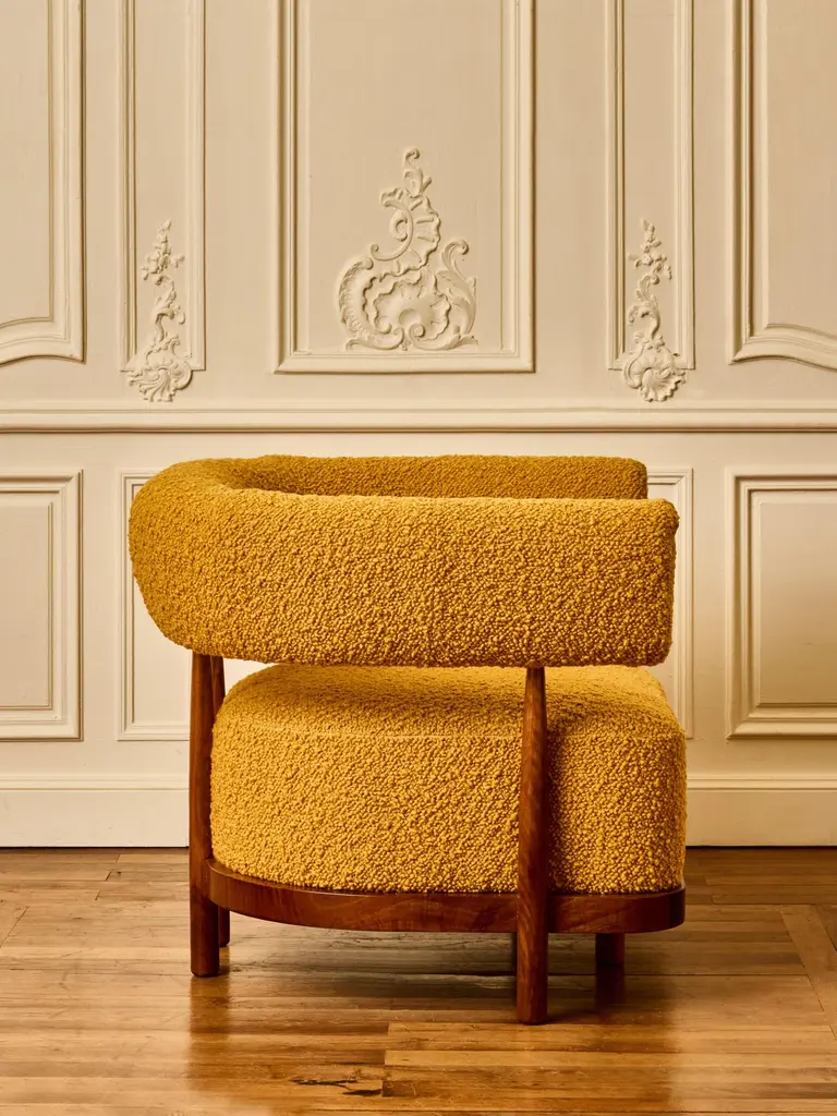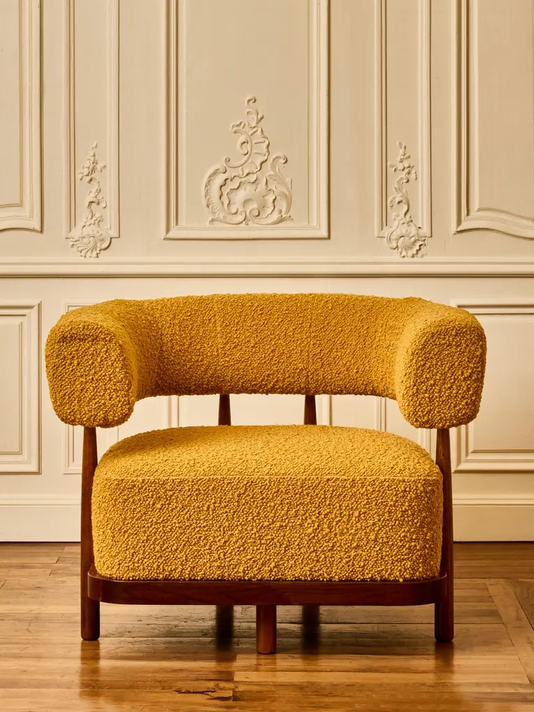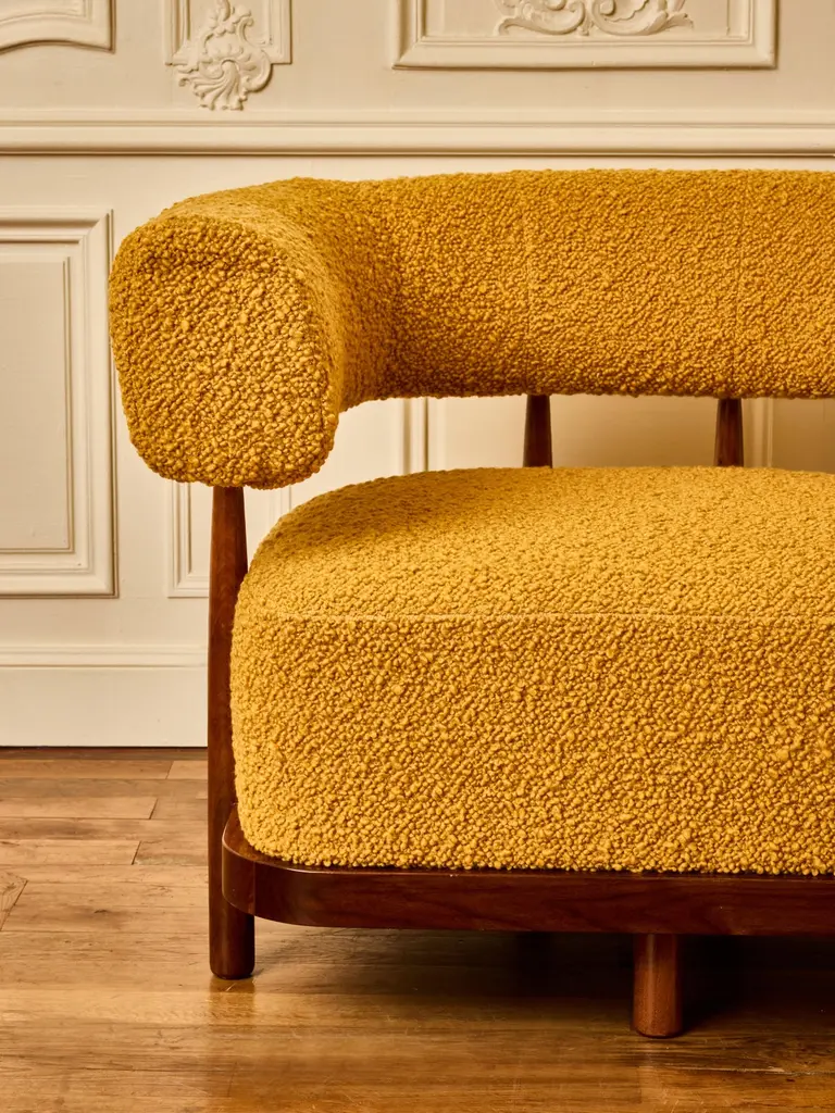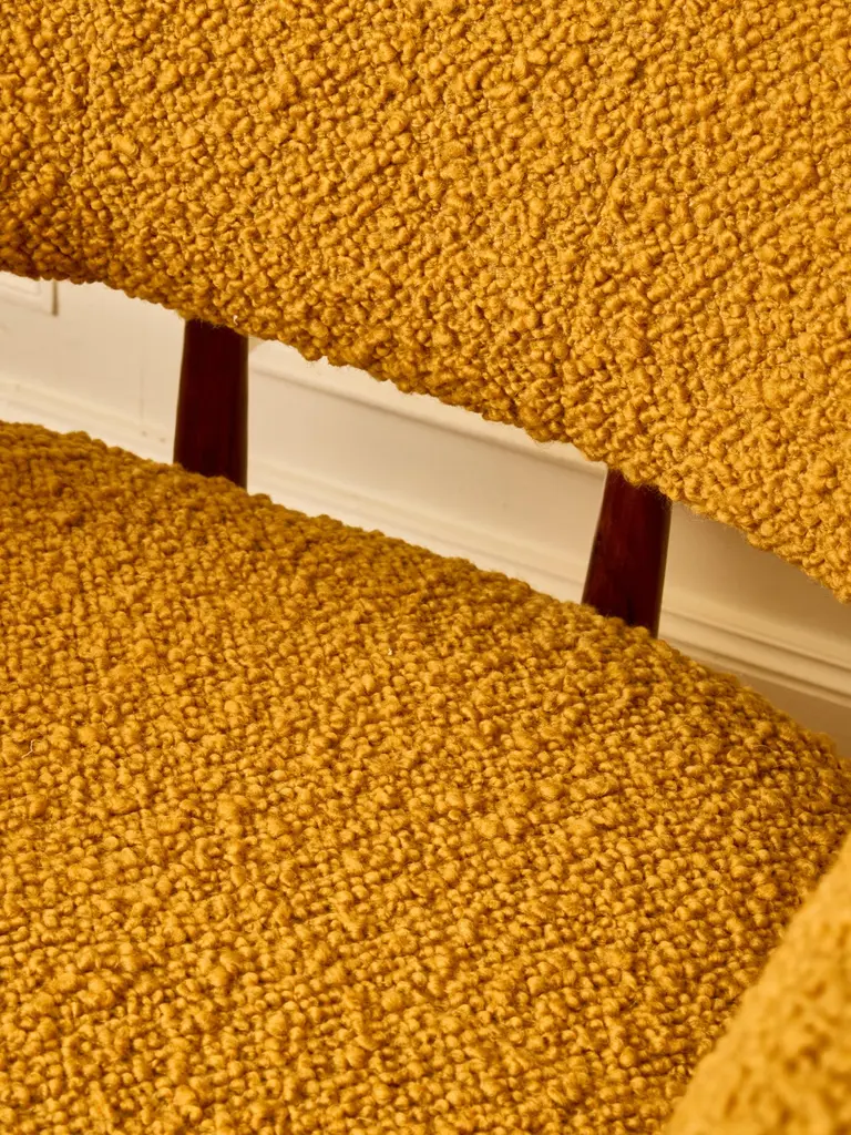 Pair of wooden armchairs upholstered with a "Mustard" bouclette fabric.Italy, 2025
