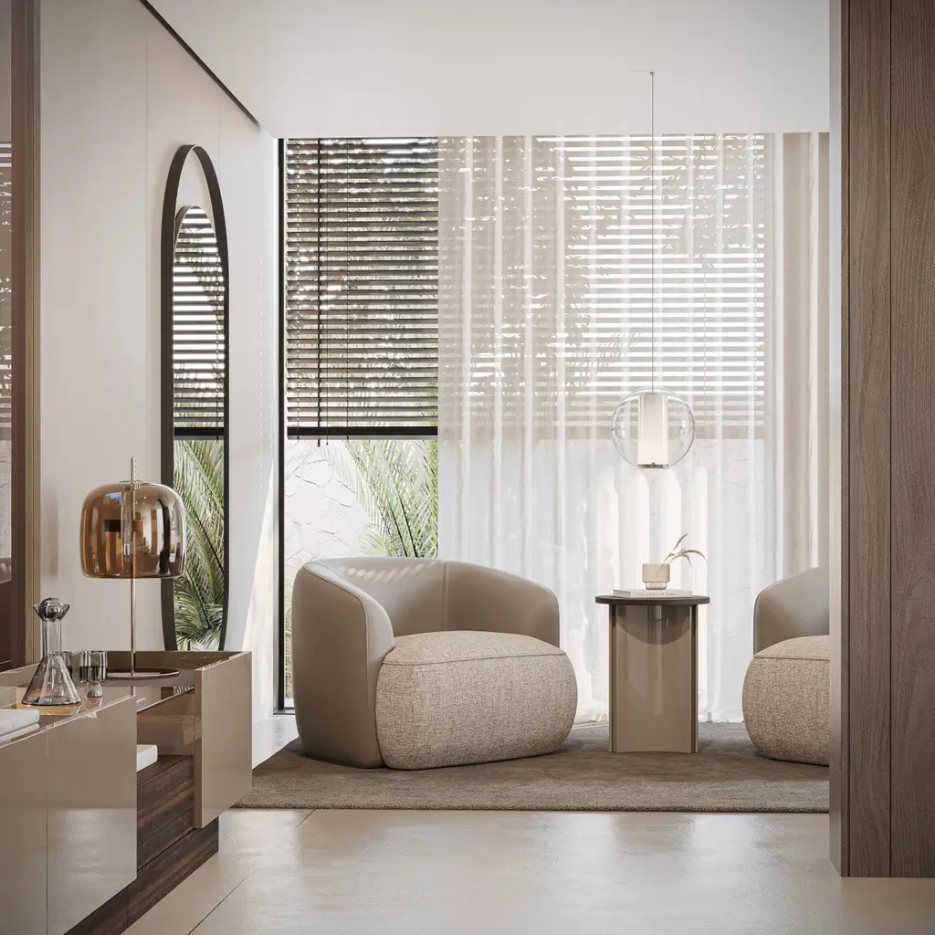 This set of two armchairs is fully upholstered in soft boucle fabric, offering a luxurious wool-like texture that combines comfort with contemporary sophistication. Designed to complement each other, the pair creates a harmonious and balanced aesthetic, making them ideal for modern interiors. Their enveloping curved silhouettes and plush upholstery exude warmth and elegance, while their thoughtful design ensures they work beautifully together to elevate any living space. Perfect as a duo in a lounge or seating area.We do our best to expedite production and to ship and deliver product within the listed lead time, however current lead times might be longer due to global shipping backlog and delays. These delays are out of our control and cannot be a reason to cancel an order.