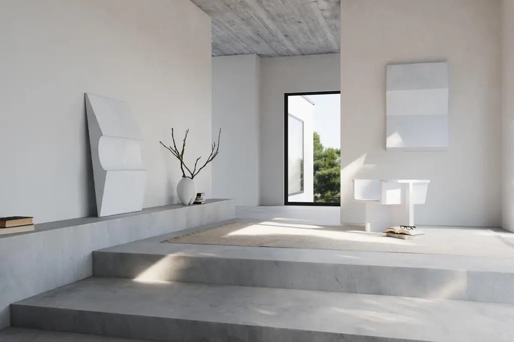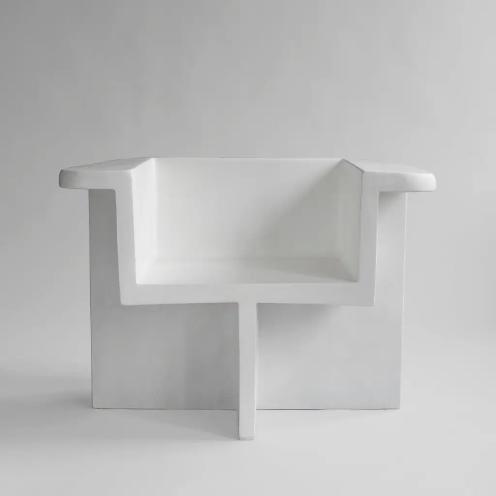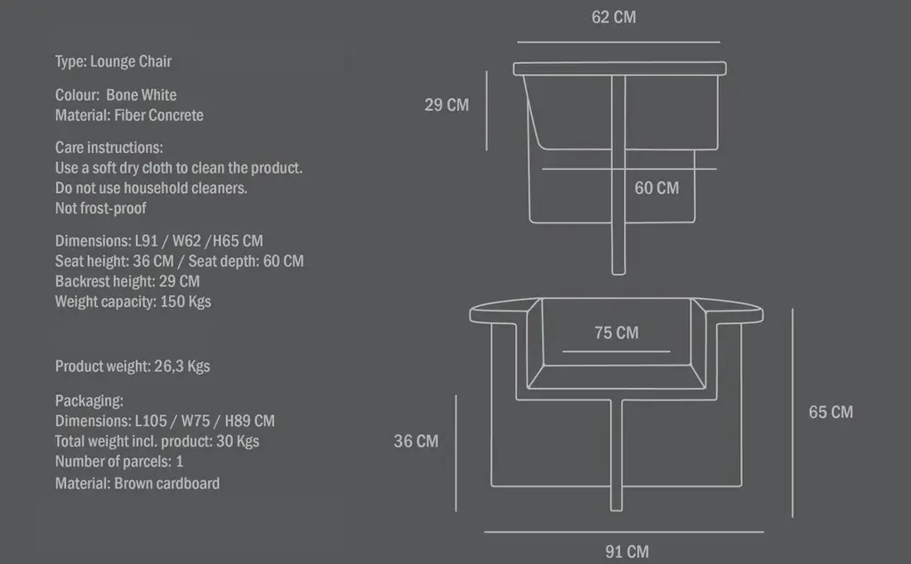 Pair of Brutus style armchairs, contemporary - Bone White - concrete and moulded fibre, mid 20th century design.Pair of Brutus armchairs in white, sculptural designs for modern interiors. Made from concrete and moulded fibre in a coffee colour, each armchair is hand-painted to create a unique textured finish. With its clean architectural lines and soft curves to the back and armrests, this chair offers both visual impact and welcoming comfort. Pairs well with the Brutus lounge cushions in anthracite and taupe.Set includes: 2 armchairsColour: bone whiteMaterial: fibre-reinforced concreteDimensions: L: 91 cm, W: 62 cm, H: 65 cmSeat height: 36 cmSeat depth: 60 cmBack height: 29 cmLoad capacity: 150 kgProduct weight: 26,3 kgGoes well with:Brutus lounge cushion - Anthracite - € 89.00Brutus lounge cushion - Taupe - €89.00
