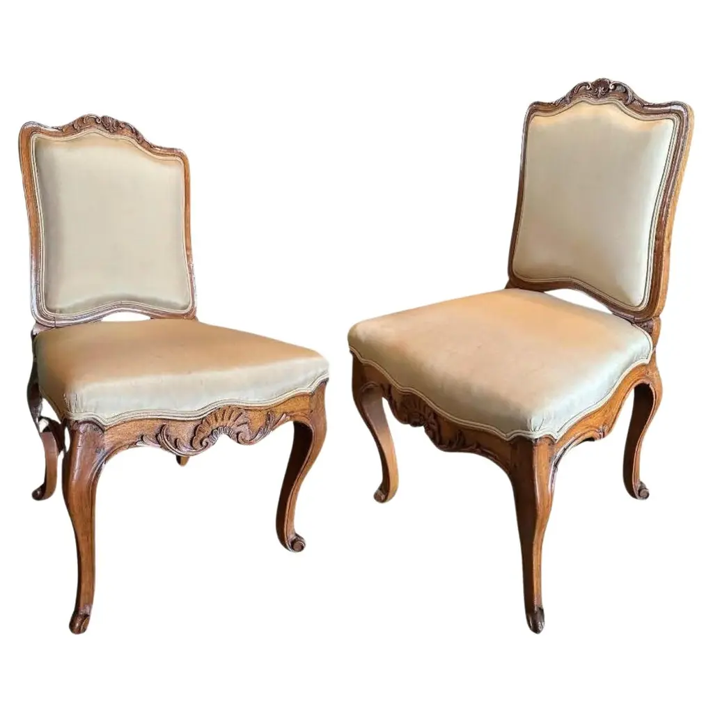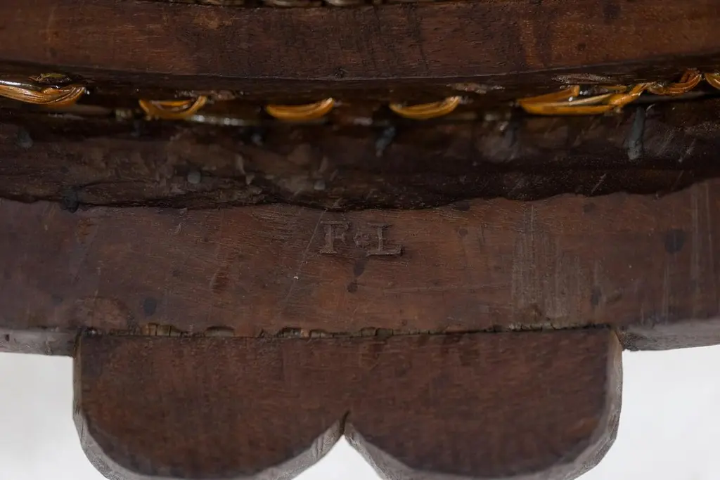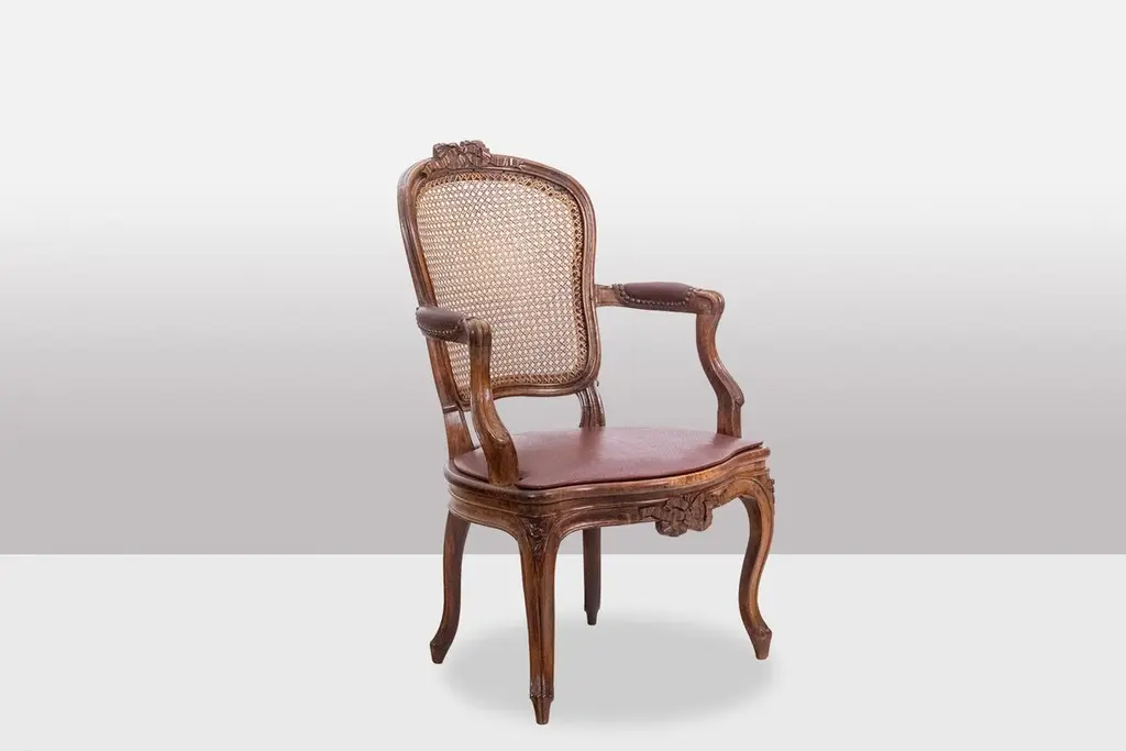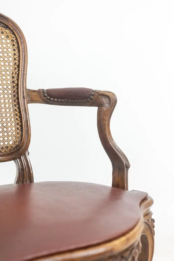 F.L., stamped.Pair of “cabriolet” armchairs in walnut, decorated with ribbons at the top of the back and in the center of the belt. Cane seat and back, the seat covered with a leather pad in red tones. Curved base ending in a decoration of fine flowers at the top. Armrests slightly set back from the seat, with their cuffs.Work from the Rhone valley from the Louis XV period, circa 1760.Dimensions: H 95 x L 61 x D 51Reference: LS5209325/2750/4