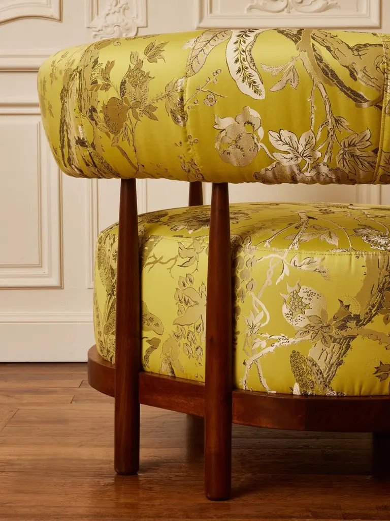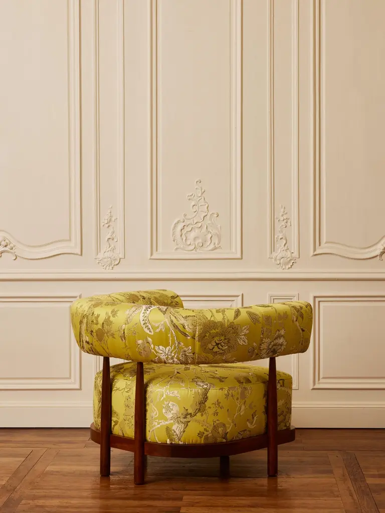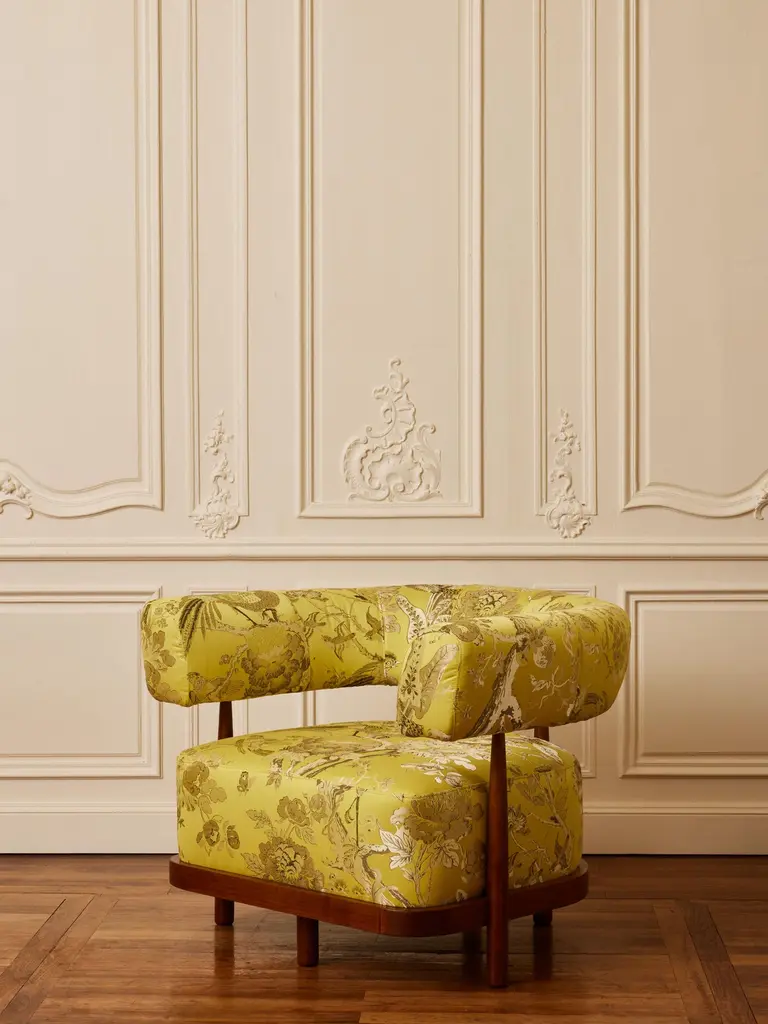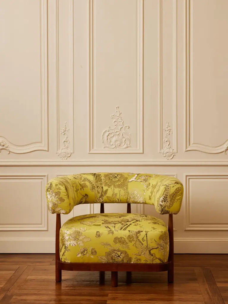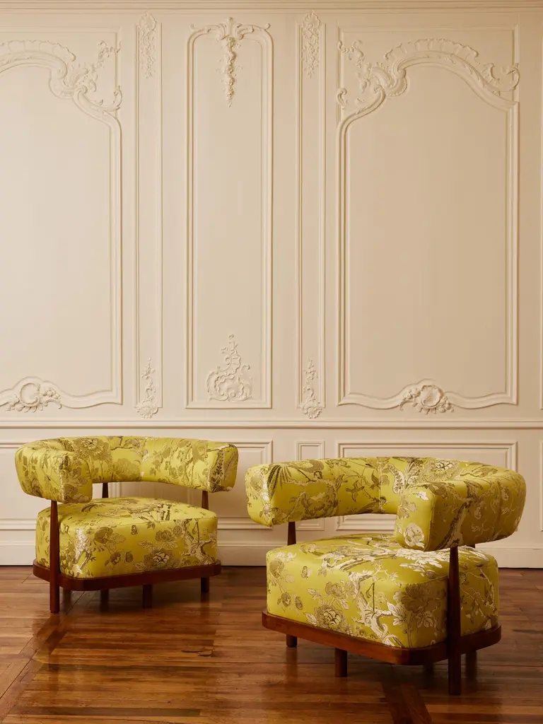 Pair of wooden armchairs with custom reupholstered with a fabric by Dédar.Creation by Studio Glustin.
