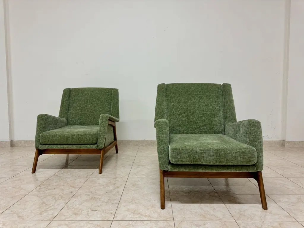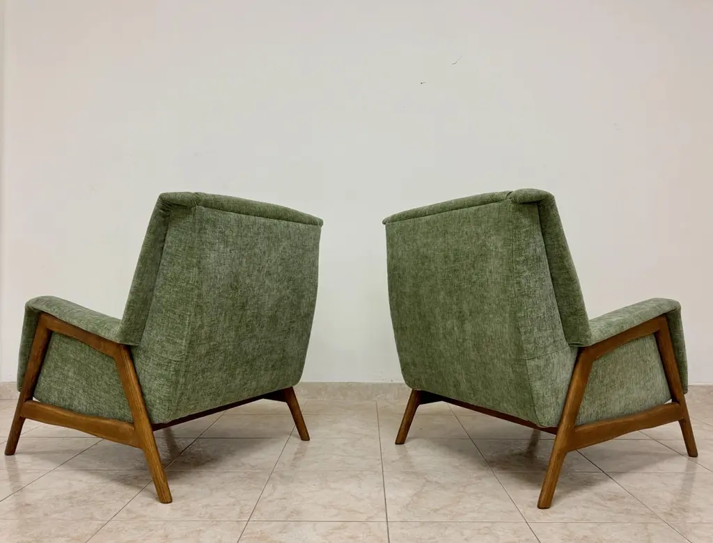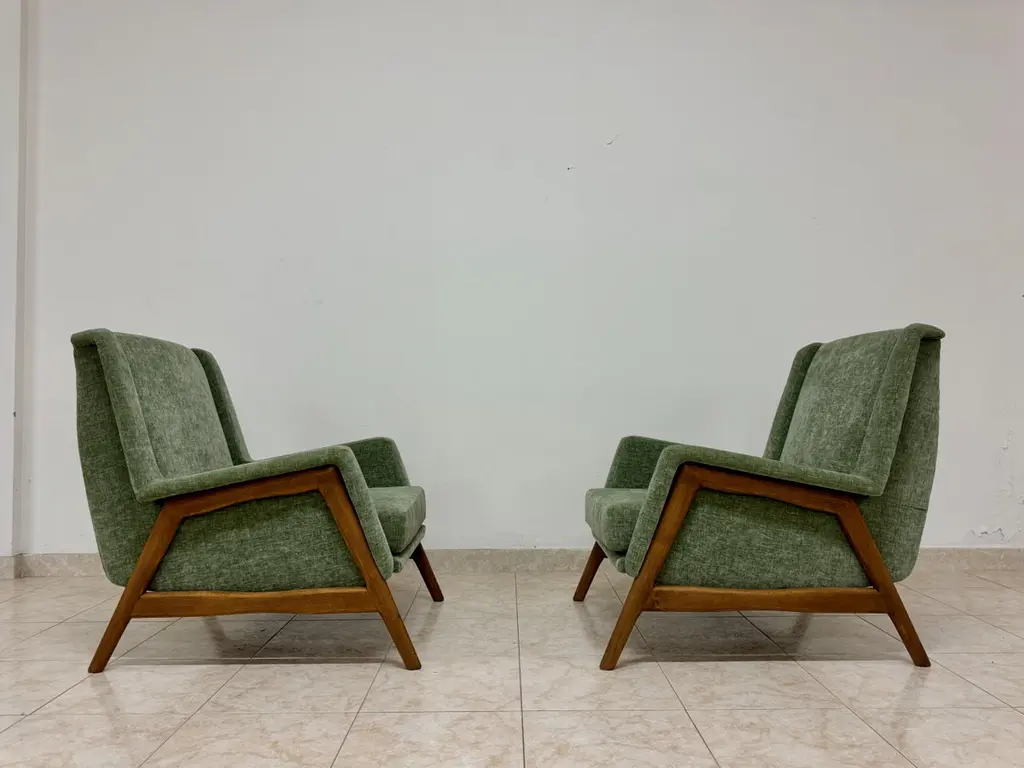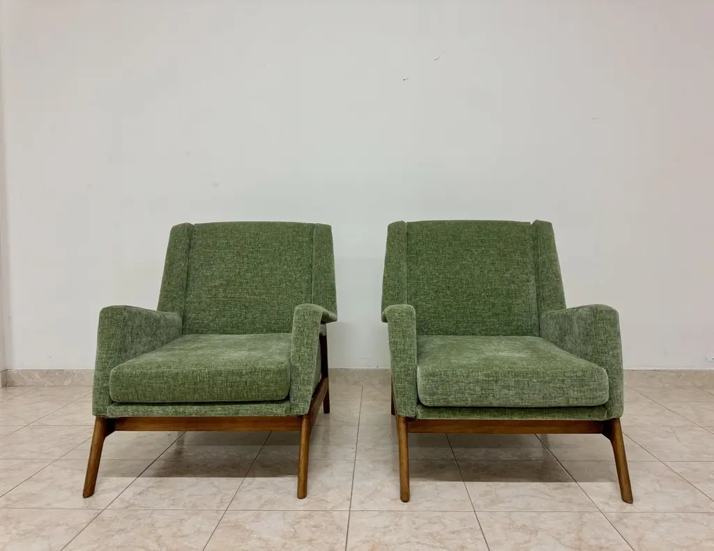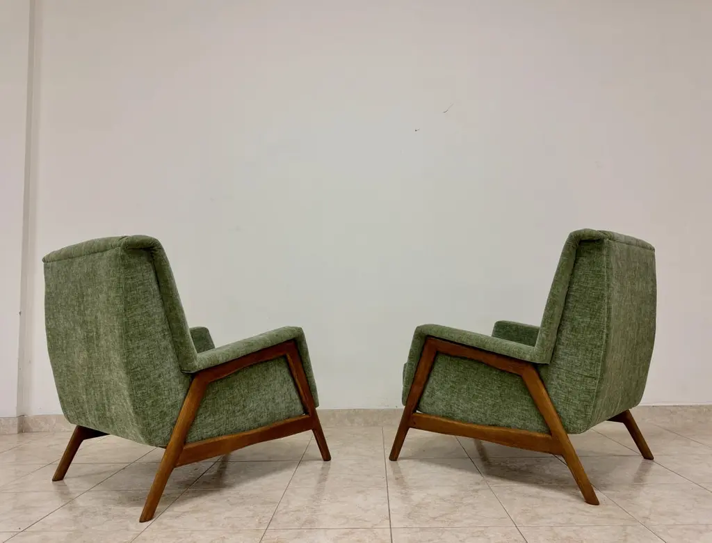 Pair of armchairsNicely shaped and constructedBeech frameFabric seatChoice of fabrics availableMade in ItalyContemporaryIf not held in stock will be made to orderCan be purchased individuallyThese contemporary Italian armchairs are a masterful tribute to mid-century modern design, crafted with precision and an eye for detail. They combine elegance with comfort, making them an ideal addition to any sophisticated interior.The frames of the armchairs are constructed from beech, featuring a warm, natural finish that highlights the beautiful grain of the material. The design of the frame, with its clean lines and angled legs, reflects the timeless aesthetic of mid-century modern furniture while providing robust support.Upholstered in a green fabric, the seating and backrest offer a plush, inviting experience. The fabric is not only soft to the touch but also durable, ensuring the armchairs remain a stylish and functional part of your living space for years to come. The rich green hue adds a touch of colour and sophistication, complementing the wooden frame and enhancing the overall design.The armrests are padded and upholstered with the same fabric, ensuring maximum comfort and a cohesive look. The slightly reclined backrest and generous seat dimensions make these armchairs perfect for relaxation, providing ergonomic support and comfort.Made in Italy, these armchairs are a testament to the skill and dedication of Italian artisans. They are designed to offer both aesthetic appeal and practical comfort, making them a perfect choice for anyone looking to elevate their home decor with a touch of mid-century elegance and contemporary sophistication.