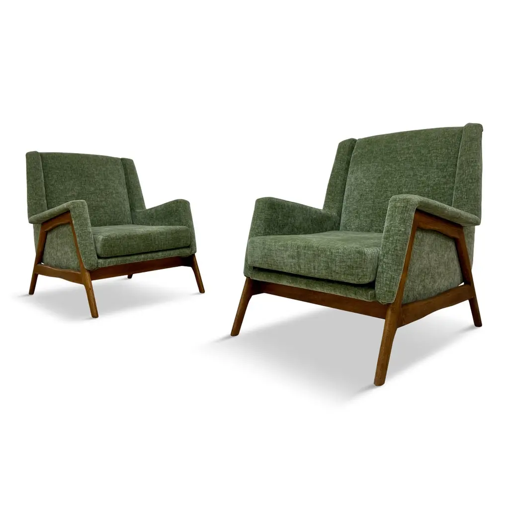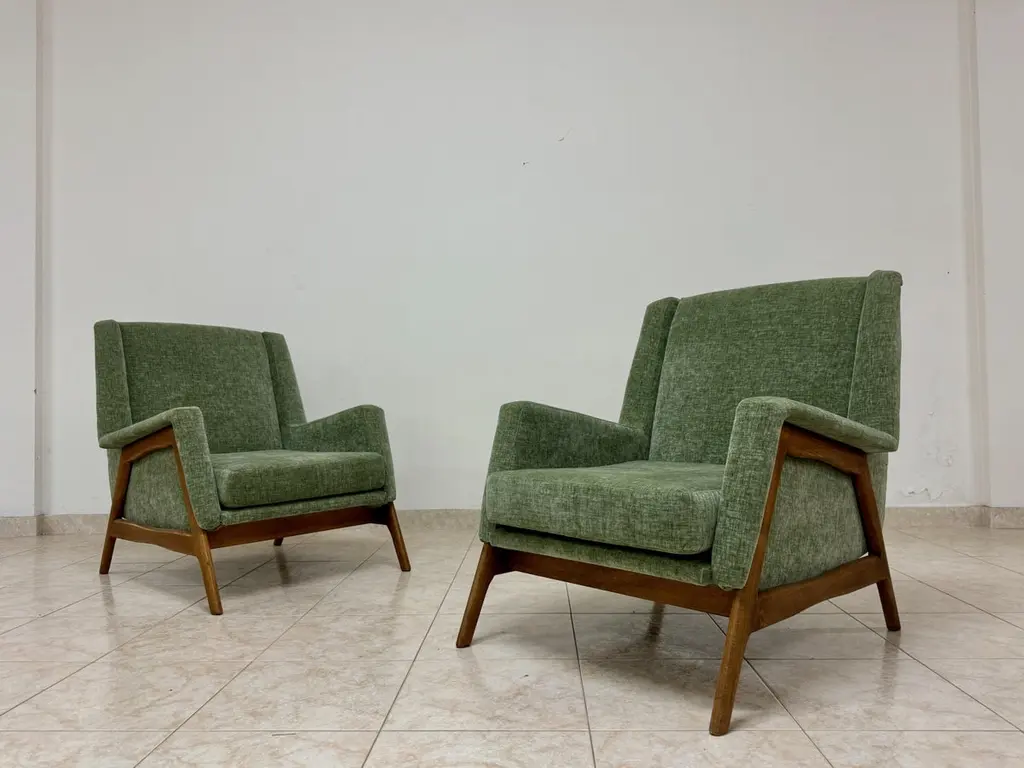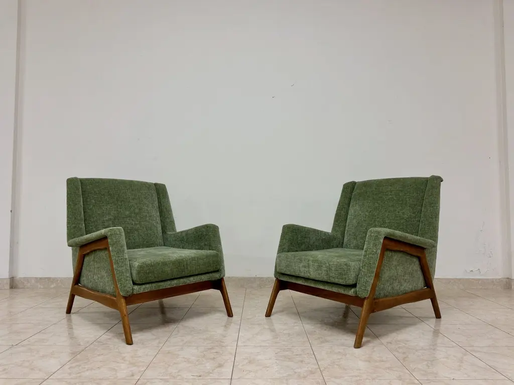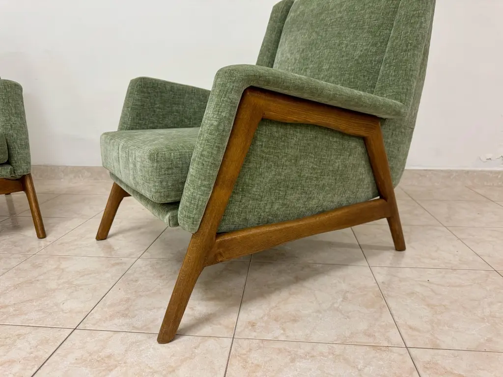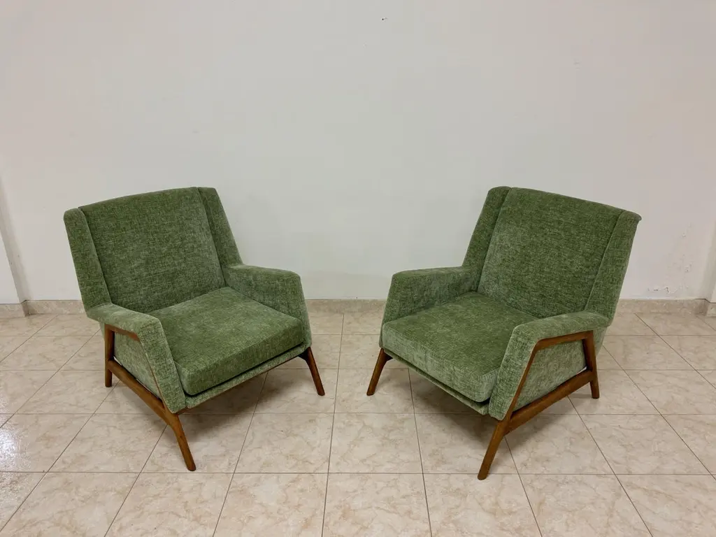 Pair of armchairsNicely shaped and constructedBeech frameFabric seatChoice of fabrics availableMade in ItalyContemporaryIf not held in stock will be made to orderCan be purchased individuallyThese contemporary Italian armchairs are a masterful tribute to mid-century modern design, crafted with precision and an eye for detail. They combine elegance with comfort, making them an ideal addition to any sophisticated interior.The frames of the armchairs are constructed from beech, featuring a warm, natural finish that highlights the beautiful grain of the material. The design of the frame, with its clean lines and angled legs, reflects the timeless aesthetic of mid-century modern furniture while providing robust support.Upholstered in a green fabric, the seating and backrest offer a plush, inviting experience. The fabric is not only soft to the touch but also durable, ensuring the armchairs remain a stylish and functional part of your living space for years to come. The rich green hue adds a touch of colour and sophistication, complementing the wooden frame and enhancing the overall design.The armrests are padded and upholstered with the same fabric, ensuring maximum comfort and a cohesive look. The slightly reclined backrest and generous seat dimensions make these armchairs perfect for relaxation, providing ergonomic support and comfort.Made in Italy, these armchairs are a testament to the skill and dedication of Italian artisans. They are designed to offer both aesthetic appeal and practical comfort, making them a perfect choice for anyone looking to elevate their home decor with a touch of mid-century elegance and contemporary sophistication.