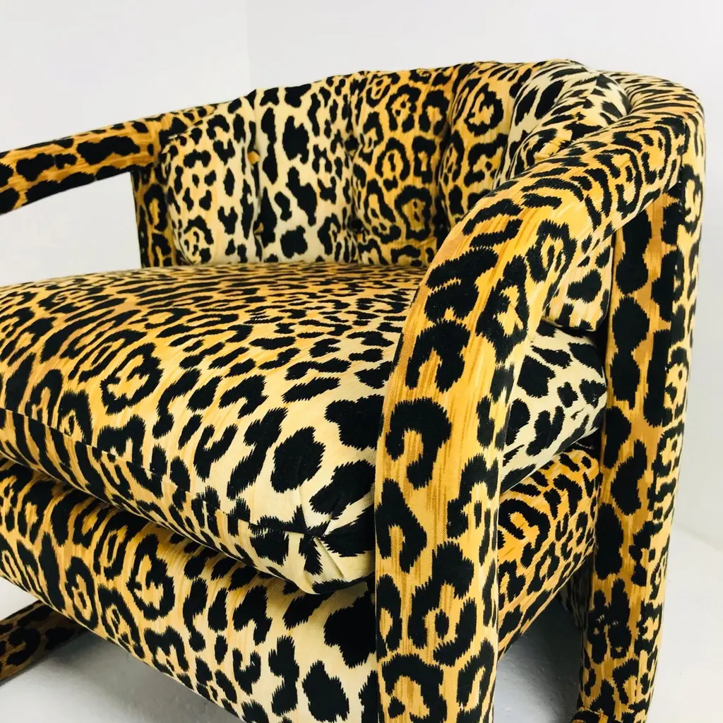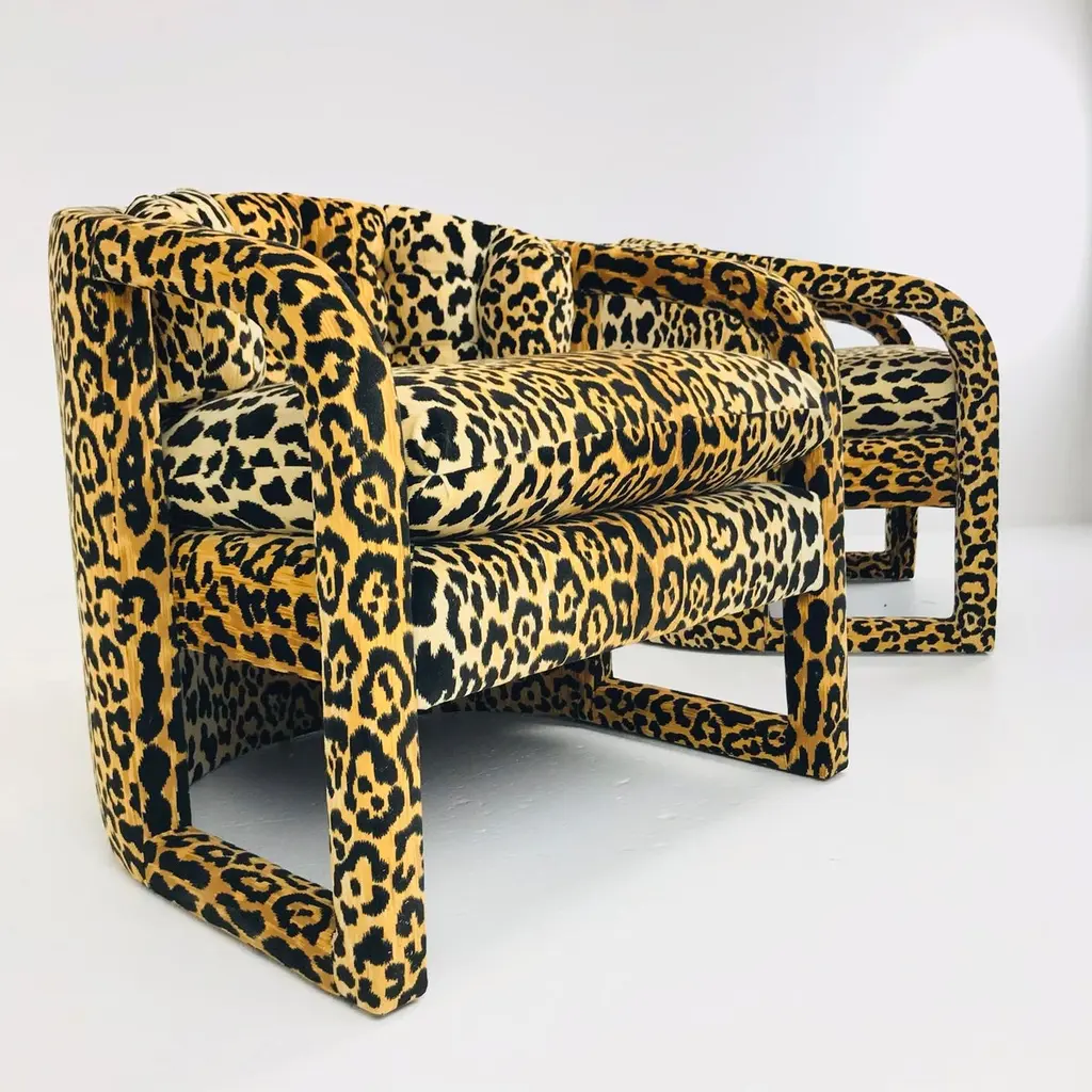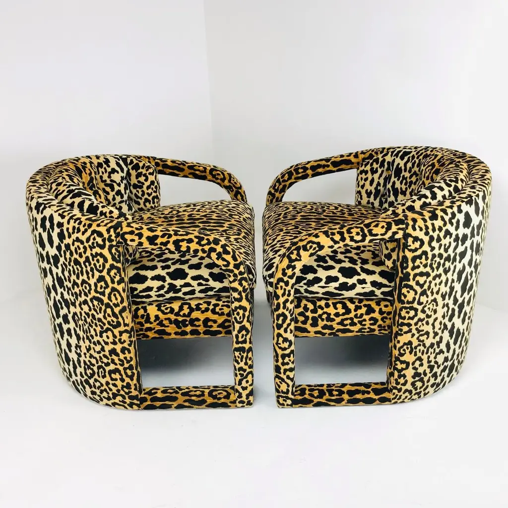 Gorgeous pair of barrel-back cutout armchairs in custom leopard velvet. Made to order and can be modified to your specifications. Available at $5800 (as shown), or in choice of fabric for $5600 + 8 yards COM.