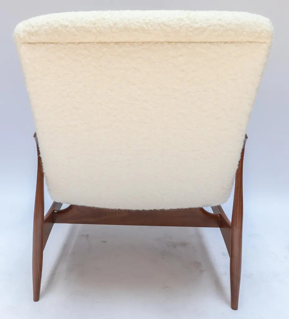 Pair of custom armchairs in American Walnut and Italian ivory boucle. Made in Los Angeles by Adesso Imports. Can be done in different woods, finishes and fabrics.