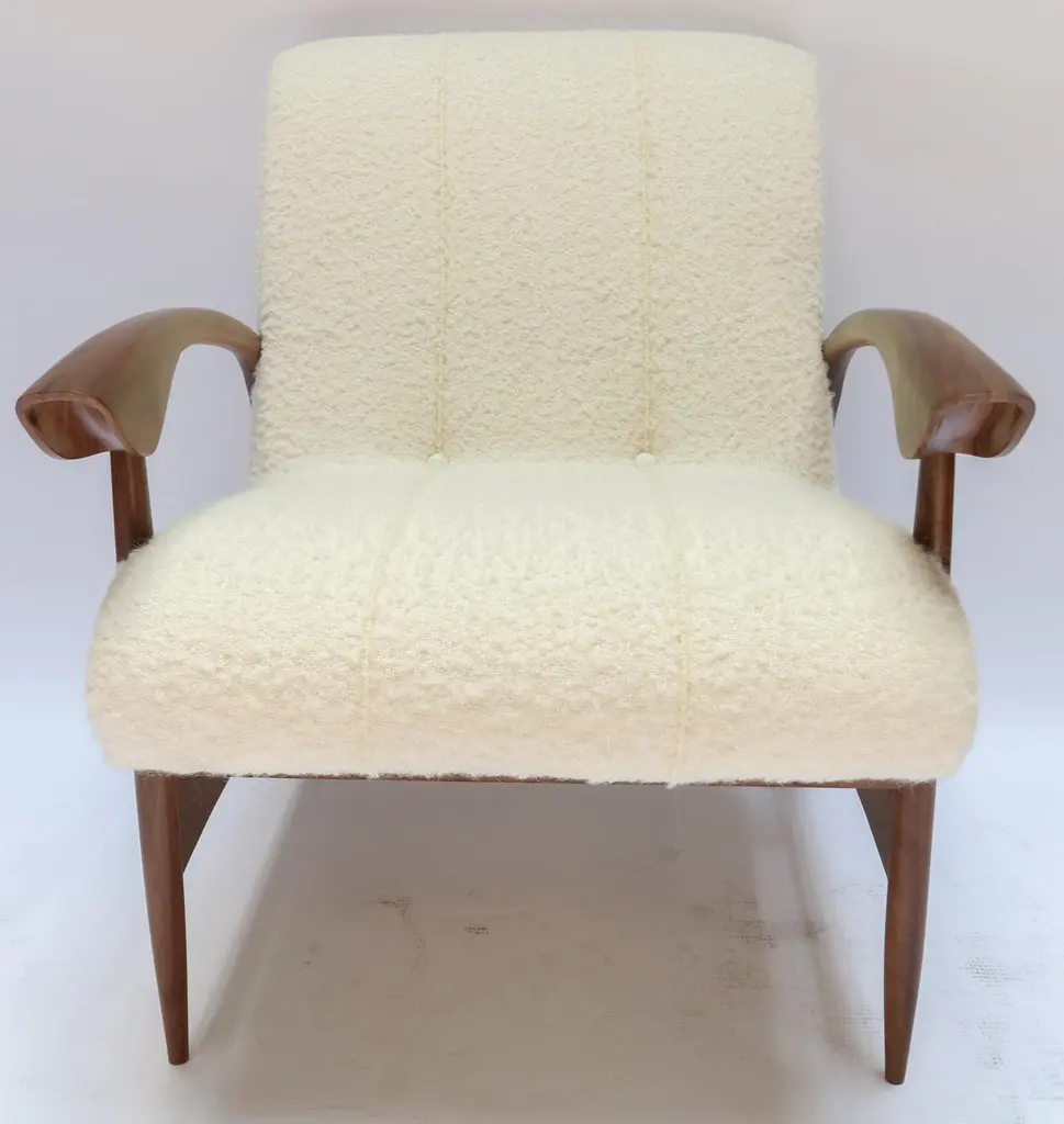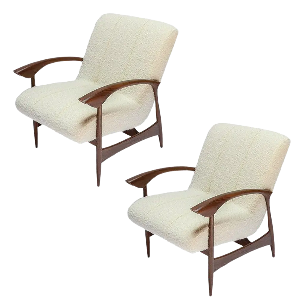Pair Of Custom Walnut Armchairs In Ivory Boucle By Adesso Imports