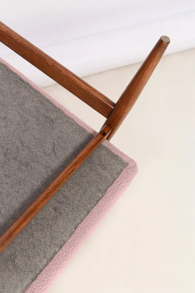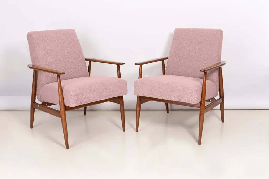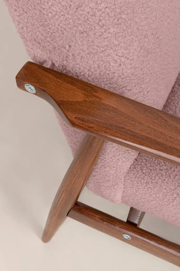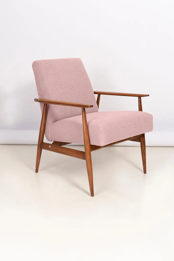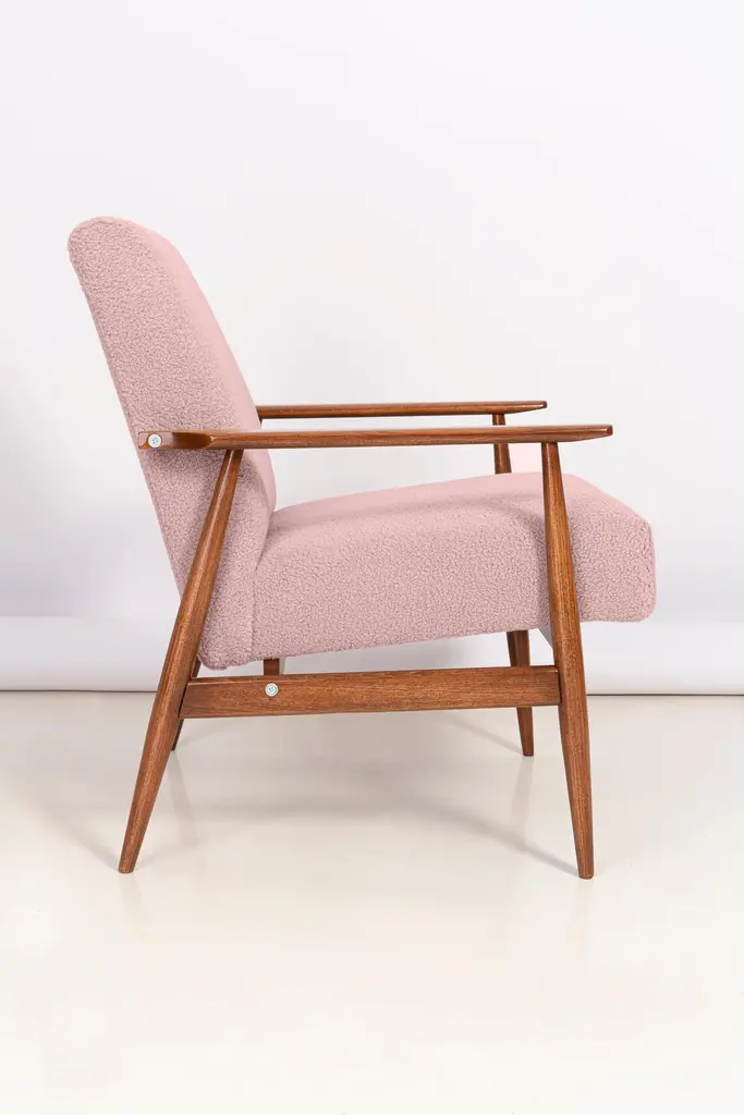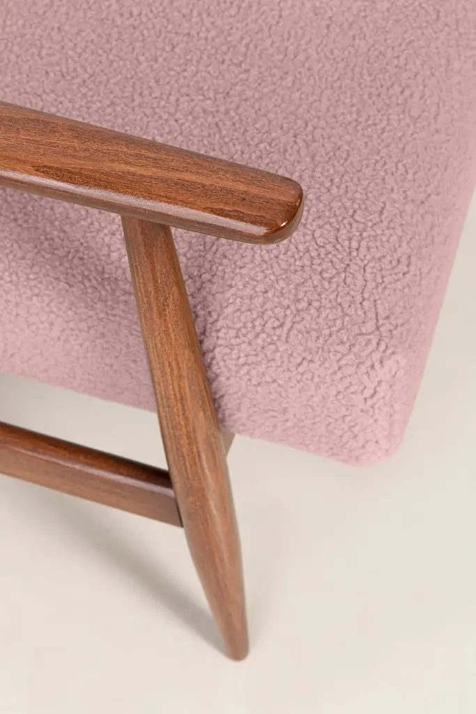 A pair of dusty pink bouclé armchairs, designed by Henryk Lis. Furniture after full carpentry and upholstery renovation. The armchairs will be perfect in Minimalist spaces, both private and public. Upholstery - faux fur has a structure reminiscent of a dense, fleshy, slightly rough sheep fleece. This is one of those upholstery fabrics whose haptic (tactile) qualities are as important as strength, pattern or color. It is characterized by a knotty weave, high basis weight and abrasion resistance. It is available in 10 subdued colors, inspired by the natural colors of wool. Used fabric it's color 03 from the last picture. We can prepare this armchairs in different color of fabric and wood.