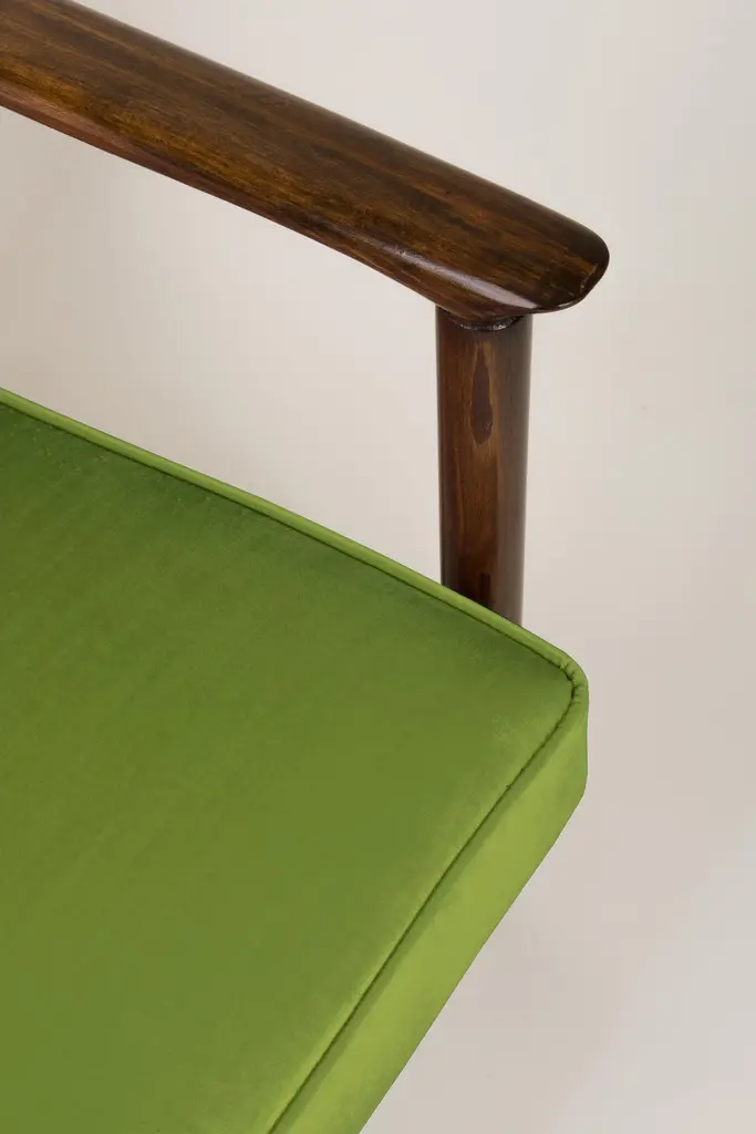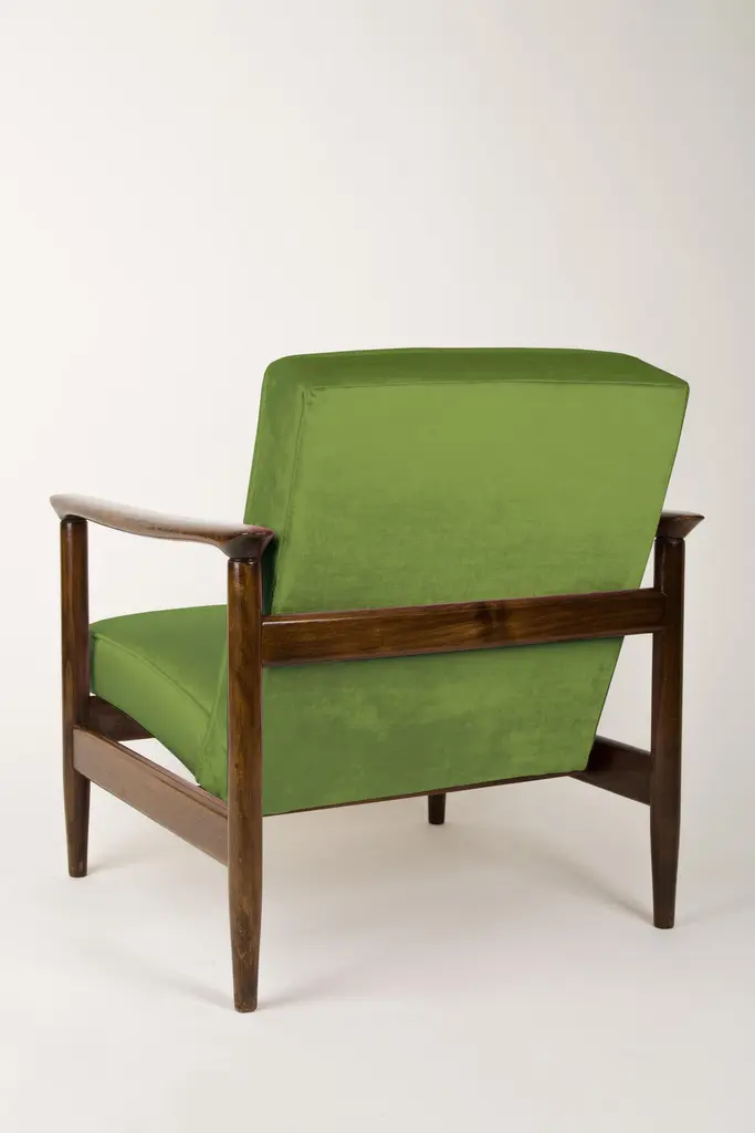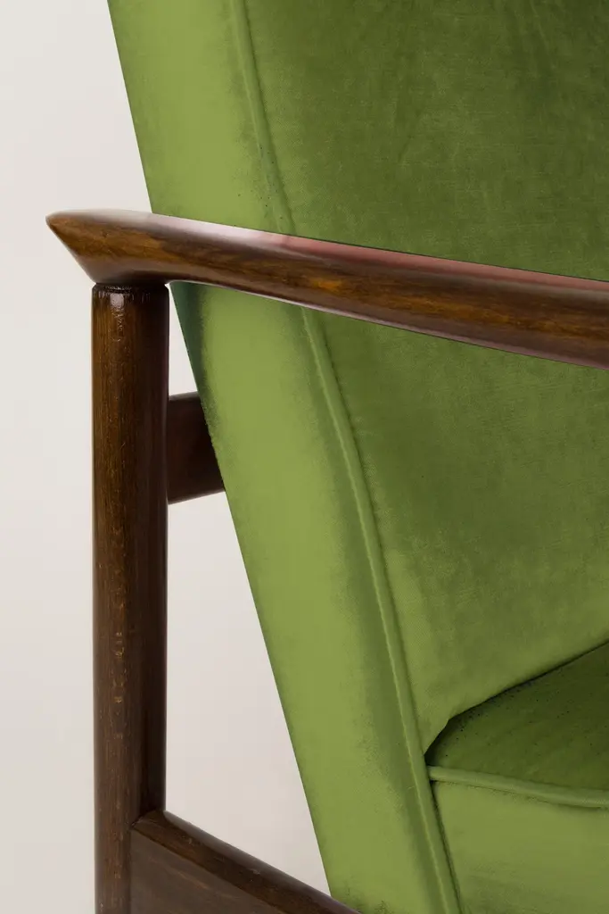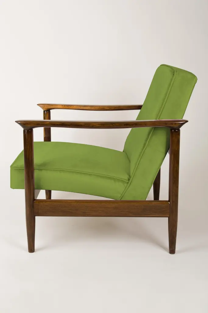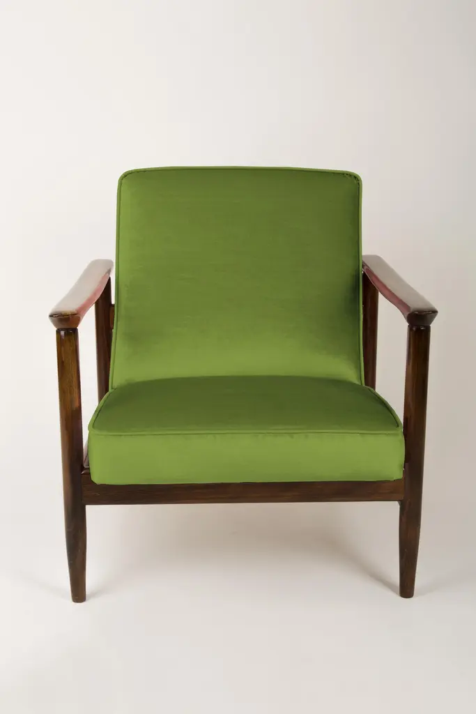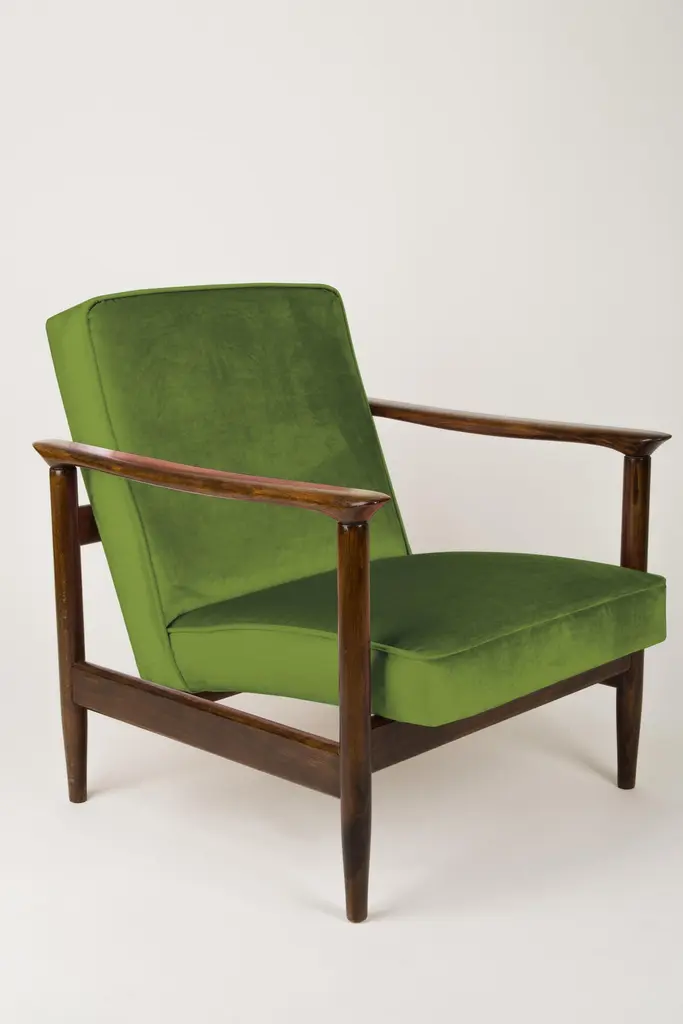 A pair of armchairs GFM-142, designed by Edmund Homa. The armchairs were made in the 1960s in the Gosciecinska Furniture factory. They are made from solid beechwood. The GFM-142 armchair is regarded one of the best polish armchair design from the previous age. The armchairs have been thoroughly renovated. The tension belts have been changed, new upholstery foams, upholstery material has been used, green upholstery fabric of the highest quality.