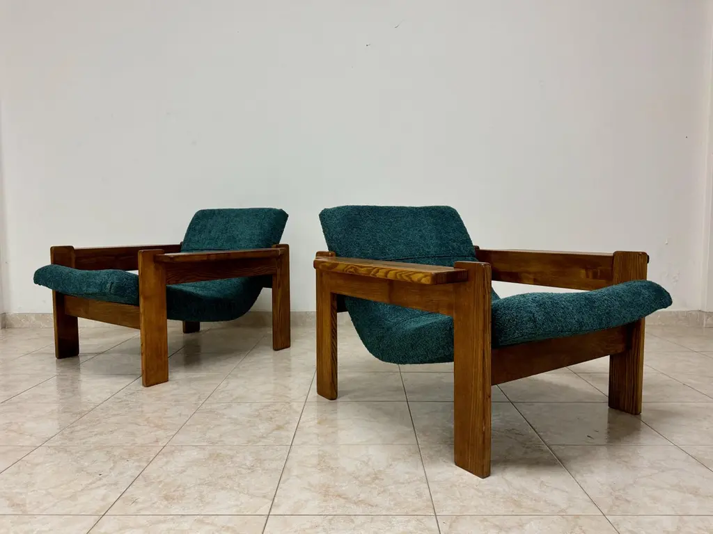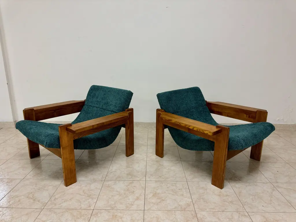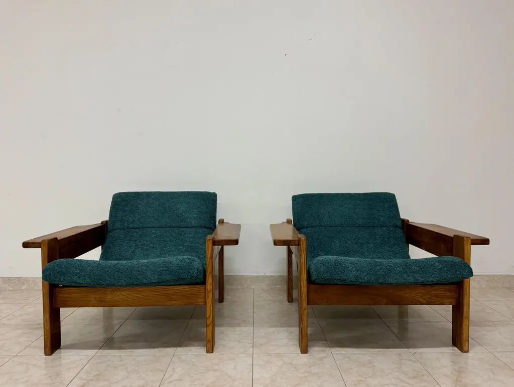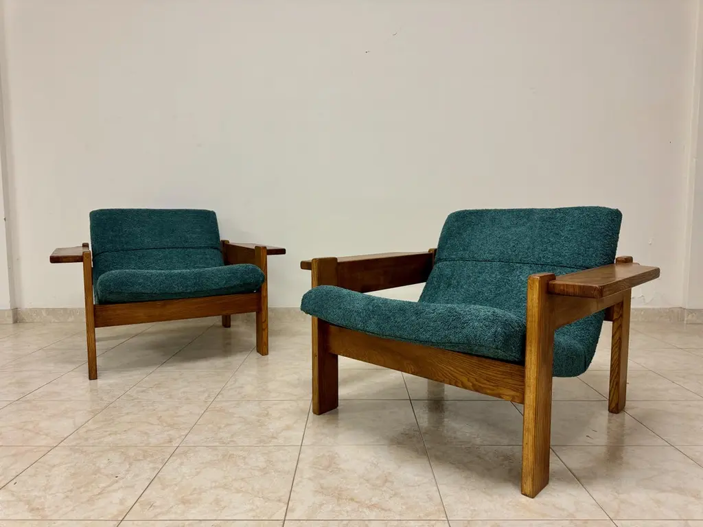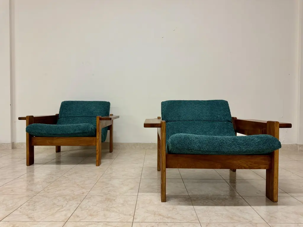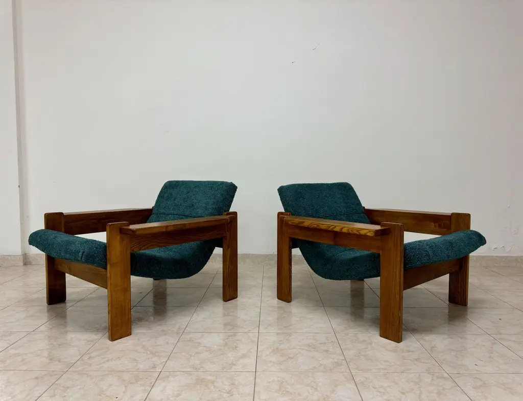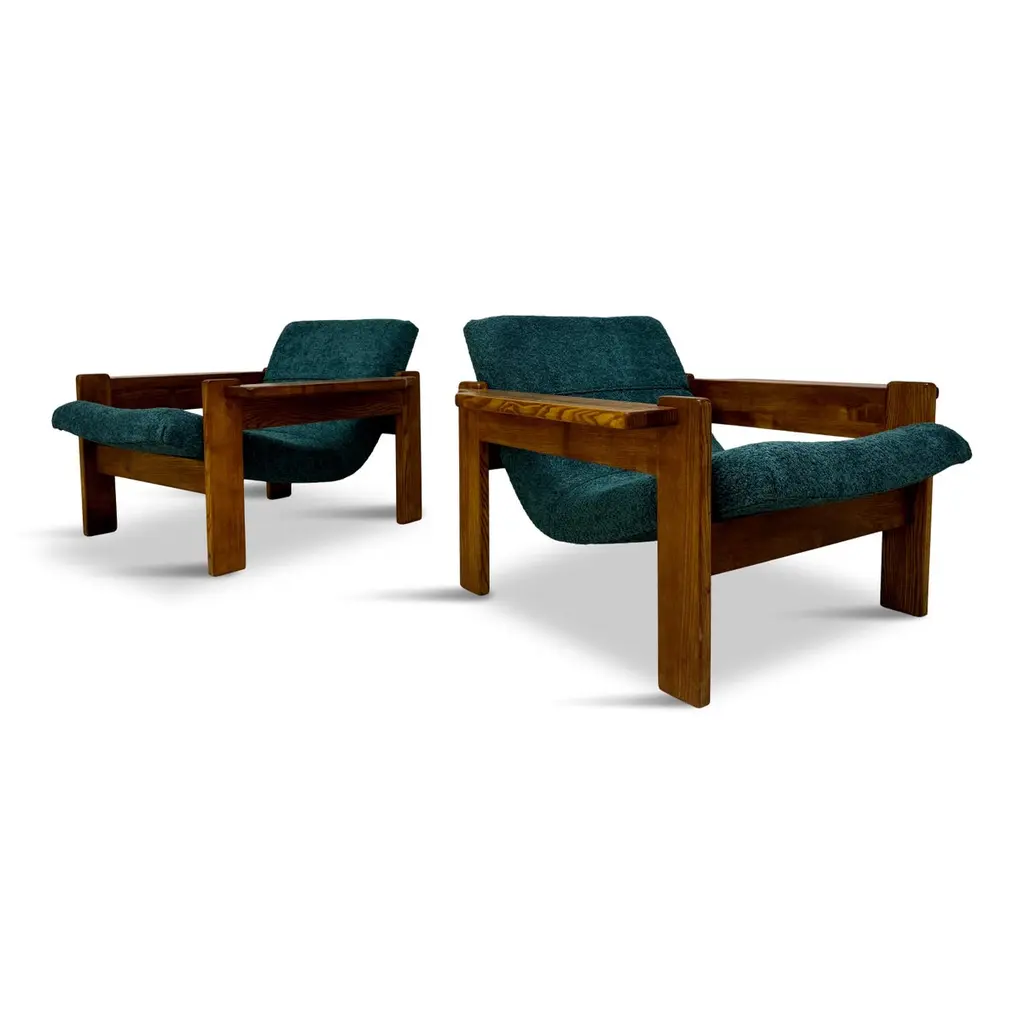 Pair of armchairsAsh framesMade in ItalyContemporarySeat height 42cmFabric options availableIf not in stock, will be made to orderThese contemporary Italian armchairs embody the essence of brutalist design, seamlessly merging robust construction with refined comfort. The armchairs feature a sturdy wooden frame with a rich, warm finish that highlights the natural grain of the wood, adding a touch of organic elegance to their bold structure. The wide, angular armrests and legs provide a solid foundation, emphasizing the chairs' architectural aesthetic.The seating area is generously padded and upholstered in a plush, deep teal fabric, offering a striking contrast to the wooden frame. The fabric's texture adds a layer of sophistication, while the deep hue brings a modern, vibrant touch to the overall design. The slightly reclined backrest and spacious seat ensure optimal comfort, making these armchairs perfect for relaxing or enjoying conversation in style.These armchairs are ideal for contemporary living spaces that appreciate the juxtaposition of strong, geometric lines with soft, inviting textiles. Their unique blend of brutalist elements and upholstery makes them a standout addition to any modern home.