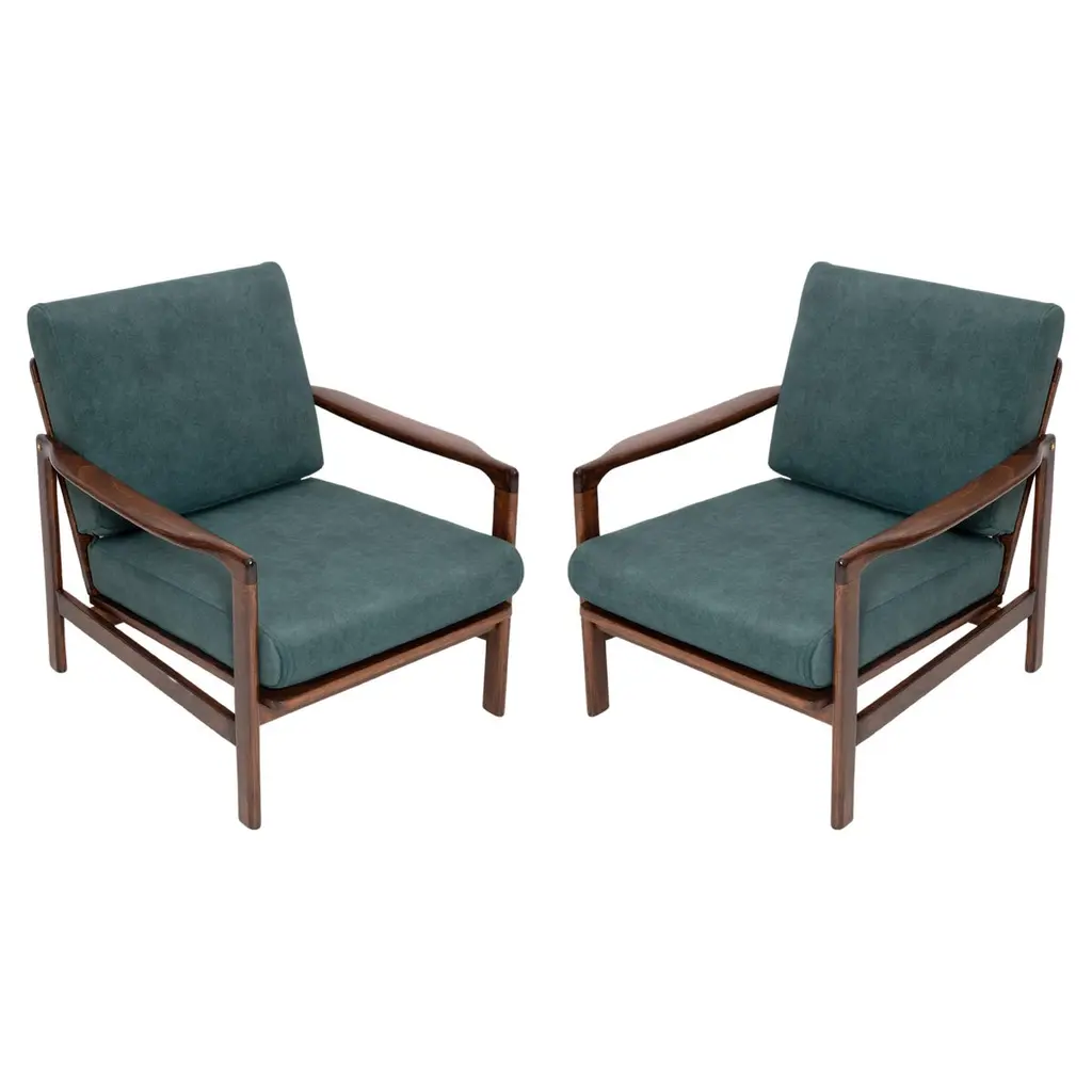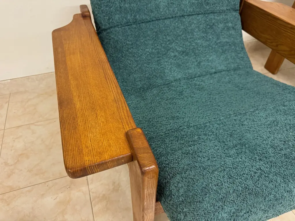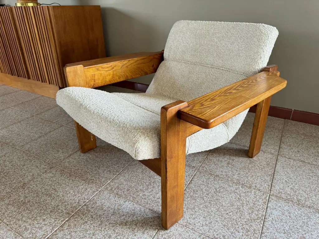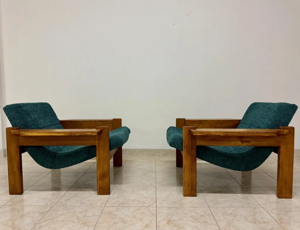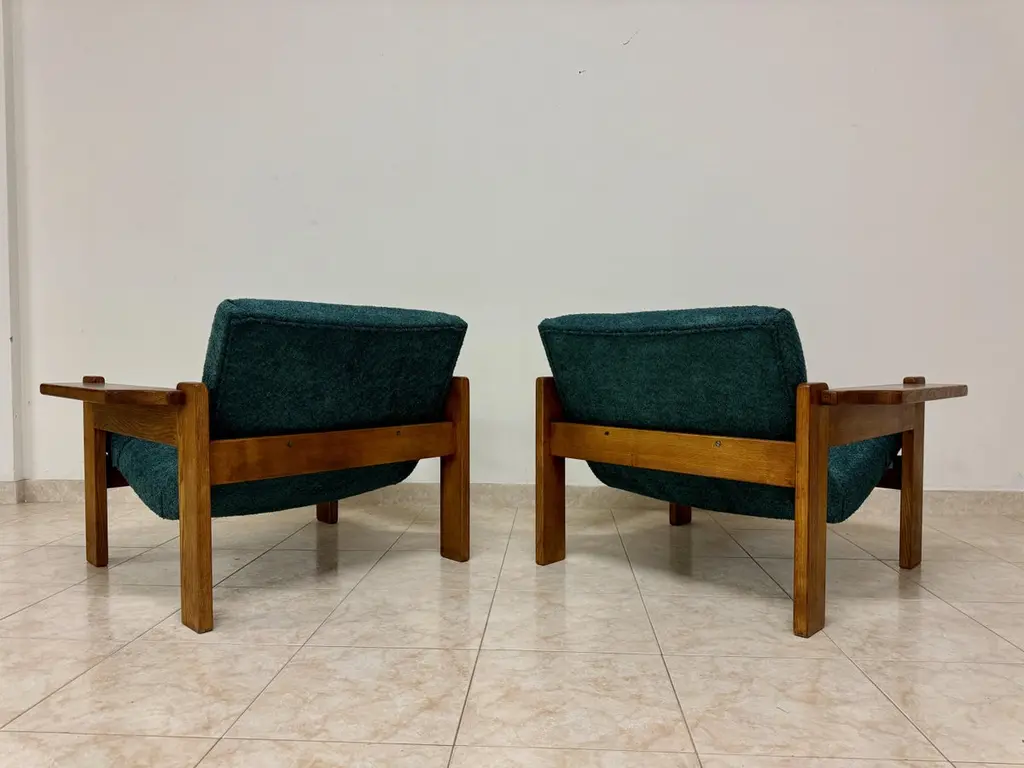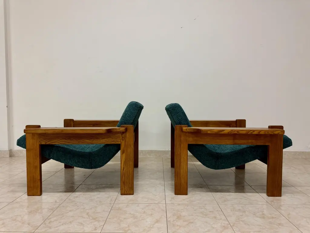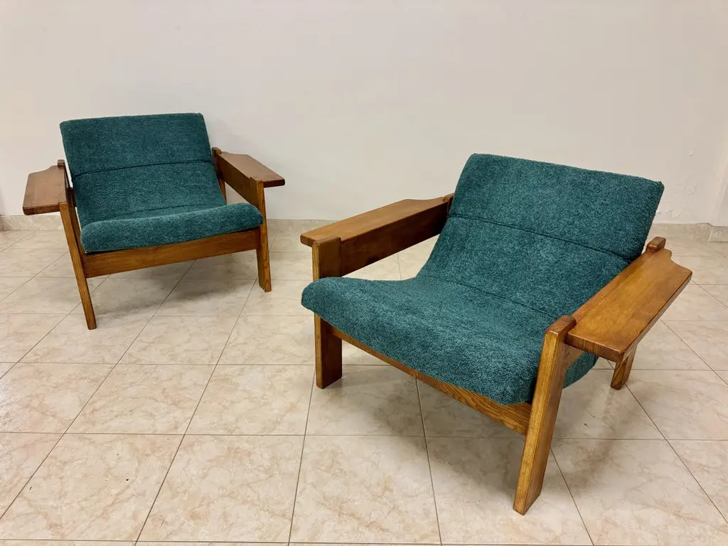 Pair of armchairsAsh framesMade in ItalyContemporarySeat height 42cmFabric options availableIf not in stock, will be made to orderThese contemporary Italian armchairs embody the essence of brutalist design, seamlessly merging robust construction with refined comfort. The armchairs feature a sturdy wooden frame with a rich, warm finish that highlights the natural grain of the wood, adding a touch of organic elegance to their bold structure. The wide, angular armrests and legs provide a solid foundation, emphasizing the chairs' architectural aesthetic.The seating area is generously padded and upholstered in a plush, deep teal fabric, offering a striking contrast to the wooden frame. The fabric's texture adds a layer of sophistication, while the deep hue brings a modern, vibrant touch to the overall design. The slightly reclined backrest and spacious seat ensure optimal comfort, making these armchairs perfect for relaxing or enjoying conversation in style.These armchairs are ideal for contemporary living spaces that appreciate the juxtaposition of strong, geometric lines with soft, inviting textiles. Their unique blend of brutalist elements and upholstery makes them a standout addition to any modern home.