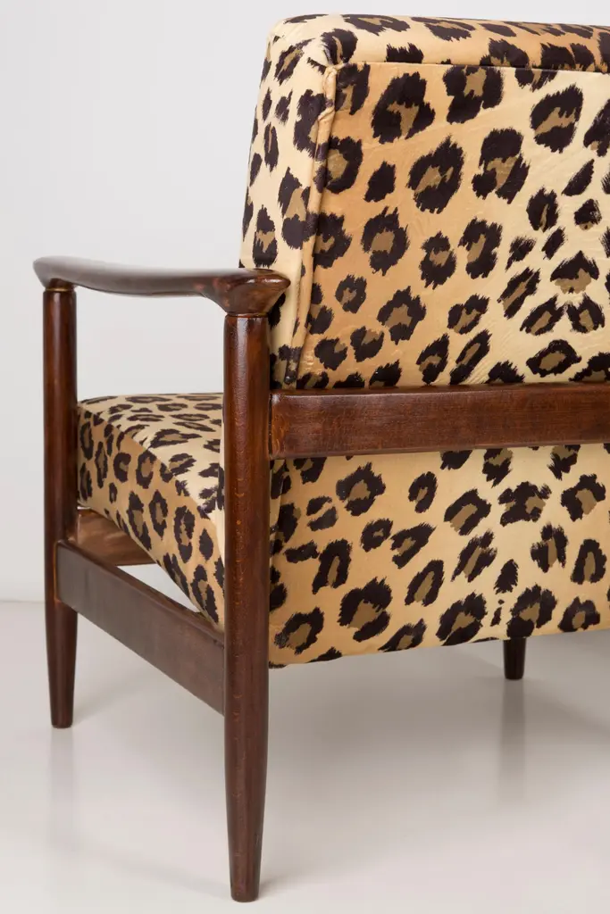 A pair of armchairs GFM-142, designed by Edmund Homa. The armchairs were made in the 1960s in the Gosciecinska furniture factory. They are made from solid beech wood. The GFM-142 armchair is regarded one of the best polish armchair design from the previous age. The armchairs have been thoroughly renovated. The tension belts have been changed, new upholstery foams, leopard velvet upholstery it's Italian fabric of the highest quality. If you want this set in another color - let us know.